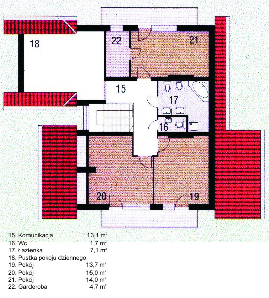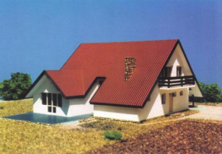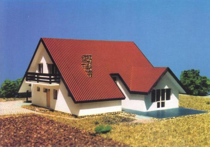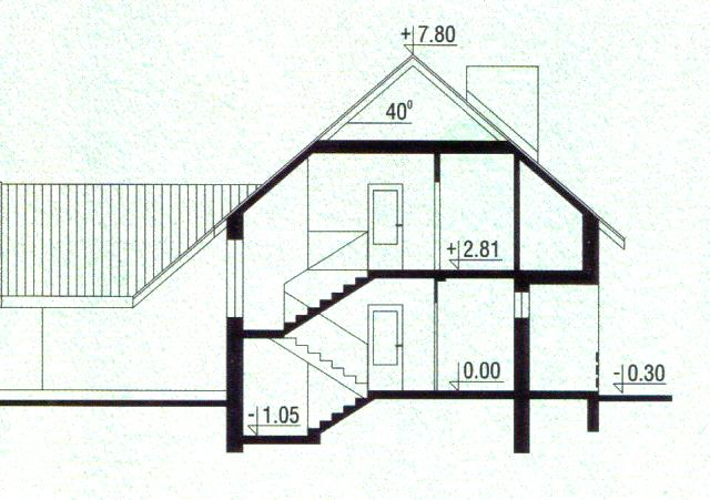 Budynek jednorodzinny parterowy z poddaszem mieszkalnym, niepodpiwniczony. 4 pokoje z kuchnią. Wiata pod przedłużoną połacią dachu. Na parterze część mieszkalna i pomieszczenia techniczno-gospodarcze (z oddzielnym wejściem) Możliwe częściowe podpiwniczenie budynku i zwiększenie programu o 2 pokojeŚciany zewnętrzne: gr. 38 cm z pustaków Porotherm 38 T Dryfi x; strop: stropy płyta żelbetowa monolityczna, alternatywnie Fert 40.; schody: żelbetowe; dach: dwuspadowy o kącie nachylenia 40 stopni, kryty dachówką ceramiczną lub blachodachówką