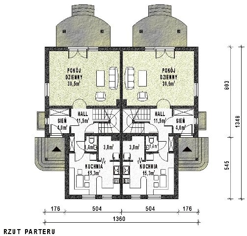 Budynek dwurodzinny bliźniak, parterowy, z poddaszem mieszkalnym, częściowo podpiwniczonyŚciany zewnętrzne: grubość 36,5 cm z bloczków YTONG; strop: żelbetowy; schody: drewniane; dach: wielospadowy o nachyleniu 40 stopini, więźba krokwiowo płatwiowa, kryty dachówką cementową