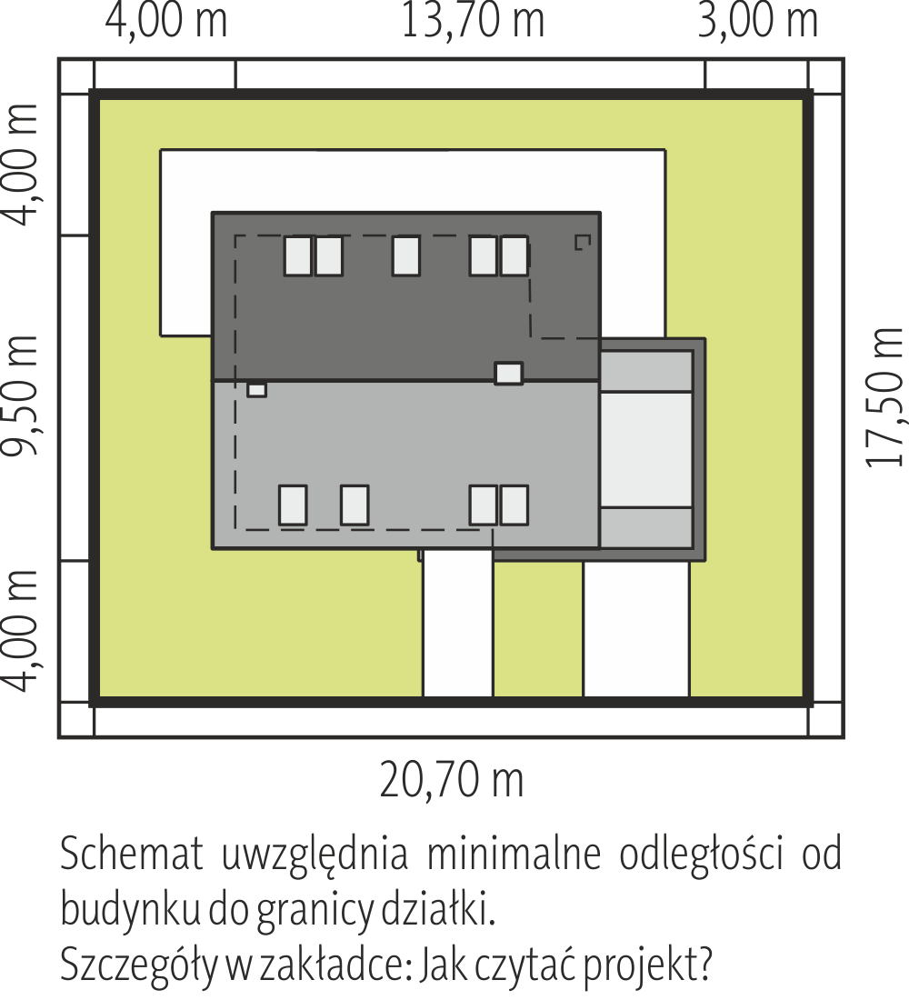 Jednorodzinny budynek mieszkalny, parterowy z użytkowym poddaszem. Na parterze przewidziano wyraźnie oddzielone części: dzienną, nocną oraz gospodarczą. Przestronne poddasze, na którym zaproponowano trzy sypialnie, może być aranżowane w dowolny sposób. W domu zaprojektowano dwustanowiskowy garaż oraz kotłownię na każdy rodzaj paliwa.Ściany: 2-warstwowe - pustak ceramiczny + styropian Termo Organika, Stropy: żelbetowe, wylewane, Dach: dachówka, kąt nachylenia 30°