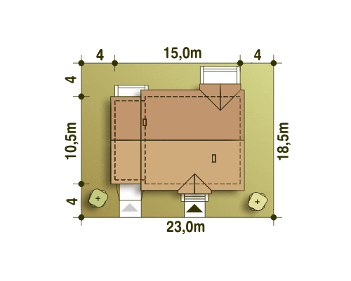 Wolno stojący domek z użytkowym poddaszem i całkowitym podpiwniczeniem. Niewielki, prosty w budowie dom dla 3 – 4 osób. Istnieje wersja domu letniskowego.Ściany: parteru: w systemie YTONG 36,5 cm, poddasza: szkielet drewniany, Stropy: nad piwnica żelbetowe, nad parterem drewniane, Dach: blachodachówka, kąt nachylenia 45°
