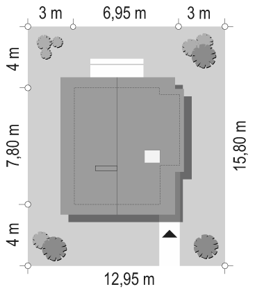 Aksamit 7 to projekt domu parterowego, podpiwniczonego z wjazdem od południa. Układ funkcjonalny zaprojektowano tak, aby wyraźnie podzielić go na przestronną strefę dzienną i przytulną część prywatną. Część dzienna to przestronny salon z kominkiem, jadalnia otwarta na ogród dużymi przeszkleniami oraz funkcjonalna kuchnia. Strefa nocna to cztery sypialnie, ogólnodostępna łazienka i wc. Jedna z sypialni zaadaptowana została na apartament gospodarzy, który posiada prywatną łazienką oraz garderobą. W projekcie przewidziano również część gospodarczą ulokowaną w piwnicy oraz dwustanowiskowy garaż. Część gospodarczą tworzą kotłownia oraz trzy pomieszczenia gospodarcze.Ściany: 2-warstwowe - pustak ceramiczny + styropian Termo Organika, Stropy: System Stropowy TECHNOBETON lub z wiązarów dachowych firmy MITEK, Dach: dachówka ceramiczna, kąt nachylenia 30°