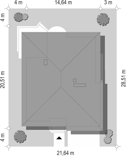 Jednorodzinny budynek mieszkalny, parterowy, niepodpiwniczony, przeznaczony dla 4-osobowej rodziny. W części dziennej przewidziano salon oraz kuchnię z jadalnią, w nocnej trzy sypialnie z łazienką, w gospodarczej garaż, kotłownię, wc oraz garderobę. Budynek został utrzymany w nowoczesnej stylistyce.Ściany: 2-warstwowe - pustak ceramiczny + styropian Termo Organika, Stropy: żelbetowe, wylewane, Dach: dachówka, kąt nachylenia 25°