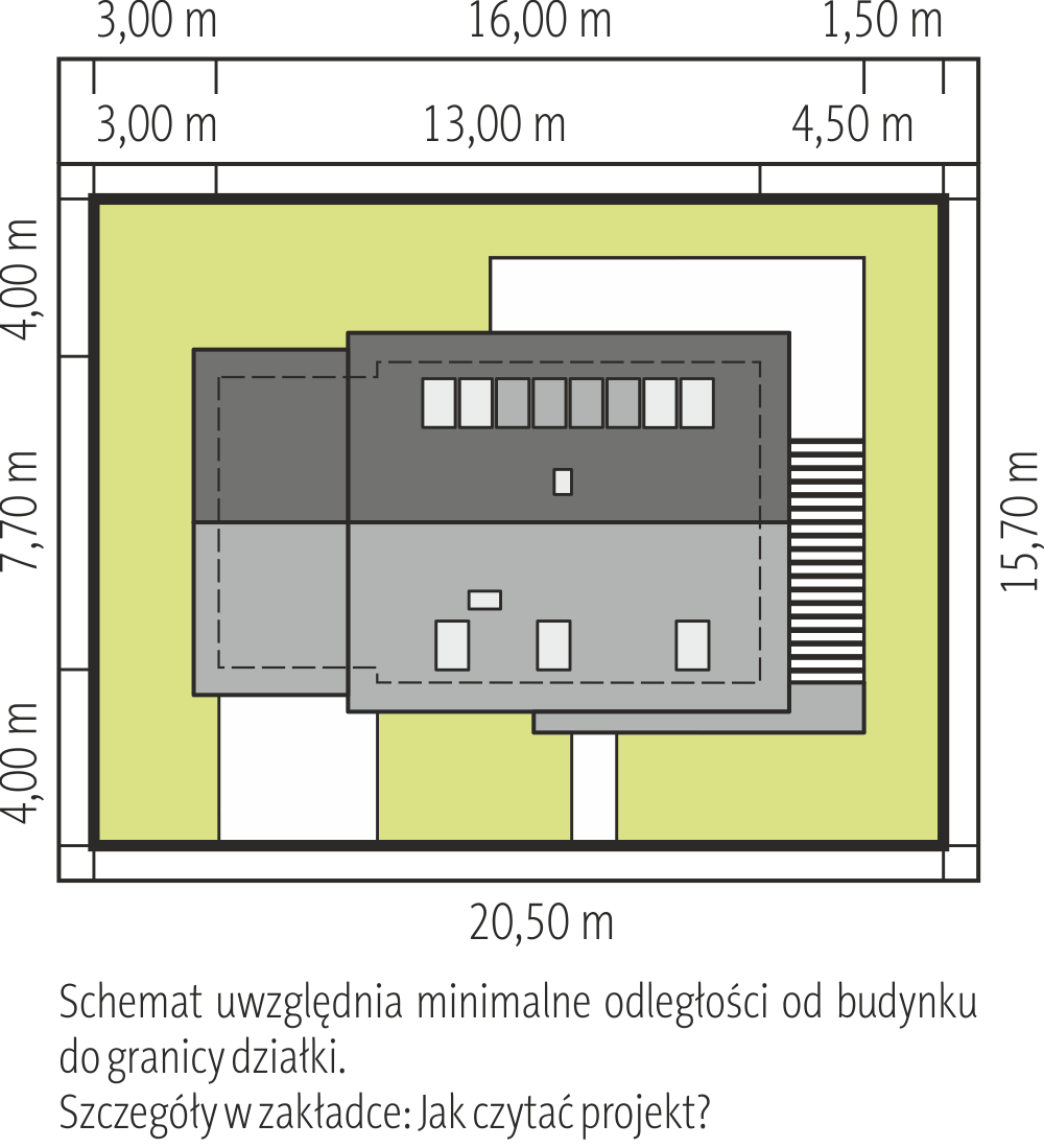 Jednorodzinny dom parterowy, niepodpiwniczony, z garażem w bryle budynku. W części centralnej od strony wejścia zaprojektowano duży pokój dzienny połączony z kuchnią i aneksem jadalnym. Dom posiada trzy sypialnie, w tym jedną z własną łazienką. Przed wejściem zlokalizowano obszerny, częściowo zadaszony taras.Ściany: 2-warstwowe - pustak ceramiczny + styropian, Stropy: na belkach drewnianych, Dach: dachówka, kąt nachylenia 30°