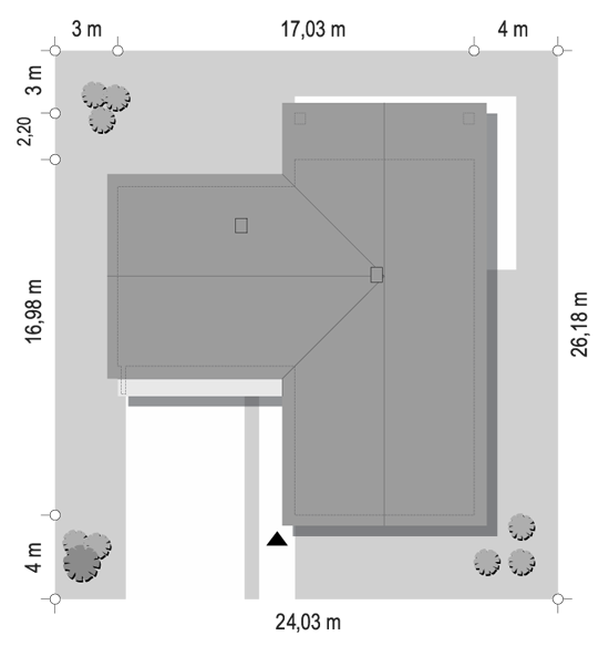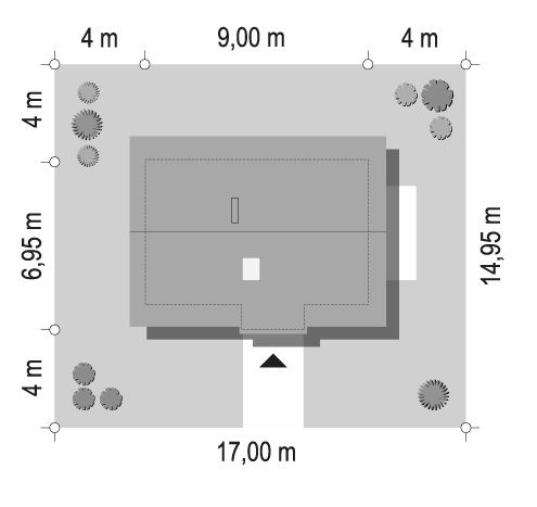 Dom jednorodzinny, parterowy, niepodpiwniczony z garażem jednostanowiskowym, przeznaczony dla 4-osobowej rodziny. Wnętrze z wyraźnym podziałem na strefy: dzienną z pokojem dziennym, kuchnią i jadalnią, oraz nocną, gdzie zaprojektowano trzy sypialnie, łazienkę i garderobę.Ściany: 2-warstwowe - POROTHERM 38 cm + styropian, Stropy: gęstożebrowe TERIVA, Dach: dachówka ceramiczna, kąt nachylenia 25°