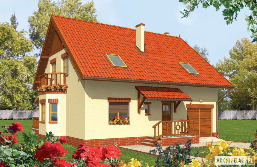 Charakterystyka: Dom parterowy z poddaszem użytkowym, niepodpiwniczony, z garażem jednostanowiskowym Przeznaczenie: Dom dla 4-5-osobowej rodzinyTechnologia i konstrukcja: Ściany zewnętrzne: murowane, dwuwarstwowe SILKA 18cm, ocieplenie styropian Termo Organika 20 cm Ściany wewnętrzne: nośne i działowe murowane SILKA 18cm i 12 cm Strop: międzypiętrowy gęstożebrowy Teriva Dach: konstrukcja drewniana, ocieplenie wełna mineralna, dachówka ceramiczna firmy Röben Inne: schody wewnętrzne drewnianeRozwiązania instalacyjne: Ogrzewanie: kocioł gazowy kondensacyjny firmy Viessmann, rozprowadzenie ciepła: grzejniki firmy Purmo Wentylacja: grawitacyjna OZE: kolektory słoneczneWykończenie: Elewacje: tynk cienkowarstwowy mineralny w kolorze piaskowym z palety firmy Termo Organika, okładzina drewniana oraz klinkierowe płytki elewacyjne firmy Röben Stolarka: drewniana, PVC lub aluminiowa, drzwi wejściowe i brama garażowa firmy Hörmann Okna połaciowe: rozwiązania technologiczne i okna do dachów płaskich firmy FAKRO Otoczenie: kostka betonowa i płyty tarasowe firmy Libet, system tarasowy ProDeck - deska kompozytowa Terra w kolorze orzechWersje - zapytaj o dostępność: -Aga II G1 - z inną aranżacją pomieszczeń i garażem jednostanowiskowym - odbicia lustrzane do wszystkich wersjiIstnieje techniczna możliwość: - podpiwniczenia budynku
