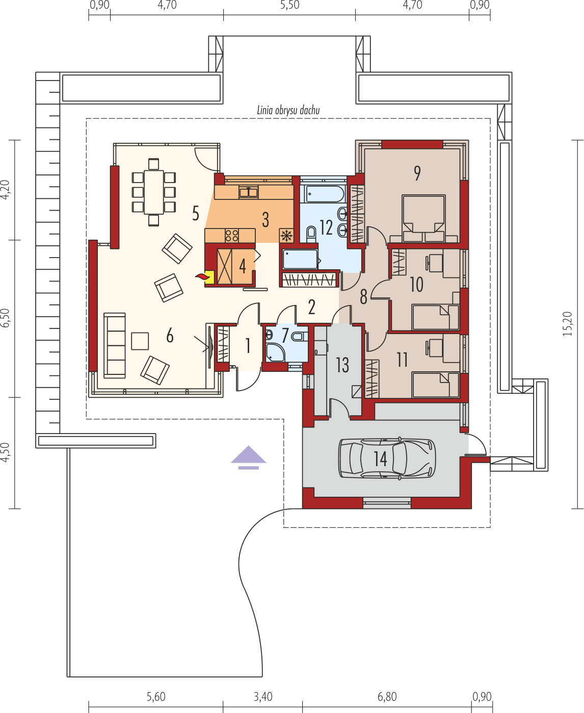 Charakterystyka: Dom parterowy, niepodpiwniczony, z garażem jednostanowiskowym Przeznaczenie: Dom dla 3-4 osobowej rodzinyTechnologia i konstrukcja: Ściany zewnętrzne: murowane, dwuwarstwowe, beton komórkowy 24 cm, ocieplenie styropian Termo Organika 12 cmŚciany wewnętrzne: nośne i działowe murowane, bloczki z cegły Silka 24 cm i 12 cmStrop: gęstożebrowy Teriva, ocieplenie wełna mineralna Isover 30 cm Dach: konstrukcja drewniana, dachówka ceramiczna lub cementowa Rozwiązania instalacyjne:Ogrzewanie: kocioł gazowy kondensacyjny firmy Viessmann, rozprowadzenie ciepła: grzejniki firmy PurmoWentylacja: grawitacyjna OZE: kolektory słoneczne firmy Viessmann Dodatkowo: stacja uzdatniania wody firmy ViessmannWykończenie: Elewacje: tynk cienkowarstwowy mineralny z palety firmy Termo Organika oraz okładzina drewniana i kamienna Stolarka: drewniana, PVC lub aluminiowa, drzwi wejściowe i brama garażowa firmy Hörmann Otoczenie: system tarasowy ProDeck - deska kompozytowa Terra w kolorze złoty dąb.Wersje - zapytaj o dostępność: - Alberta G2 – z garażem dwustanowiskowym - odbicie lustrzane do każdej wersji Istnieje techniczna możliwość: - zmiany kąta nachylenia dachu do 30° - adaptacji poddasza na strych