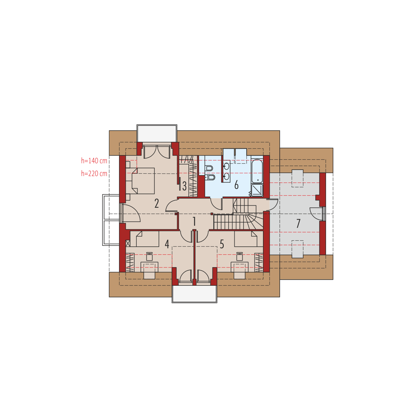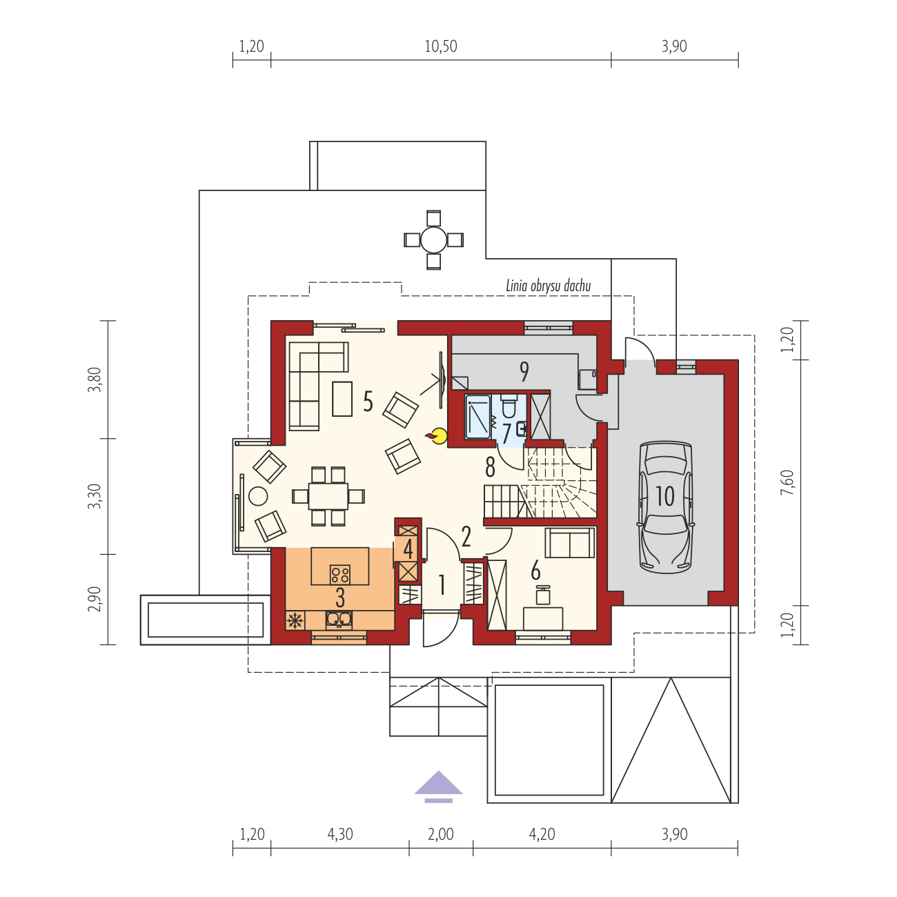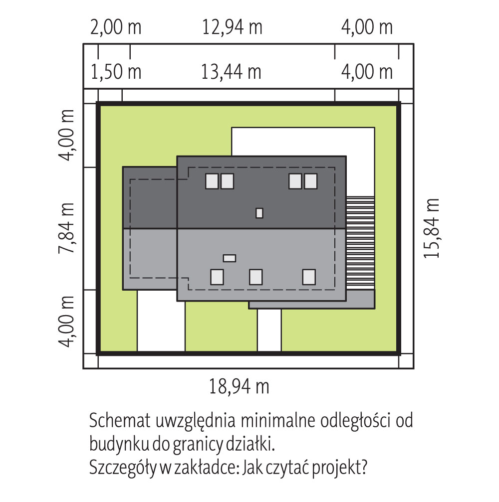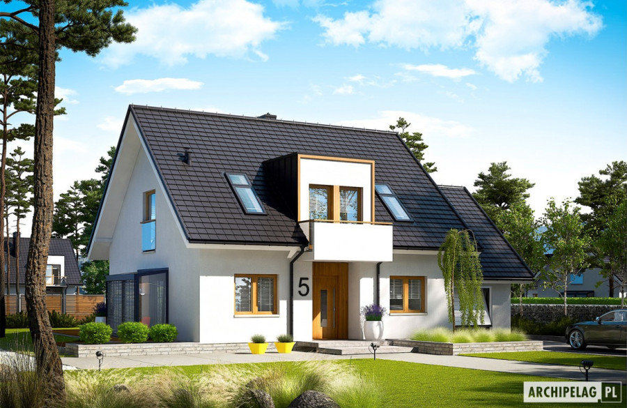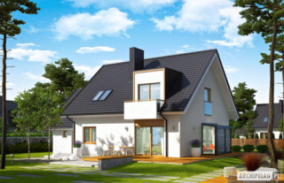 Charakterystyka: Dom parterowy z poddaszem użytkowym, niepodpiwniczony, z garażem jednostanowiskowym Przeznaczenie: Dom dla 3-5-osobowej rodziny Technologia i konstrukcja: Ściany zewnętrzne: murowane, dwuwarstwowe, beton komórkowy firmy Solbet 24 cm, ocieplenie styropian Termo Organika 20 cm Ściany wewnętrzne: nośne i działowe murowane, beton komórkowy firmy Solbet 24 cm i 12 cm Strop: międzypiętrowy gęstożebrowy Teriva Dach: konstrukcja drewniana, ocieplenie wełna mineralna 30 cm, dachówka ceramiczna płaska Bergamo firmy Röben Inne: schody wewnętrzne drewniane Rozwiązania instalacyjne: Ogrzewanie: kocioł gazowy kondensacyjny, rozprowadzenie ciepła: grzejniki Wentylacja: grawitacyjna Wykończenie: Elewacje: tynk cienkowarstwowy mineralny w kolorze TO-PA001 z palety firmy Termo Organika, okładzina drewniana Stolarka: drewniana, PVC lub aluminiowa, rolety zewnętrzne w systemie CleverBox firmy BeClever, drzwi wejściowe i brama garażowa firmy HörmannOtoczenie: płyty tarasowe firmy Libet, system tarasowy ProDeck - deska kompozytowa Terra w kolorze orzech Okna połaciowe: rozwiązania technologiczne i wyłaz dachowy firmy VELUX. Pobierz ekspercki poradnik VELUX i dowiedz się jak wybrać okna dachowe Wersje - zapytaj o dostępność: - April – bez garażu i z garażem dwustanowiskowym - odbicie lustrzane Istnieje techniczne możliwość: - podpiwniczenia budynku - wykonania zabudowy bliźniaczej - wykonania budynku w technologii szkieletowej