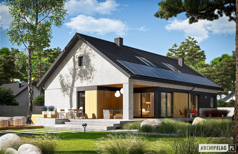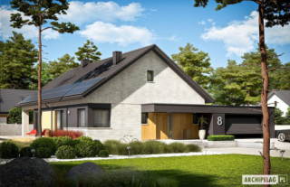 Więźba dachowa w systemie prefabrykacji drewnianej w systemie płytki kolczastej MITEK.Charakterystyka: Dom parterowy z poddaszem użytkowym, niepodpiwniczony, z garażem dwustanowiskowym Przeznaczenie: Dom dla 3-4-osobowej rodziny Technologia i konstrukcja: Ściany zewnętrzne: murowane, dwuwarstwowe, pustaki ceramiczne 24 cm, ocieplenie styropian Termo Organika 20 cm Ściany wewnętrzne: nośne - pustaki ceramiczne 24 cm, działowe pustaki ceramiczne 11,5 cm Strop i stropodach nad garażem: strop gęstożebrowy Teriva i pas dolny wiązara stanowi konstrukcję, nad garażem stropodach pełny Dach: więźba dachowa w systemie prefabrykacji drewnianej, ocieplenie wełna mineralna Isover 30 cm, dachówka ceramiczna płaska w kolorze grafitowymRozwiązania instalacyjne: Ogrzewanie: kocioł gazowy kondensacyjny Viessmann, rozprowadzenie ciepła: grzejniki PurmoWentylacja: grawitacyjnaWszystkie wersje domów dostępne w dwóch standardach/wariantach instalacyjnych: - ENERGO: kocioł gazowy kondensacyjny, grzejniki, wentylacja grawitacyjna, OZE: kolektory słoneczne - ENERGO PLUS: pompa ciepła, ogrzewanie podłogowe, wentylacja mechaniczna, OZE: kolektory słoneczne lub panele fotowoltaiczneWykończenie: Elewacje: tynk cienkowarstwowy mineralny w kolorze TO-GY011 z palety firmy Termo Organika, okładzina drewniana, płytki ceramiczne elewacyjne w kolorze srebrno-szarym Stolarka: drewniana, PVC lub aluminiowa, rolety zewnętrzne w systemie CleverBox firmy BeClever, okna połaciowe firmy Velux, drzwi wejściowe i brama garażowa firmy HörmannOtoczenie: płyty tarasowe firmy Libet, system tarasowy ProDeck - deska kompozytowa Terra w kolorze orzechWersje - zapytaj o dostępność: - Daniel – dom parterowy, podobny układ funkcjonalny, tradycyjna więźba dachowa - Daniel G1 (30 stopni) - dach o kącie nachylenia 30°, tradycyjna więźba dachowa, garaż jednostanowiskowy - Daniel II – dom parterowy, podobny układ funkcjonalny, tradycyjna więźba dachowa - Daniel III - dom parterowy, wysoki salon z dodatkowym doświetleniem oknami dachowymi, tradycyjna więźba dachowa - Daniel IV – taki sam układ funkcjonalny - Daniel V ENERGO PLUS - dom z poddaszem użytkowym, prefabrykowane wiązary dachowe, dach o kącie nachylenia 42°, instalacje energooszczędne: pompa ciepła, ogrzewanie podłogowe, wentylacja mechaniczna, system solarny - Daniel VI G2 – dom z poddaszem użytkowym, podobny układ funkcji, tradycyjna więźba dachowa, dach bez okapów o kącie nachylenia 42° Różnice i podobieństwa wersji: - każda wersja z inną propozycją wykończenia elewacji - różne wersje garaży do każdego domu: bez garażu, z garażem jedno- i dwustanowiskowym - odbicie lustrzane do każdej wersjiIstnieje techniczna możliwość: - podpiwniczenia budynku - wykonania budynku w technologii szkieletowej