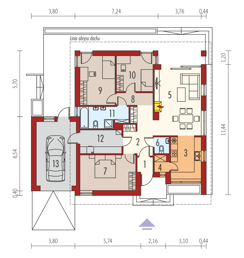 W projekcie zastosowano systemy zabudowy ścian działowych i sufitów podwieszanych Rigips. Więźba dachowa w systemie dachu prefabrykowanego w systemie płytki kolczastej MITEK.Charakterystyka: Dom parterowy, niepodpiwniczony, z garażem jednostanowiskowymPrzeznaczenie: Dom dla 2-4-osobowej rodziny Technologia i konstrukcja:Ściany zewnętrzne: murowane, dwuwarstwowe, beton komórkowy firmy H+H, ocieplenie styropian Termo Organika 20 cmŚciany wewnętrzne: nośne i działowe murowane, beton komórkowy firmy H+H 24 cm i 12 cmStrop i stropodach nad garażem: gęstożebrowy Teriva, ocieplenie stropu wełna mineralna Isover 30 cm, stropodach pełnyDach: wiązary dachowe prefabrykowane, dachówka ceramiczna płaska Bergamo firmy Röben Rozwiązania instalacyjne:Ogrzewanie: kocioł gazowy kondensacyjny firmy Viessmann, rozprowadzenie ciepła: grzejniki firmy PurmoWentylacja: grawitacyjna Wykończenie:Elewacje: tynk cienkowarstwowy mineralny w kolorze białym TO-PA001 z palety firmy Termo Organika, na garażu cienkowarstwowy mineralny w kolorze ciemno-szarym TO-GY011 z palety firmy Termo Organika, płytki włóknisto-cementowe lub z konglomeratu kamiennego układane pasamiStolarka: drewniana, PVC lub aluminiowa, drzwi wejściowe i brama garażowa firmy HörmannOtoczenie: kostka betonowa i płyty tarasowe firmy Libet, system tarasowy ProDeck - deska kompozytowa Terra w kolorze orzech Wersje - zapytaj o dostępność:- Rafael IV – wariant bez garażu- Rafael IV G1 (30 st) – dach o kącie nachylenia 30°, garaż jednostanowiskowyWersje z tradycyjną więźbą dachową:- Rafael - podobny układ funkcji, 2 sypialnie, mniejsza powierzchnia użytkowa, dach o kącie nachylenia 28° lub 25°, bez garażu lub z garażem jednostanowiskowym- Rafael G1 (bliźniak) – wariant w zabudowie bliźniaczej - Rafael II – podobny układ funkcji, jadalnia z wykuszem, bez garażu i z garażem jednostanowiskowym - Rafael III – podobny układ funkcji, jadalnia bez wykusza, bez garażu i z garażem jednostanowiskowym - Rafael V – dom ze ścianami trójwarstwowymi, podobny układ funkcji, 2 sypialnie, mniejsza powierzchnia użytkowa, dach o kącie nachylenia 28°, bez garażu i z garażem jednostanowiskowym - Rafael VI ECONOMIC – podobny układ funkcji, 2 sypialnie, mniejsza powierzchnia użytkowa, standard ociepleń ENERGO, bez garażu i z garażem jednostanowiskowym- Rafael G1 (30 st), Rafael II (30 st), Rafael III (30 st), Rafael III G1 (30 st), Rafael VI ECONOMIC (30 st) – warianty z dachami o kącie nachylenia 30° - każda wersja z inną propozycją wykończenia elewacji - odbicie lustrzane do każdej wersjiIstnieje techniczne możliwość:- podpiwniczenia budynku- zmiany kąta nachylenia dachu do 30º oraz adaptacji poddasza na strych- wykonania budynku w technologii szkieletowej