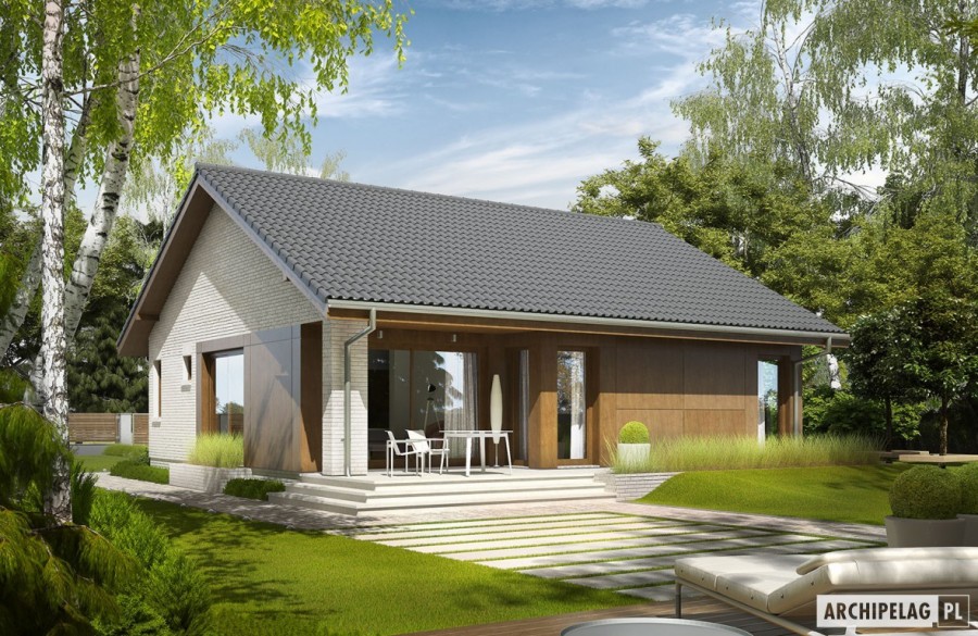Ściany zewnętrzne trójwarstwowe wykonano z energooszczędnych pustaków ceramicznych. Charakterystyka: Dom parterowy, niepodpiwniczony Przeznaczenie: Dom dla 2-3-osobowej rodzinyTechnologia i konstrukcja: Ściany zewnętrzne: murowane, trójwarstwowe, pustaki ceramiczne 24 cm, ocieplenie 10 cm, warstwa licowa z cegły klinkierowej 11,5 cm firmy Röben Ściany wewnętrzne: murowane, pustaki ceramiczne 24 cm, ścianki działowe pustaki ceramiczne 11,5 cm Strop: strop gęstożebrowy Teriva Dach: konstrukcja drewniana, ocieplenie wełna mineralna 30 cm, dachówka ceramiczna Piemont Titan firmy Röben, więźba dachowa dostępna również w systemie prefabrykacji drewnianejRozwiązania instalacyjne: Ogrzewanie: kocioł gazowy, rozprowadzenie ciepła: grzejniki Wentylacja: grawitacyjnaOZE: kolektory słoneczneWykończenie: Elewacja: cegły licowe klinkierowe firmy Röben 11,5 cm, typ Malmo perłowobiała, elementy nadprożowe i parapety ceglane firmy Röben Stolarka: drewniana, PCV lub aluminiowa, drzwi wejściowe firmy HörmannWersje - zapytaj o dostępność:- Rafael - podobny układ funkcji, 2 sypialnie, mniejsza powierzchnia użytkowa, ściany zewnętrzne dwuwarstwowe, bez garażu - Rafael G1 - podobny układ funkcji, 2 sypialnie, mniejsza powierzchnia użytkowa, dach o kącie nachylenia 25°, ściany zewnętrzne dwuwarstwowe, z garażem jednostanowiskowym- Rafael G1 (bliźniak) – wariant w zabudowie bliźniaczej - Rafael II – podobny układ funkcji, jadalnia z wykuszem, ściany zewnętrzne dwuwarstwowe, bez garażu i z garażem jednostanowiskowym - Rafael III – podobny układ funkcji, jadalnia bez wykusza z wersji II, ściany zewnętrzne dwuwarstwowe, bez garażu i z garażem jednostanowiskowym - Rafael IV – dom z rozwiązaniami firmy Rigips i wiązarami prefabrykowanymi, podobny układ funkcji, standard ociepleń ENERGO, ściany zewnętrzne dwuwarstwowe, bez garażu i z garażem jednostanowiskowym - Rafael V G1 – wariant z garażem jednostanowiskowym - Rafael VI ECONOMIC – podobny układ funkcji, 2 sypialnie, mniejsza powierzchnia użytkowa, standard ociepleń ENERGO, bez garażu i z garażem jednostanowiskowym- Rafael G1 (30 st), Rafael II (30 st), Rafael III (30 st), Rafael III G1 (30 st), Rafael IV G1 (30 st), Rafael VI ECONOMIC (30 st) – warianty z dachami o kącie nachylenia 30° - każda wersja z inną propozycją wykończenia elewacji - odbicie lustrzane do każdej wersjiIstnieje techniczna możliwość: - podpiwniczenia - wykonania budynku w technologii szkieletowej - zmiany kąta nachylenia dachu do 30° oraz adaptacji poddasza na strychAtuty projektu okiem architekta: - Doskonałe parametry cieplne dzięki zastosowaniu ścian trójwarstwowych w energooszczędnej technologii - Kompaktowe i ergonomiczne wnętrze z czytelnym podziałem na strefę dzienna i nocną - Dwie sypialnie z wyjściem na taras - Funkcjonalne szafy wnękowe - Kuchnia z praktyczną spiżarnią - Duże przeszklenia w salonie oraz jadalni z widokiem na ogród - Zacieniony taras - Nieszablonowa elewacja - Zadaszona strefa wejściowa – ochrona przed deszczem i śniegiem - Prosta forma i dwuspadowy dach – ekonomiczna realizacja - Duże pomieszczenie kotłowni pozwala na zastosowanie dowolnego źródła ogrzewania