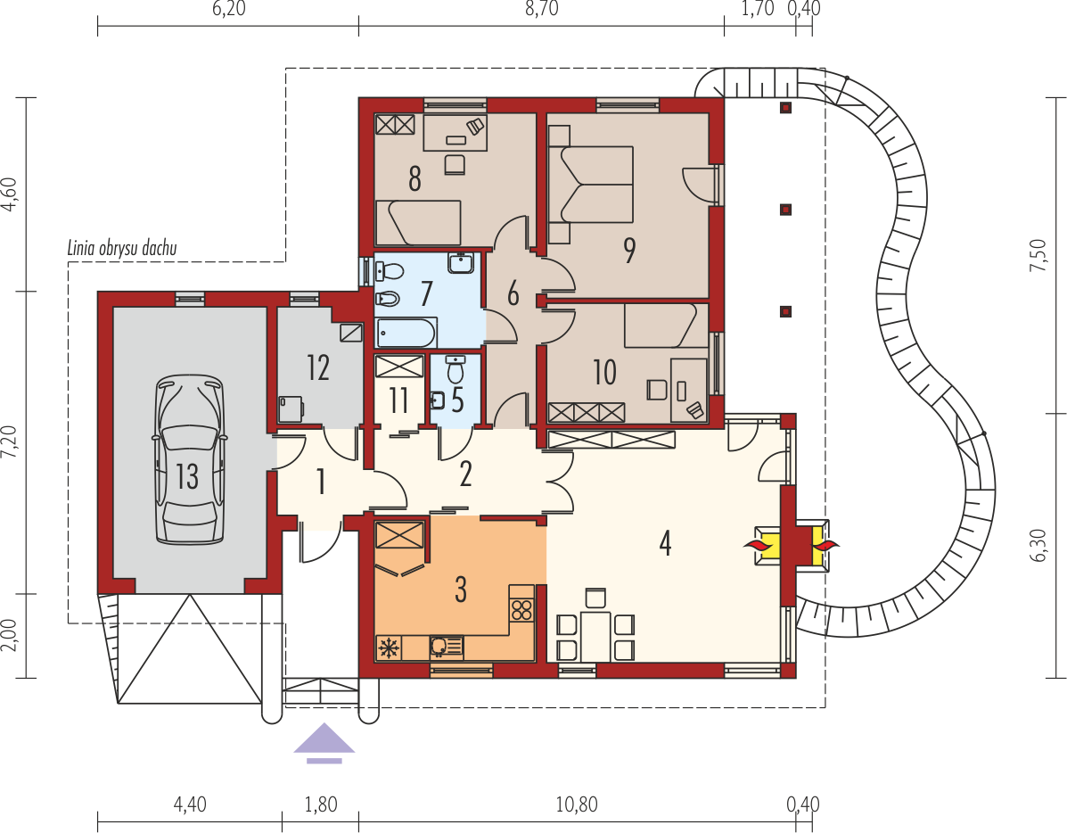 Charakterystyka: Dom parterowy, niepodpiwniczony, z garażem jednostanowiskowym Przeznaczenie: Dom dla 3-4 osobowej rodziny Technologia i konstrukcja: Ściany zewnętrzne: murowane Strop: gęstożebrowy Dach: konstrukcja drewniana, dachówka cementowaRozwiązania instalacyjne: Ogrzewanie: kocioł gazowy, rozprowadzenie ciepła: grzejniki Wentylacja: grawitacyjna Wykończenie: Elewacje: tynk mineralny, okładzina drewniana Stolarka: drewniana lub PCVWersje - zapytaj o dostępność: - Romina G2 – wersja z garażem dwustanowiskowym - odbicie lustrzane