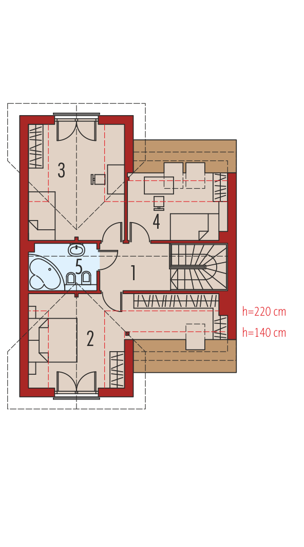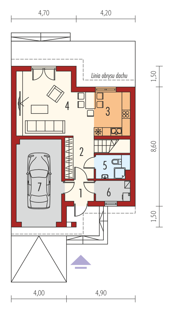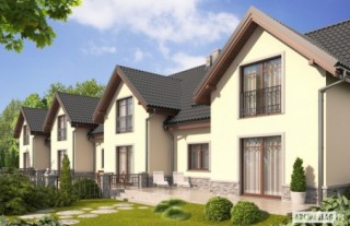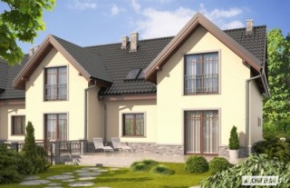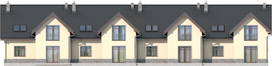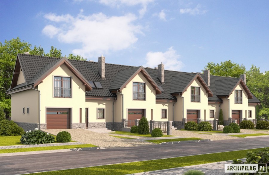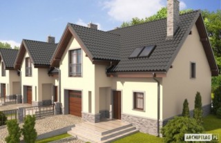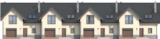 Przedstawiony rzut jest środkowym segmentem zabudowy szeregowej. Charakterystyka: dom jednorodzinny w zabudowie szeregowej, parterowy z poddaszem użytkowym, niepodpiwniczony, z garażem jednostanowiskowymPrzeznaczenie: Dom dla 2-4-osobowej rodziny Technologia i konstrukcja:Ściany zewnętrzne: murowane, dwuwarstwowe, cegła wapienno-piaskowa Silka 24 cm, ocieplenie wełna mineralna 12 cmŚciany wewnętrzne: nośne i działowe murowane, cegła wapienno-piaskowa Silka 24 cm i 12 cmStrop: międzypiętrowy gęstożebrowy TerivaDach: konstrukcja drewniana, ocieplenie wełna mineralna 30 cm, dachówka ceramiczna firmy RöbenInne: schody wewnętrzne drewniane Rozwiązania instalacyjne:Ogrzewanie: kocioł gazowy kondensacyjny, rozprowadzenie ciepła: grzejnikiWentylacja: grawitacyjna Wykończenie:Elewacje: tynk cienkowarstwowy mineralny, na cokole okładzina z płytek klinkierowych lub cegła elewacyjna klinkierowa firmy RöbenStolarka: drewniana, PVC lub aluminiowaOkna połaciowe: rozwiązania technologiczne i wyłaz dachowy firmy VELUXOtoczenie: kostka betonowa i płyty tarasowe firmy Libet Wersje - zapytaj o dostępność:- Simba II – segment lewy- Simba III – segment prawy- odbicie lustrzane do każdej wersji Istnieje techniczna możliwość:- podpiwniczenia budynku- wykonania budynku w technologii szkieletowej