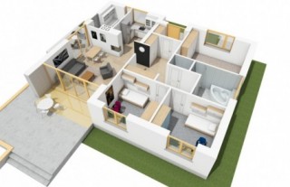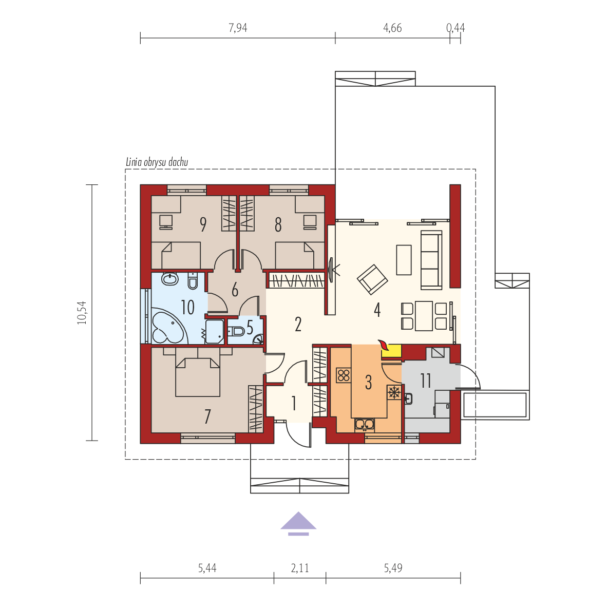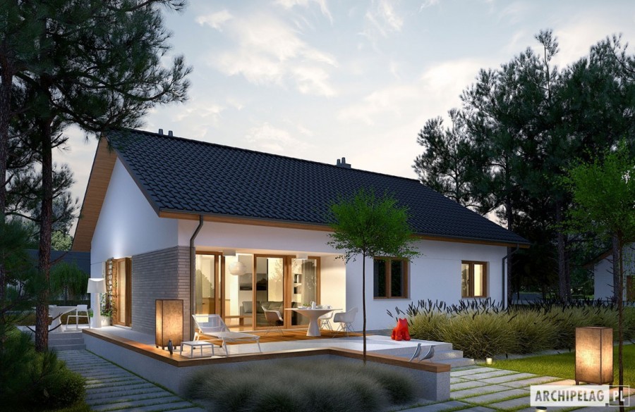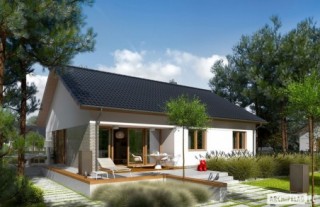 W projekcie zastosowano systemy zabudowy poddaszy, ścian działowych i sufitów podwieszonych Rigips. Więźba dachowa w systemie dachu prefabrykowanego w systemie płytki kolczastej MITEK.Charakterystyka: dom parterowy, niepodpiwniczonyPrzeznaczenie: dom dla 3-4-osobowej rodziny Technologia i konstrukcja:Fundamenty: ławy, bloczki betonowe 24 cm, ocieplenie styropian 15 cmŚciany zewnętrzne: murowane, dwuwarstwowe, beton komórkowy H+H 24 cm, ocieplenie Termo Organika 20 cmŚciany wewnętrzne: ściany działowe w systemie suchej zabudowy Rigips 12 cmPodłoga na gruncie: płyta betonowa, ocieplenie styropian 15 cmStrop: pas dolny wiązara stanowi konstrukcję, sufit podwieszony RigipsDach: wiązary dachowe prefabrykowane, ocieplenie wełna mineralna 30 cm, dachówka ceramiczna Röben Rozwiązania instalacje:Ogrzewanie: kocioł gazowy, rozprowadzenie ciepła: grzejnikiWentylacja: grawitacyjna OZE: kolektory słoneczneWykończenie:Elewacje: tynk cienkowarstwowy mineralny Termo Organika i okładzina klinkierowaStolarka: drewniana, PVC lub aluminiowa, drzwi wejściowe firmy HörmannInne: ażurowa pergola drewnianaOtoczenie: system tarasowy ProDeck - deska kompozytowa Terra w kolorze złoty dąbDostępne wersje:- Swen – inna aranżacja parteru, poddasze do adaptacji, dach o kącie nachylenia 35°, odmienne wykończenie elewacji- Odbicie lustrzane do każdej wersji Istnieje możliwość:- podpiwniczenia budynku- wykonania budynku w technologii szkieletowej Atuty projektu okiem architekta:- Szybkie w montażu, prefabrykowane elementy dachu, stanowiące jednocześnie konstrukcję stropu, eliminują konieczność ponoszenia kosztów związanych ze stawianiem ścian nośnych, fundamentów oraz stropu żelbetowego nad parterem- Ścianki działowe szkieletowe umożliwiające dowolną aranżację wnętrza- Zwarta bryła budynku sprzyjająca energooszczędności, doskonałe parametry cieplne- Funkcjonalne i ergonomiczne wnętrze z podziałem na strefę dzienną i nocną- Salon z interesującym narożnym kominkiem- Funkcjonalne szafy wnękowe- Duże przeszklenia od strony ogrodu oraz w jadalni z widokiem na ogród- Zacieniony taras w podcieniu- Wygodne zadaszenie nad wejściem do budynku jako osłona przed wiatrem i śniegiem- Zblokowane piony instalacyjne to oszczędność na etapie budowy i eksploatacji instalacji