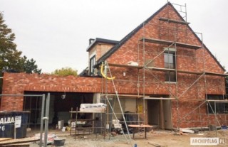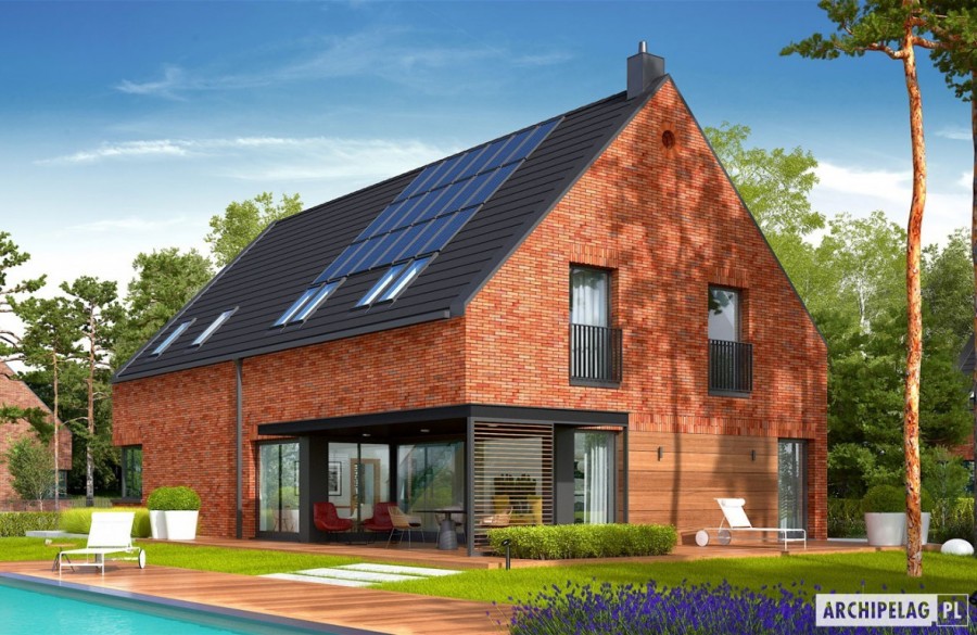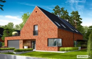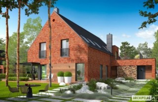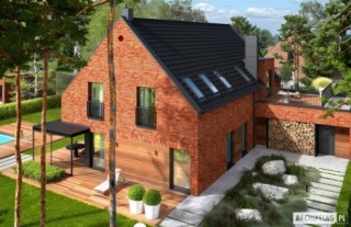 Charakterystyka: Dom parterowy z poddaszem użytkowym, niepodpiwniczony, z garażem dwustanowiskowymPrzeznaczenie: Dom dla 4-6-osobowej rodziny Technologia i konstrukcja:Ściany zewnętrzne: murowane, trójwarstwowe, pustaki ceramiczne 24 cm, ocieplenie 10 cm, warstwa licowa z cegły klinkierowej 11,5 cm firmy RöbenŚciany wewnętrzne: nośne i działowe murowane, pustaki ceramiczne 24 cm i 12 cmStrop i stropodach nad garażem: międzypiętrowy żelbetowy i gęstożebrowy TerivaDach: konstrukcja drewniana, ocieplenie wełna mineralna ISOVER 30 cm, dachówka ceramiczna płaska Bergamo firmy RöbenInne: schody wewnętrzne żelbetowe Rozwiązania instalacyjne:Ogrzewanie: kocioł gazowy kondensacyjny, rozprowadzenie ciepła: grzejnikiWentylacja: grawitacyjnaOZE: kolektory słoneczneWykończenie:Elewacje: cegły licowe klinkierowe firmy Röben 11,5 cm, typ Darwin w kolorze czerwono-brązowym cieniowane, elementy nadprożowe ceglane firmy Röben, okładzina drewnianaStolarka: aluminiowo-drewniana INNOVIEW firmy FAKROOkna połaciowe: rozwiązania technologiczne i wyłaz dachowy firmy FAKROOtoczenie: kostka betonowa i płyty tarasowe firmy Libet, system tarasowy ProDeck - deska kompozytowa Terra w kolorze orzech, meble ogrodowe firmy B&B Italia Wersje - zapytaj o dostępność:- Teodor (wersja A) - bez garażu lub z garażem jednostanowiskowym- Teodor (wersja B) – taki sam układ funkcji, inne wykończenie elewacji, różne wersje garaży- Teodor (wersja C) – taki sam układ funkcji, ściany dwuwarstwowe wykończone tynkiem, różne wersje garaży- Teodor (wersja C) ENERGO PLUS – taki sam układ funkcji, ściany dwuwarstwowe z okładziną kamienną, instalacje energooszczędne: pompa ciepła z ogrzewaniem podłogowym, wentylacja mechaniczna z rekuperacją, system solarny, różne wersje garaży- odbicie lustrzane do każdej wersji Istnieje techniczna możliwość:- podpiwniczenia budynku- zbliźniaczenia- wykonania budynku w technologii szkieletowejWarianty działek dla wersji domu z garażem jednostanowiskowym i bez garażu: