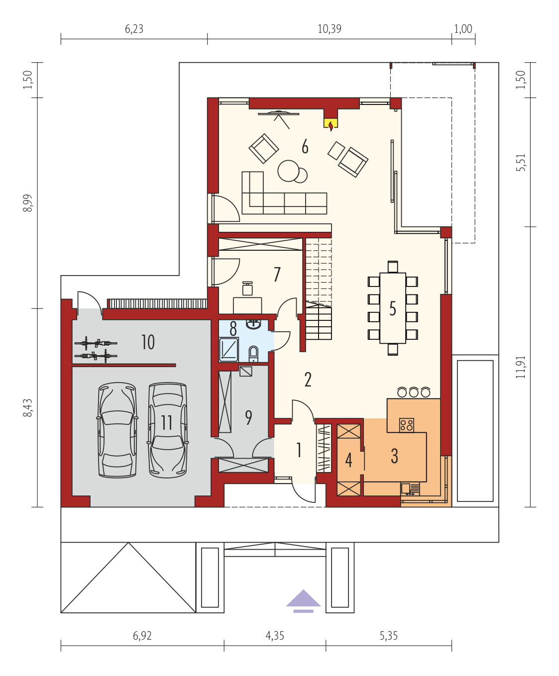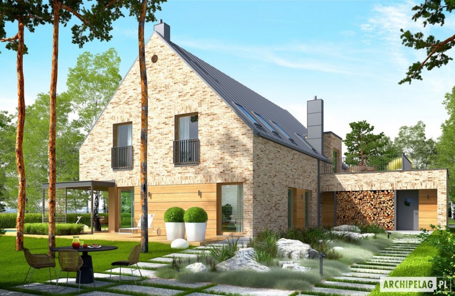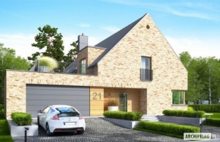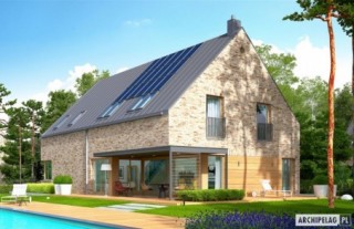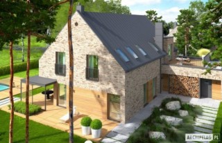 Charakterystyka: Dom parterowy z poddaszem użytkowym, niepodpiwniczony, z garażem dwustanowiskowymPrzeznaczenie: Dom dla 4-6-osobowej rodziny Technologia i konstrukcja:Ściany zewnętrzne: murowane, trójwarstwowe, pustaki ceramiczne 24 cm, ocieplenie 10 cm, warstwa licowa z cegły klinkierowej 11,5 cm firmy RöbenŚciany wewnętrzne: nośne i działowe murowane, pustaki ceramiczne 24 cm i 12 cmStrop i stropodach nad garażem: międzypiętrowy żelbetowy i gęstożebrowy TerivaDach: konstrukcja drewniana, ocieplenie wełna mineralna 30 cm, blacha na rąbek stojący Classic firmy RuukkiInne: schody wewnętrzne żelbetowe Rozwiązania instalacyjne:Ogrzewanie: kocioł gazowy kondensacyjny, rozprowadzenie ciepła: grzejnikiWentylacja: grawitacyjna Wykończenie:Elewacje: cegły licowe klinkierowe firmy Röben 11,5 cm, mieszane kolory, np. typ Granity w kolorze brązowo-grafitowo-białym, typ Milton w kolorze szaro-brązowym, typ Melbourne w kolorze czerwonym i typ Ross w kolorze burgund, elementy nadprożowe ceglane firmy Röben, okładzina drewnianaStolarka: aluminiowo-drewniana INNOVIEW firmy FAKROOkna połaciowe: rozwiązania technologiczne i wyłaz dachowy firmy FAKROOtoczenie: kostka betonowa i płyty tarasowe firmy Libet, system tarasowy ProDeck - deska kompozytowa Terra w kolorze orzech, meble ogrodowe firmy B&B Italia Wersje - zapytaj o dostępność:- Teodor (wersja B) - bez garażu lub z garażem jednostanowiskowym- Teodor (wersja A) – taki sam układ funkcji, inne wykończenie elewacji, różne wersje garaży- Teodor (wersja C) – taki sam układ funkcji, ściany dwuwarstwowe wykończone tynkiem, różne wersje garaży- Teodor (wersja C) ENERGO PLUS – taki sam układ funkcji, ściany dwuwarstwowe z okładziną kamienną, instalacje energooszczędne: pompa ciepła z ogrzewaniem podłogowym, wentylacja mechaniczna z rekuperacją, system solarny, różne wersje garaży- odbicie lustrzane do każdej wersji Istnieje techniczna możliwość:- podpiwniczenia budynku- zbliźniaczenia- wykonania budynku w technologii szkieletoweWarianty działek dla wersji domu z garażem jednostanowiskowym i bez garażu: