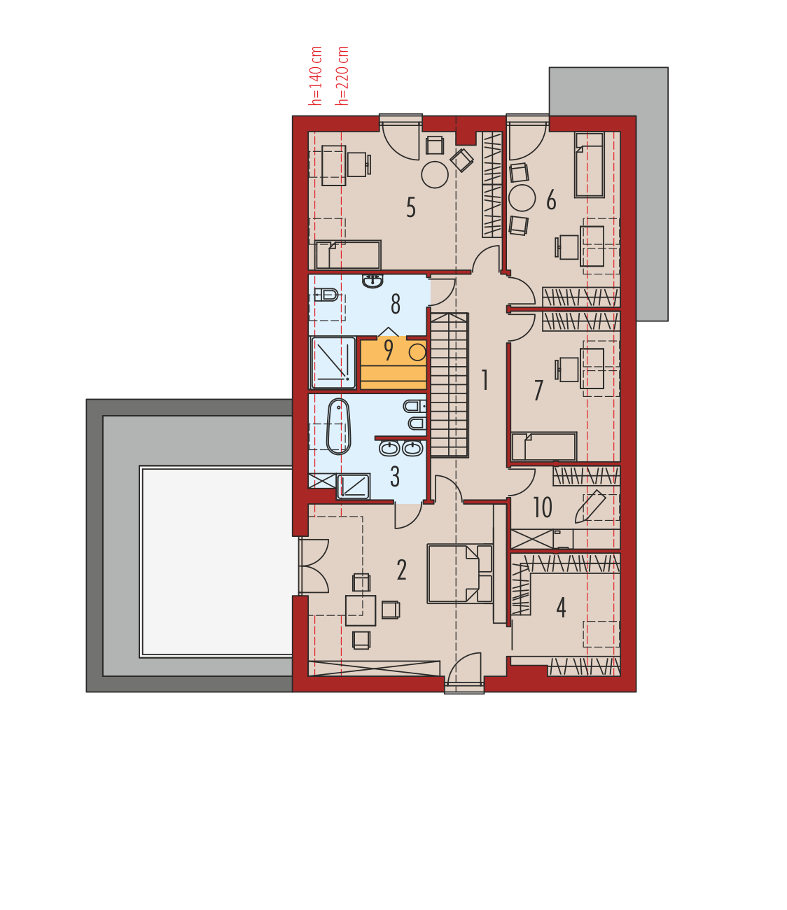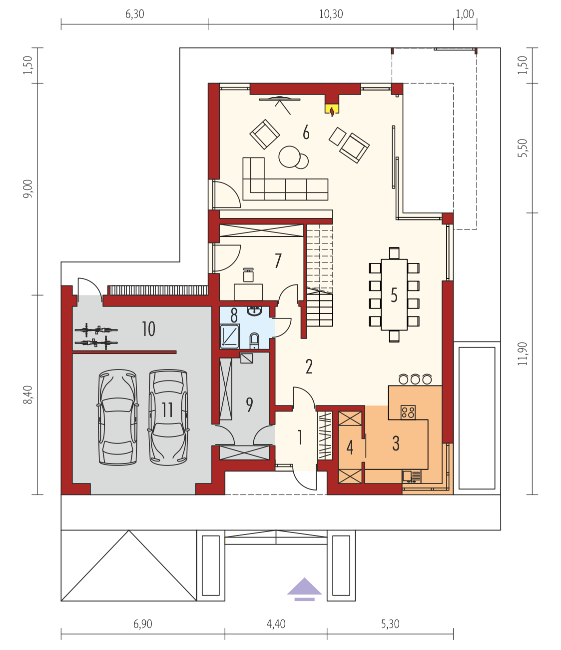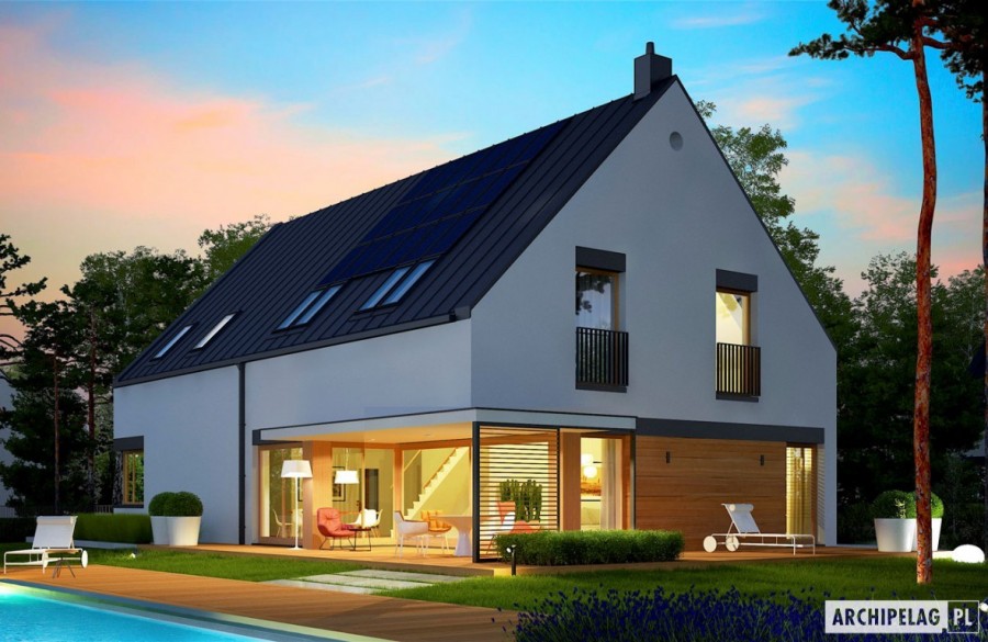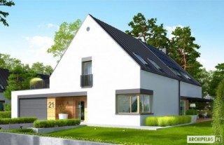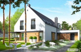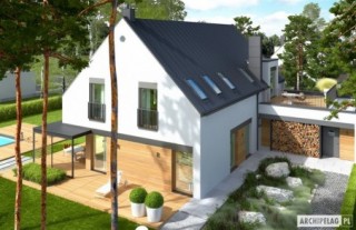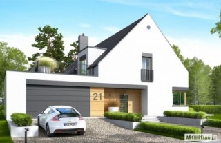 Charakterystyka: Dom parterowy z poddaszem użytkowym, niepodpiwniczony, z garażem dwustanowiskowymPrzeznaczenie: Dom dla 4-6-osobowej rodziny Technologia i konstrukcja:Ściany zewnętrzne: murowane, dwuwarstwowe, pustaki ceramiczne 24 cm, ocieplenie styropian Termo Organika 20 cmŚciany wewnętrzne: nośne i działowe murowane, pustaki ceramiczne 24 cm i 12 cmStrop i stropodach nad garażem: międzypiętrowy żelbetowy i gęstożebrowy TerivaDach: konstrukcja drewniana, ocieplenie wełna mineralna 30 cm, blacha na rąbek stojący Classic firmy RuukkiInne: schody wewnętrzne żelbetowe Rozwiązania instalacyjne:Ogrzewanie: kocioł gazowy kondensacyjny, rozprowadzenie ciepła: grzejnikiWentylacja: grawitacyjna Wykończenie:Elewacje: tynk cienkowarstwowy mineralny w kolorze białym TO-PA001 i szarym TO-GY011 z palety firmy Termo Organika, okładzina drewnianaStolarka: aluminiowo-drewniana INNOVIEW firmy FAKROOkna połaciowe: rozwiązania technologiczne i wyłaz dachowy firmy FAKROOtoczenie: kostka betonowa i płyty tarasowe firmy Libet, system tarasowy ProDeck - deska kompozytowa Terra w kolorze orzech, meble ogrodowe firmy B&B Italia Wersje - zapytaj o dostępność:- Teodor (wersja C) - bez garażu lub z garażem jednostanowiskowym- Teodor (wersja A,B) – taki sam układ funkcji, ściany trójwarstwowe wykończone cegłą licową klinkierową, inne wykończenie elewacji, różne wersje garaży- Teodor (wersja C) ENERGO PLUS – taki sam układ funkcji, ściany dwuwarstwowe z okładziną kamienną, instalacje energooszczędne: pompa ciepła z ogrzewaniem podłogowym, wentylacja mechaniczna z rekuperacją, system solarny, różne wersje garaży- odbicie lustrzane do każdej wersji Istnieje techniczna możliwość:- podpiwniczenia budynku- zbliźniaczenia- wykonania budynku w technologii szkieletowejWarianty działek dla wersji domu z garażem jednostanowiskowym i bez garażu: