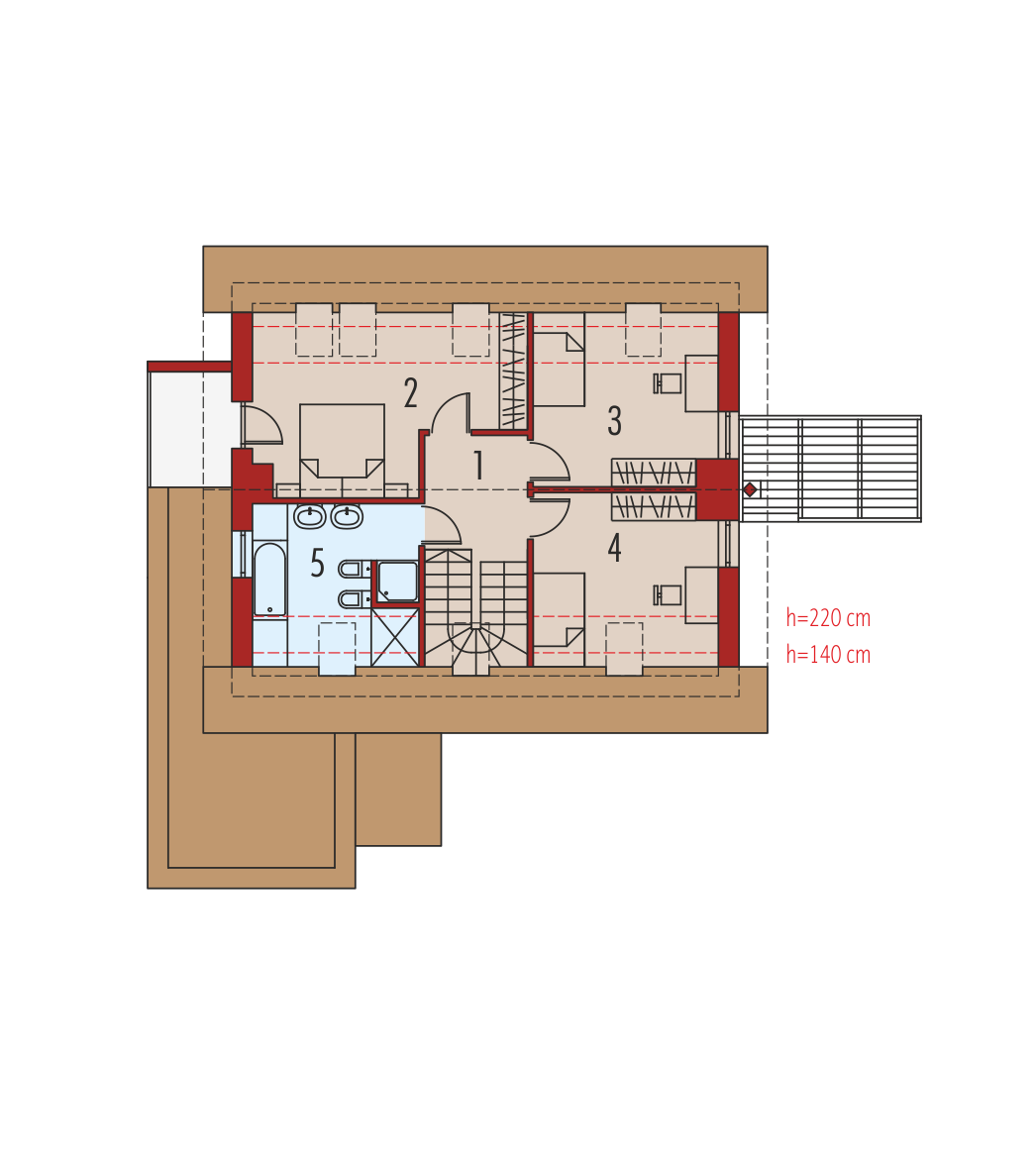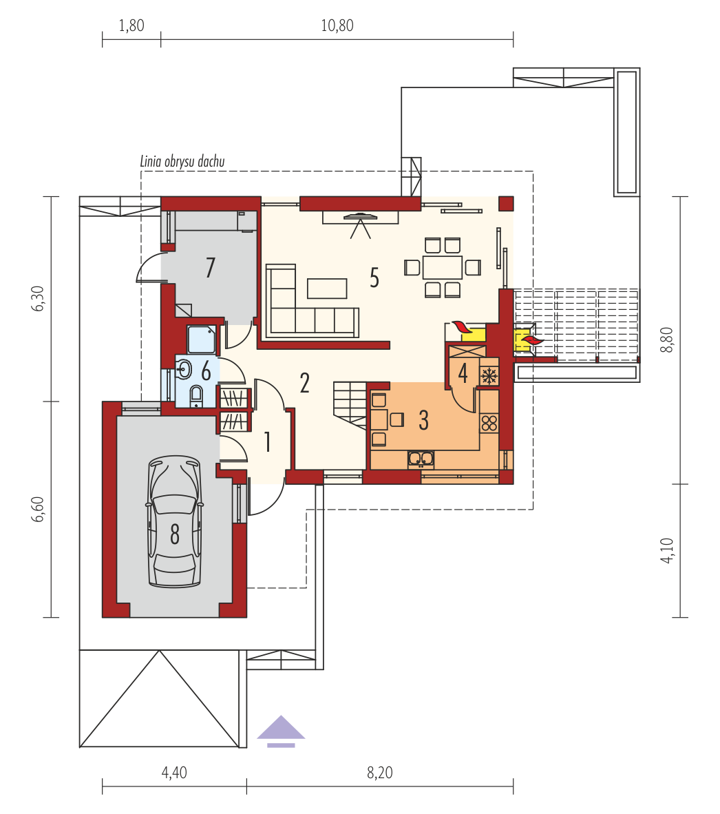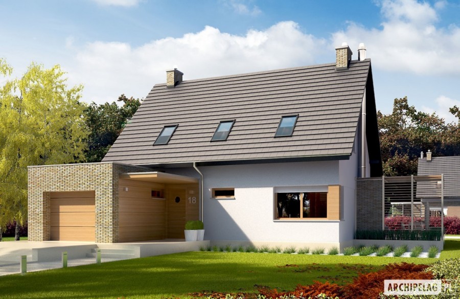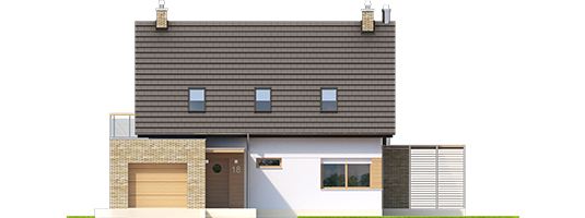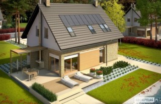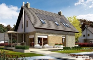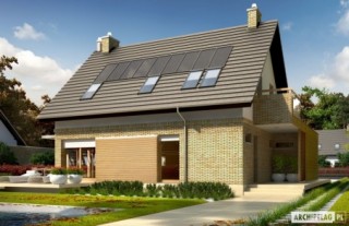 Charakterystyka: Dom parterowy z poddaszem użytkowym, niepodpiwniczony, z garażem jednostanowiskowymPrzeznaczenie: Dom dla 3-4-osobowej rodzinyTechnologia i konstrukcja: Ściany zewnętrzne: murowane, dwuwarstwowe, izolacja styropian Termo Organika grubości 20 cm Strop: gęstożebrowy Dach: konstrukcja drewniana, izolacja wełna mineralna grubości 30 cm, dachówka płaska Bergamo firmy Röben Dach nad garażem: stropodach odwrócony Inne: schody wewnętrzne drewnianeRozwiązania instalacyjne: Ogrzewanie: kocioł gazowy, rozprowadzenie ciepła: grzejniki Wentylacja: grawitacyjna Wykończenie:Elewacje: tynk cienkowarstwowy mineralny i okładzina drewniana oraz klinkierowa firmy RöbenStolarka okienna: drewniana, PCV lub aluminiowa. Rolety zewnętrzne w systemie CleverBox firmy BeCleverWersje - zapytaj o dostępność:- Tobiasz - bez garażu- Tobiasz G2 - z garażem dwustanowiskowym- Odbicia lustrzane do wszystkich wersjiIstnieje techniczna możliwość:- podpiwniczenia budynkuAtuty projektu okiem architekta:- Optymalny współczynnik kształtu budynku A/V sprzyjający energooszczędności- Okna o niskim współczynniku przenikania ciepła- Bryła sprzyjająca energooszczędności, zminimalizowane ryzyko występowania mostków termicznych- Zblokowane piony instalacyjne – oszczędność na etapie budowy i późniejszej eksploatacji instalacji- Praktyczne zadaszenie nad wejściem do budynku – osłona przed wiatrem i śniegiem- Kominek zewnętrzny z grillem, zadaszony ażurową wiatą w nowoczesnej formie- Garaż oddzielony termicznie od ogrzewanej części budynku- Duże pomieszczenie kotłowni pozwala na zastosowanie dowolnego źródła ogrzewania- Praktyczna spiżarnia przy kuchni- Główna sypialnia z wygodną wnęką na garderobę oraz atrakcyjnym balkonem- Nowoczesna kompozycja elewacji- Ciekawe detaleBryła sprzyja wykonaniu energooszczędnych rozwiązań instalacyjnych:- wentylacji mechanicznej z odzyskiem ciepła- systemu solarnego i fotowoltaicznego- pompy ciepłaIstnieje możliwość- podpiwniczenia budynkuDostępne wersje- Tobiasz - bez garażu- Tobiasz G2 - z garażem dwustanowiskowym- Odbicia lustrzane do wszystkich wersjiTechnologia i konstrukcja- Technologia murowana, ściany zewnętrzne dwuwarstwowe- Bardzo dobra izolacja przegród zewnętrznych i przegród wewnętrznych:- ściany zewnętrzne – izolacja: styropian Termo Organika 20 cm- dach i strop nad poddaszem – izolacja: wełna mineralna 30 cm- podłoga na gruncie – izolacja: styropian 15 cm- Strop gęstożebrowy- Schody wewnętrzne drewniane- Dach o konstrukcji drewnianej pokryto dachówką płaską lub inną o podobnych parametrach- Dach nad garażem: stropodach odwróconyWykończenie- Elewacje: tynk cienkowarstwowy mineralny i okładzina drewniana oraz klinkierowa- Stolarka okienna: drewniana, PCV lub aluminiowa- Rolety zewnętrzne w systemie CleverBox firmy BeClever
