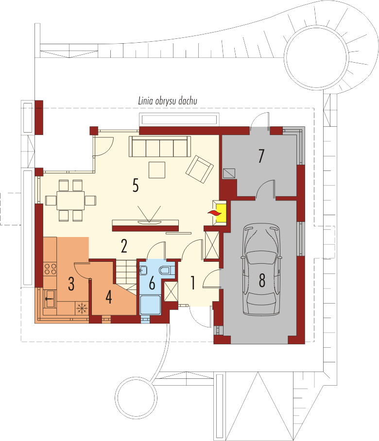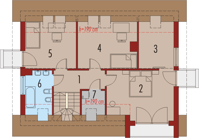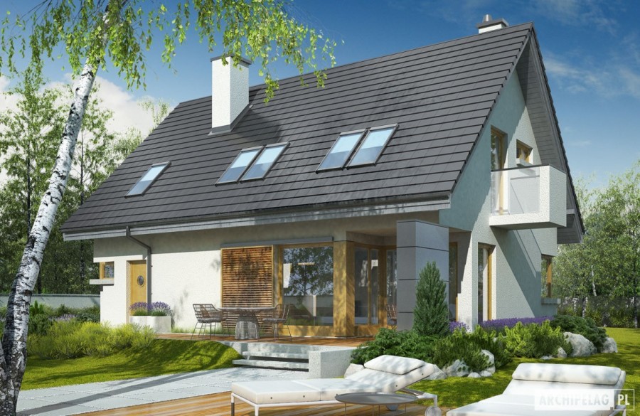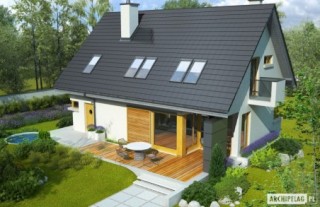 Charakterystyka: Dom parterowy z poddaszem użytkowym, niepodpiwniczony, z garażem jednostanowiskowym Przeznaczenie: Dom dla 3-4 osobowej rodzinyTechnologia i konstrukcja: Ściany zewnętrzne: murowane, Strop: gęstożebrowy Dach: konstrukcja drewniana, płytki dachówkowe STRUKTONIT firmy EURONIT, dachówka cementowa firmy IBF lub ceramiczna firmy Röben. Inne: schody wewnętrzne drewnianeRozwiązania instalacyjne: Ogrzewanie: kocioł gazowy, rozprowadzenie ciepła: grzejniki Wentylacja: grawitacyjna Wykończenie: Elewacje: tynk mineralny i płyty elewacyjne, cementowe firmy EURONIT, które można zastąpić okładziną drewnianą, klinkierową lub kamienną, cokół kamienny Stolarka: drewniana lub PCVWersje - zapytaj o dostępność: - Tolek II G1 – inna aranżacja pomieszczeń na poddaszu - odbicia lustrzane do wszystkich wersjiIstnieje techniczna możliwość: - podpiwniczenia budynku