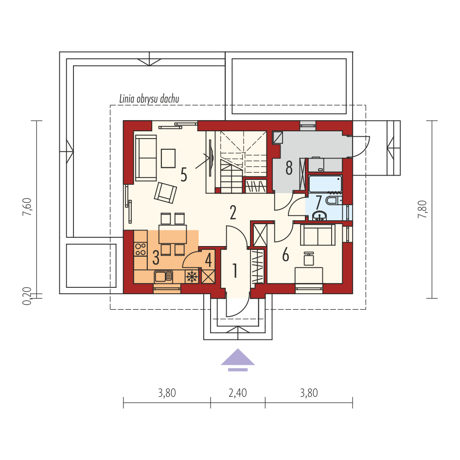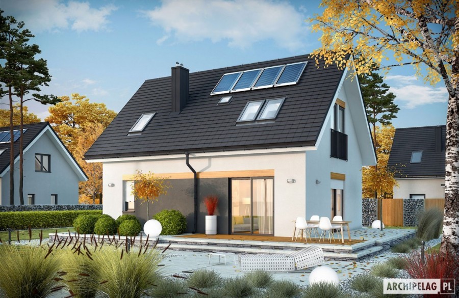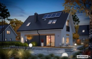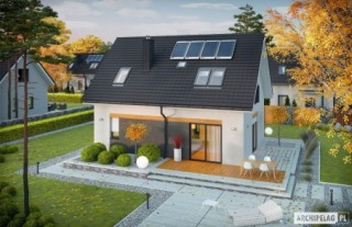 Charakterystyka: Dom parterowy z poddaszem użytkowym, niepodpiwniczonyPrzeznaczenie: Dom dla 3-5-osobowej rodziny Technologia i konstrukcja:Ściany zewnętrzne: murowane, dwuwarstwowe, beton komórkowy Solbet 24 cm, ocieplenie styropian Termo Organika 20 cmŚciany wewnętrzne: nośne i działowe murowane, beton komórkowy Solbet 24 cm i 12 cmStrop: międzypiętrowy gęstożebrowy TerivaDach: konstrukcja drewniana, ocieplenie wełna mineralna ISOVER 30 cm, dachówka płaska Bergamo firmy RöbenInne: schody wewnętrzne drewniane Rozwiązania instalacyjne:Ogrzewanie: kocioł gazowy kondensacyjny, rozprowadzenie ciepła: grzejnikiWentylacja: grawitacyjna Dodatkowo: stacja uzdatniania wody firmy Viessmann OZE: kolektory słoneczne firmy ViessmannWykończenie:Elewacje: tynki cienkowarstwowe mineralne w kolorze TO-PA001 i TO-GY011 z palety firmy Termo Organika, okładzina drewnianaStolarka: drewniana, PVC lub aluminiowa, rolety zewnętrzne w systemie CleverBox firmy BeClever, drzwi wejściowe firmy HörmannOkna połaciowe: rozwiązania technologiczne i świetlik tunelowy firmy VELUXOtoczenie: płyty tarasowe firmy Libet, system tarasowy ProDeck - deska kompozytowa Terra w kolorze orzech Wersje - zapytaj o dostępność:- Witek II - z garażem jedno- lub dwustanowiskowym- Witek – podobny układ funkcjonalny, inne wykończenie elewacji, różne wersje garaży- odbicie lustrzane do każdej wersji Istnieje techniczna możliwość:- podpiwniczenia budynku- wykonania budynku w technologii szkieletowej