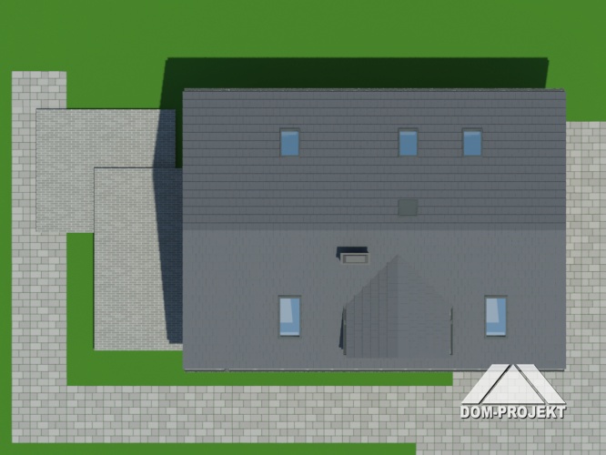 Dom parterowy, przeznaczony dla 4-5-osobowej rodziny. Część ogólnodostępna obejmuje pokój dzienny z jadalnią. Z częściowo zamkniętej kuchni dostępna jest podręczna spiżarnia. W części prywatnej znajdują się trzy sypialnie z ogólnodostępną łazienką. W strefie wejściowej zlokalizowano pomieszczenie gospodarcze. Z hallu istnieje możliwość wejścia schodami na strych, który można zaadaptować na dwa pokoje z łazienką. Projekt jest dostępny również w wersji parterowej, bez garażu oraz z inną lokalizacją garażu. Projekt może być wykorzystany do zabudowy bliźniaczej.
