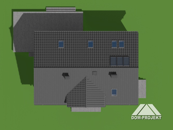 Dom parterowy, niepodpiwniczony, przeznaczony dla 4-5-osobowej rodziny. W części ogólnodostępnej znajduje się przestronny hall, pokój dzienny wysoki po dach, jadalnia, kuchnia, łazienka oraz gabinet. Korytarz pełniący funkcję garderoby, dwie sypialnie z ogólnodostępną łazienką i dodatkową sypialnię z własną łazienką i garderobą zlokalizowano w odizolowanej części prywatnej. Dom posiada również pomieszczenie gospodarcze (kotłownia + pralnia) i dwustanowiskowy garaż. Atrakcją domu może stać się obszerny strych, który można adaptować na wielofunkcyjną antresolę, otwartą na pokój dzienny.
