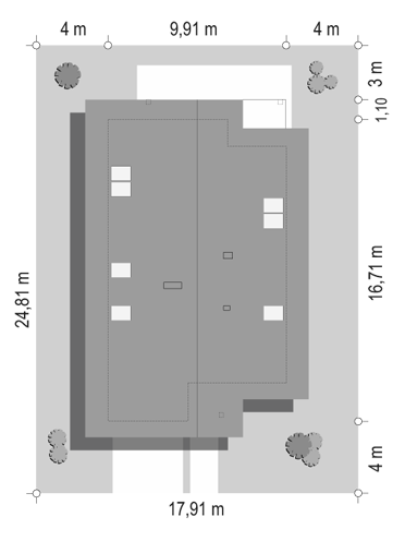 TK67 to nieduży, zwarty i bardzo funkcjonalnie zaprojektowany dom dla czteroosobowej rodziny. Znajdziemy tu trzy spore sypialnie i duży salon i dwie łazienki. Konstrukcja budynku pozwala na dowolną aranżację wnętrza bo wszystkie ściany wewnętrzne są ścianami działowymi. Wygodny zadaszony taras pozwoli cieszyć się ogrodem nawet w nieco chłodniejsze dni. Duża kotłownia pomieści każdy piec i zasobnik na opał jeśli tylko zajdzie taka potrzeba. Zachęcamy do obejrzenia podobnych projektów mniejszy TK69 i TK68 z dachem dwuspadowym. W naszej ofercie dostępny jest także dom w odbicie lustrzanym TK67L. POBIERZ KARTĘ KATALOGOWĄ POBIERZ RYSUNKI SZCZEGÓŁOWE POBIERZ KOSZTORYS UPROSZCZONY POBIERZ KOSZTORYS SZCZEGÓŁOWY POBIERZ PRZEDMIAR ROBÓT POBIERZ ZESTAWIENIE MATERIAŁÓW POBIERZ CHARAKTERYSTYKĘ ENERGETYCZNĄ POBIERZ RZUT W SKALI 1:500 PODSTAWOWE DANE PROJEKTU Pow. użytkowa 94,62 m2 Pow. netto 103,18 m2 Pow. zabudowy 163,95 m2 Kubatura 280,64 m3 Wym. budynku 14,18 x13,59 m Min. wym. działki 22,18 x 20,59 m Wysokość budynku 6,55 m Kąt nachylenia dachu 30 0 Pow. dachu 241,34 m2 Zapotrzebowanie na energię pierwotną (EP) x kWh/(rok*m2) Zapotrzebowanie na energię końcową (EK) x kWh/(rok*m2) PROPONOWANA TECHNOLOGIA WYKONANIA ELEWACJE tynk strukturalny STROP monolityczny żelbetowy ŚCIANY WEWNĘTRZNE bloczek gazobeton ŚCIANY ZEWNĘTRZNE bloczek gazobeton + ocieplenie styropian POKRYCIE DACHU dachówka ceramiczna lub blachodachówka PODOBNE PROJEKTY TK68 TK69 TK34