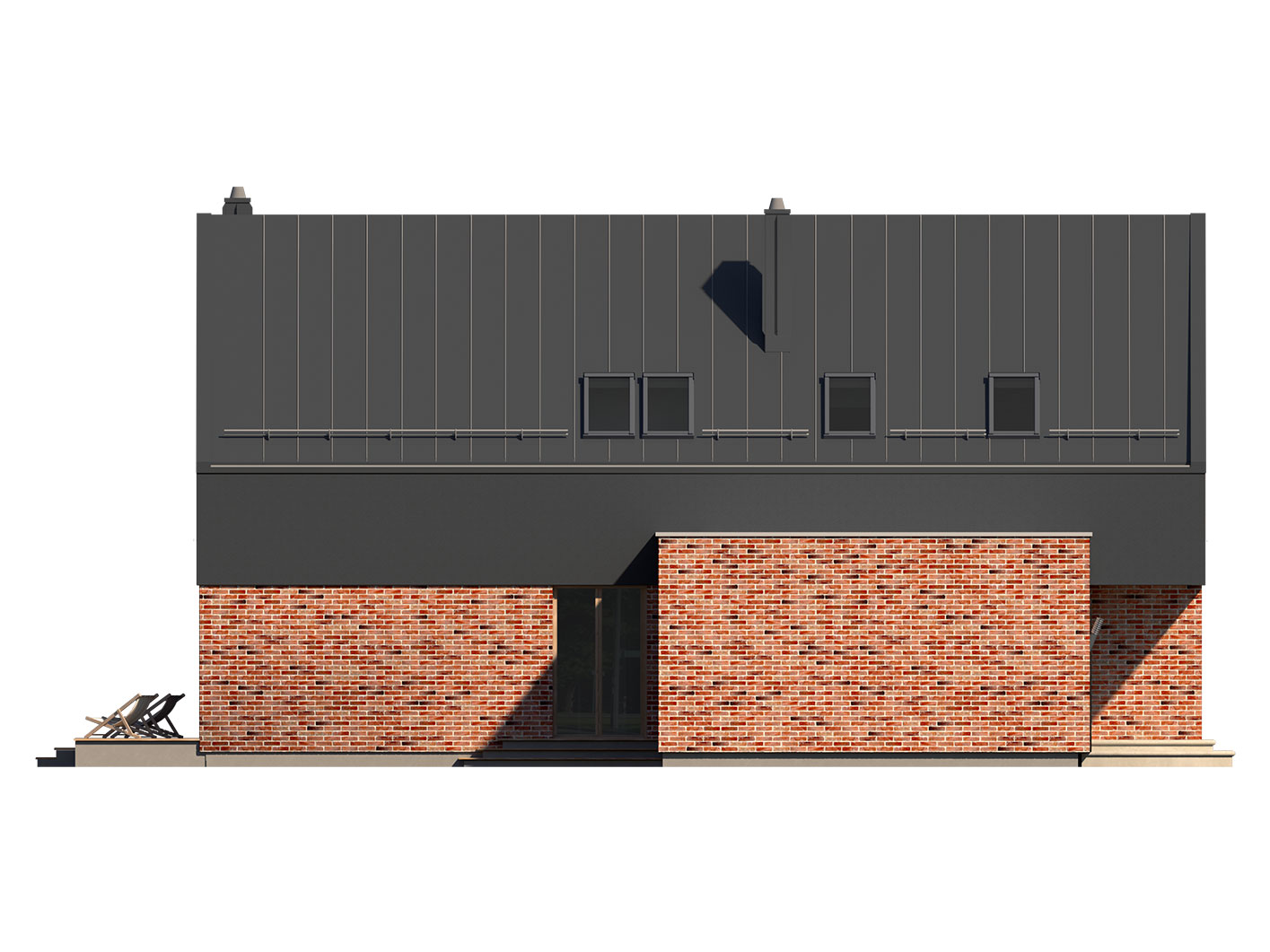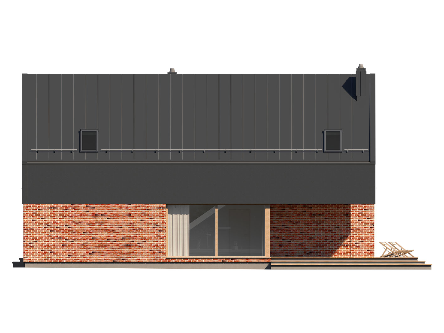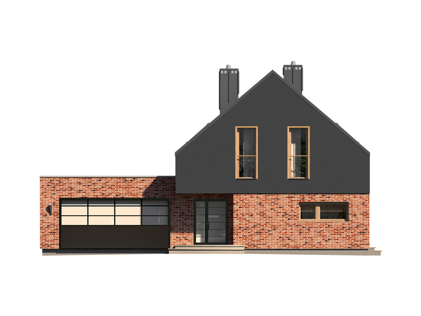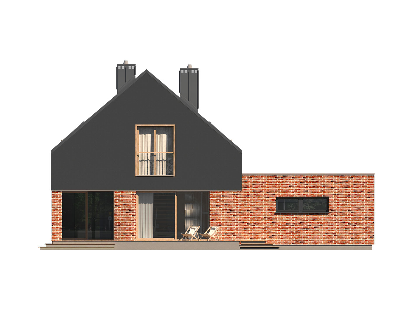 Lifi to projekt atrakcyjnego, nowoczesnego i bardzo funkcjonalnego domu parterowego z poddaszem użytkowym, przykrytego modnym dachem bezokapowym. Powstał on z myślą o wspólnym spędzaniu czasu z rodziną i przyjaciółmi oraz wypoczynku na łonie natury. Gustowne, naturalne materiały elewacyjne i liczne przeszklenia sprawiają, że dom idealnie wpisuje się w otaczający krajobraz. Budynek prezentuje się wyjątkowo elegancko i jest doskonałą propozycją dla bardzo wymagających inwestorów, szukających wygodnego i funkcjonalnego domu z charakterem. Prosta bryła budynku, na rzucie prostokąta, z dostawionym garażem, nabrała "pazura" dzięki zastosowaniu ciekawych rozwiązań elewacji. Do wykończenia ścian zewnętrznych wykorzystano cieniowane płytki elewacyjne w czerwono-czarnym kolorze, które w połączeniu z czarnym tynkiem tworzą niezwykle atrakcyjną i wyjątkową, ale równocześnie minimalistyczną całość. Nowoczesny charakter budynku podkreślają duże przeszklenia, szczególnie w części dziennej, ciekawie wkomponowane w elewację oraz płaska, elegancka dachówka. Taras wypoczynkowy, który stanowi naturalne przedłużenie otwartej i przeszklonej jadalni, poprzez swoje zadaszenie umożliwia korzystanie z niego bez względu na panujące warunki atmosferyczne. We wnętrzu domu zastosowano bardzo ciekawe rozwiązania projektowe. Na uwagę zasługuje przede wszystkim otwarta i ciekawie zaaranżowana przestrzeń centralna domu, czyli duża, całkowicie przeszklona jadalnia z antresolą oraz jednobiegowe designerskie schody. Niewątpliwym atutem projektu jest również przestronny wydzielony salon. Do dyspozycji domowników na parterze przewidziano również kuchnię ze spiżarnią, gabinet, łazienkę, kotłownię oraz dwustanowiskowy garaż.Na poddaszu znajdują się: sypialnia małżeńska z prywatną garderobą i łazienką, 2 sypialnie dla dzieci, wspólna łazienka i pralnia. Cała komunikacja górnej kondygnacji przebiega wzdłuż antresoli, z której można podziwiać aranżację jadalni i otoczenia domu. Lifi to wyjątkowa propozycja dla osób szukających nowoczesnych rozwiązań projektowych, nietuzinkowego spojrzenia na architekturę oraz ciekawie zaaranżowanej przestrzeni wewnętrznej.