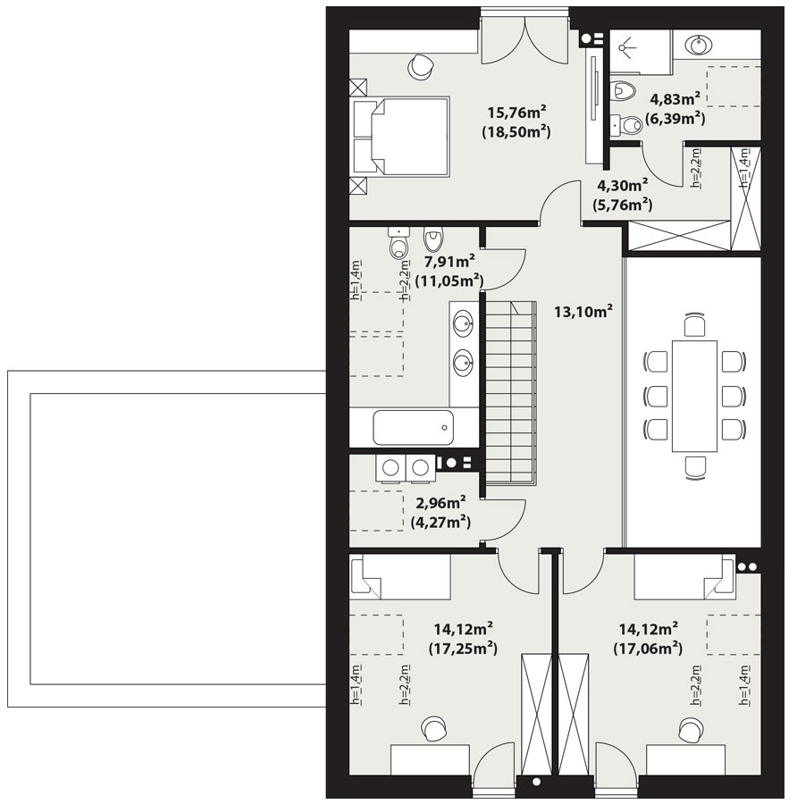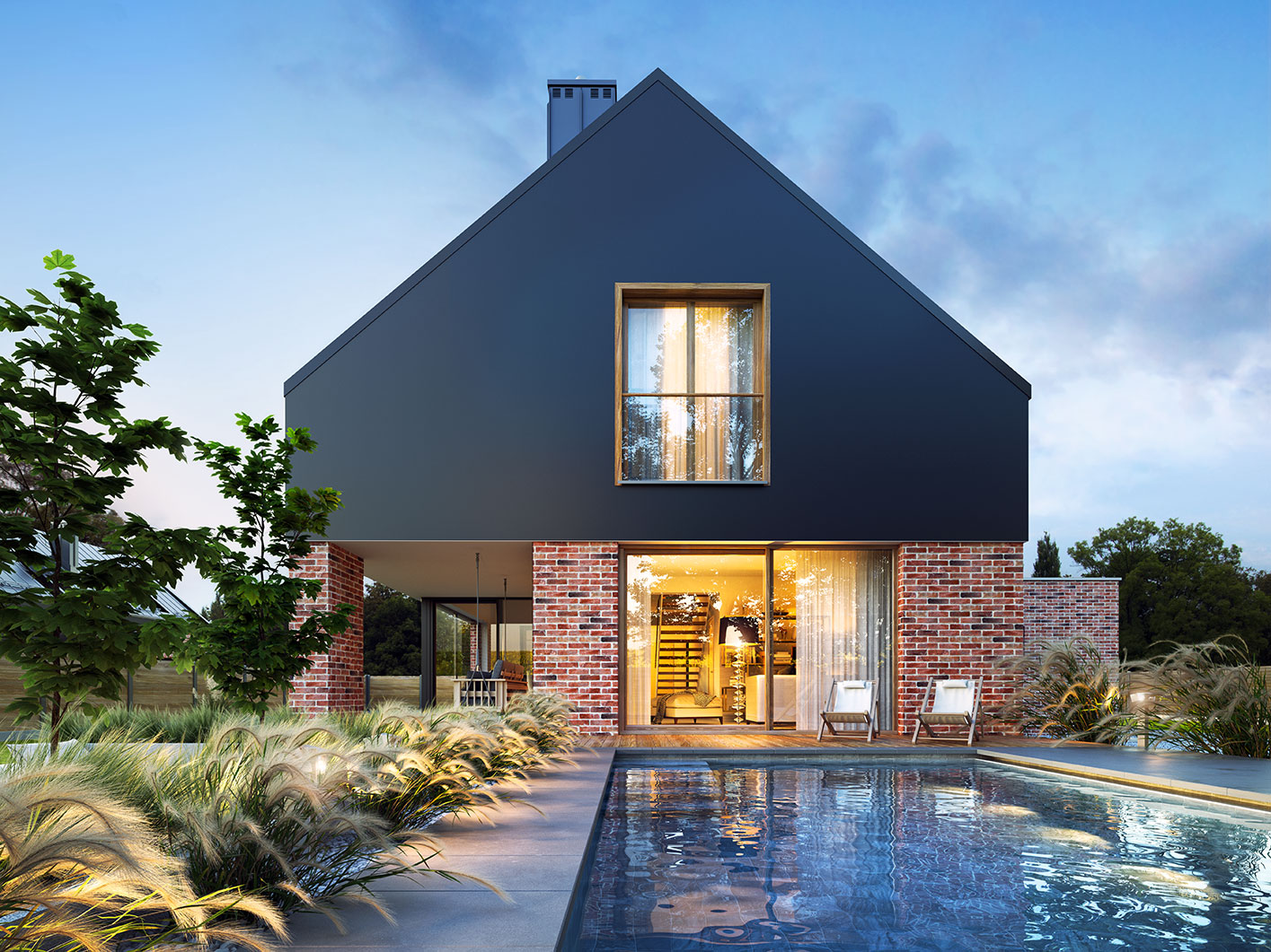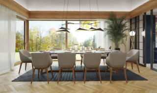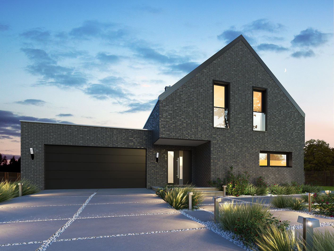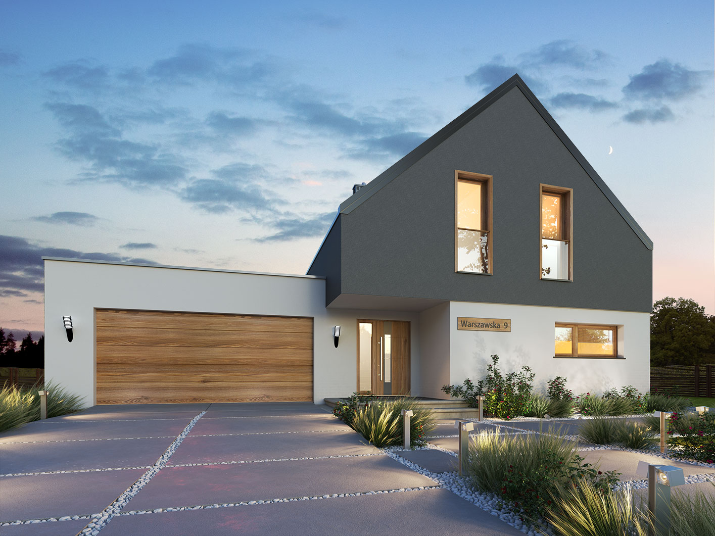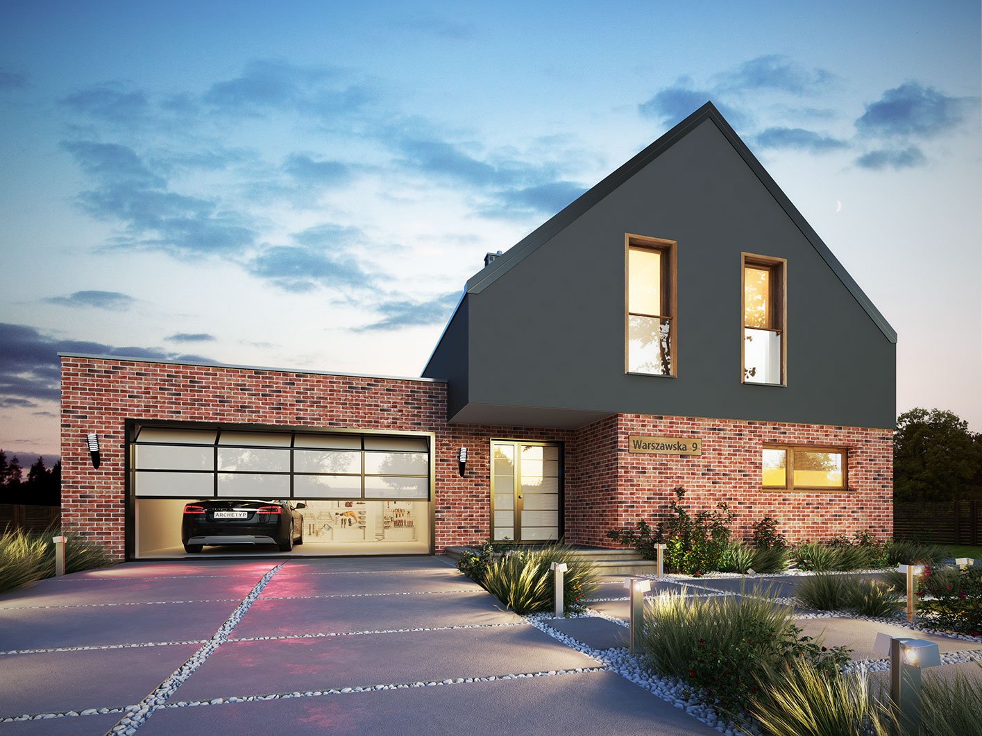 Lifi to projekt atrakcyjnego, nowoczesnego i bardzo funkcjonalnego domu parterowego z poddaszem użytkowym, przykrytego modnym dachem bezokapowym. Powstał on z myślą o wspólnym spędzaniu czasu z rodziną i przyjaciółmi oraz wypoczynku na łonie natury. Gustowne, naturalne materiały elewacyjne i liczne przeszklenia sprawiają, że dom idealnie wpisuje się w otaczający krajobraz. Budynek prezentuje się wyjątkowo elegancko i jest doskonałą propozycją dla bardzo wymagających inwestorów, szukających wygodnego i funkcjonalnego domu z charakterem. Prosta bryła budynku, na rzucie prostokąta, z dostawionym garażem, nabrała "pazura" dzięki zastosowaniu ciekawych rozwiązań elewacji. Do wykończenia ścian zewnętrznych wykorzystano cieniowane płytki elewacyjne w czerwono-czarnym kolorze, które w połączeniu z czarnym tynkiem tworzą niezwykle atrakcyjną i wyjątkową, ale równocześnie minimalistyczną całość. Nowoczesny charakter budynku podkreślają duże przeszklenia, szczególnie w części dziennej, ciekawie wkomponowane w elewację oraz płaska, elegancka dachówka. Taras wypoczynkowy, który stanowi naturalne przedłużenie otwartej i przeszklonej jadalni, poprzez swoje zadaszenie umożliwia korzystanie z niego bez względu na panujące warunki atmosferyczne. We wnętrzu domu zastosowano bardzo ciekawe rozwiązania projektowe. Na uwagę zasługuje przede wszystkim otwarta i ciekawie zaaranżowana przestrzeń centralna domu, czyli duża, całkowicie przeszklona jadalnia z antresolą oraz jednobiegowe designerskie schody. Niewątpliwym atutem projektu jest również przestronny wydzielony salon. Do dyspozycji domowników na parterze przewidziano również kuchnię ze spiżarnią, gabinet, łazienkę, kotłownię oraz dwustanowiskowy garaż.Na poddaszu znajdują się: sypialnia małżeńska z prywatną garderobą i łazienką, 2 sypialnie dla dzieci, wspólna łazienka i pralnia. Cała komunikacja górnej kondygnacji przebiega wzdłuż antresoli, z której można podziwiać aranżację jadalni i otoczenia domu. Lifi to wyjątkowa propozycja dla osób szukających nowoczesnych rozwiązań projektowych, nietuzinkowego spojrzenia na architekturę oraz ciekawie zaaranżowanej przestrzeni wewnętrznej.