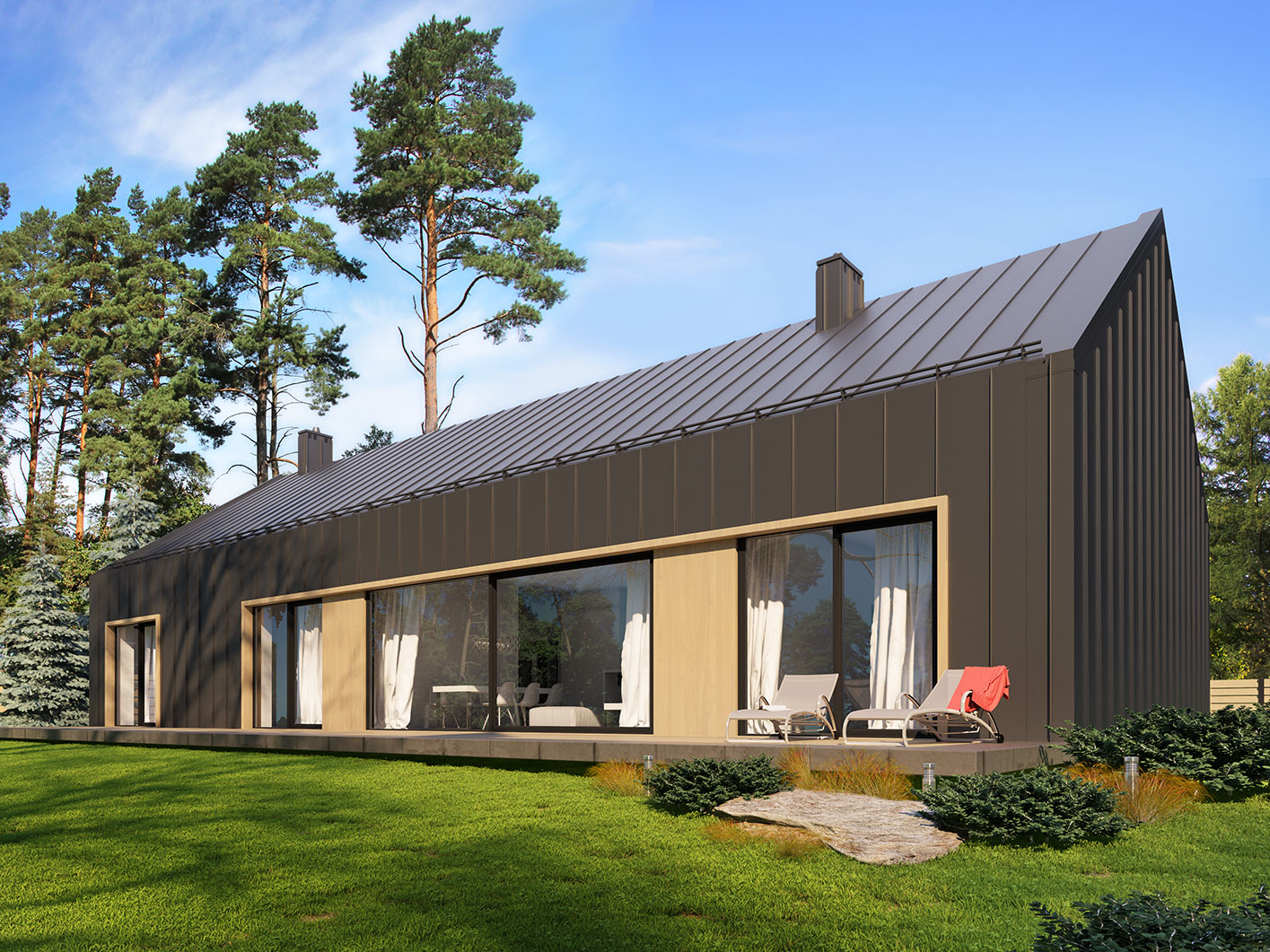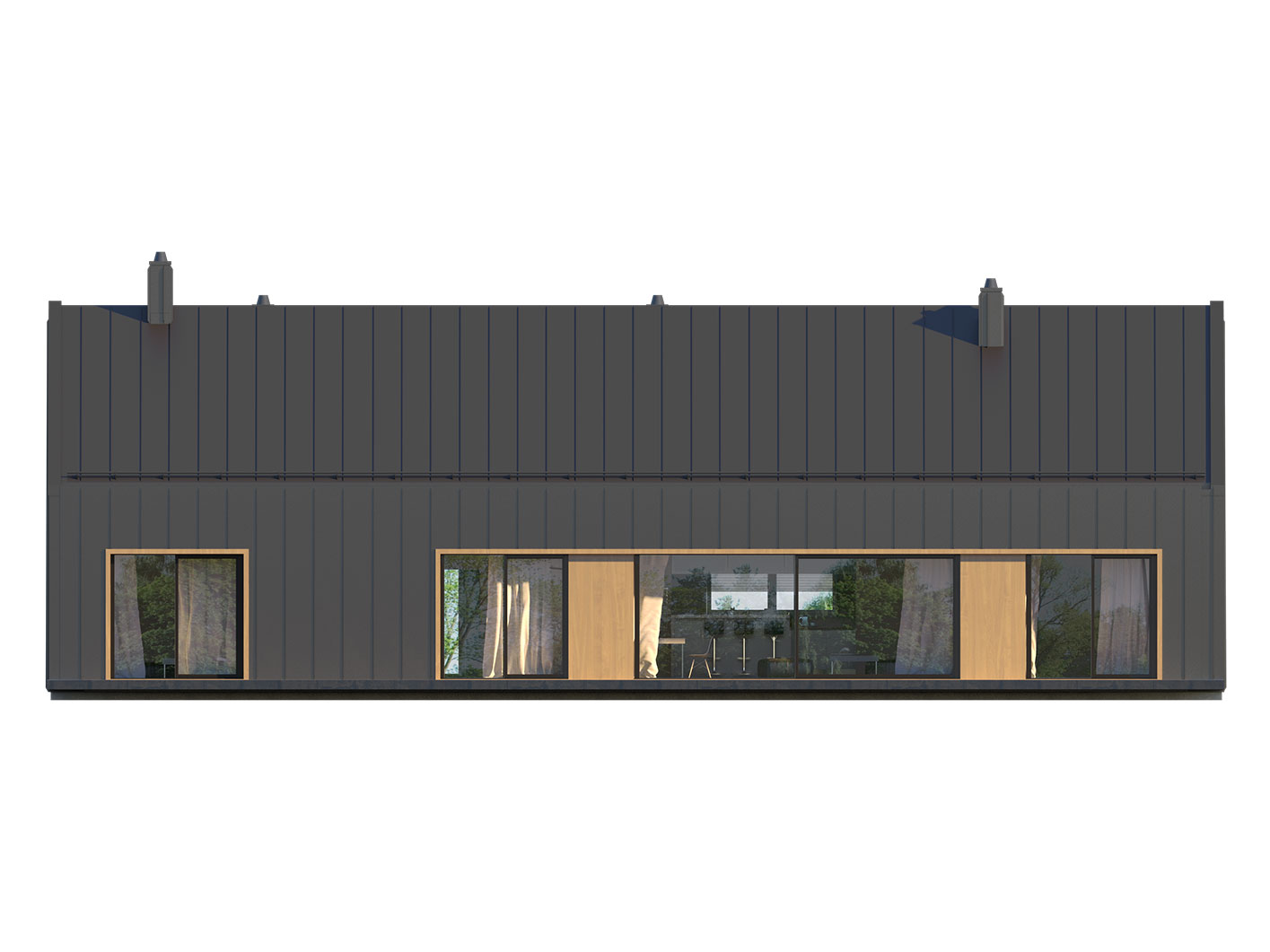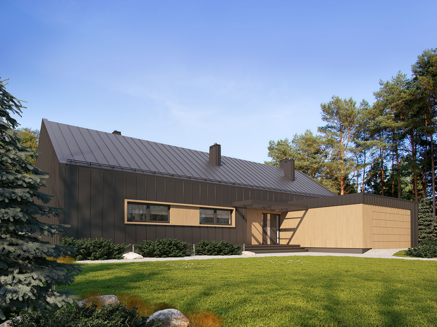 Projekt Emea to propozycja nowoczesnego domu parterowego z przestronnym dwustanowiskowym garażem. Jest on idealnym rozwiązaniem dla inwestorów poszukujących domu o niebanalnej architekturze i nowatorskim spojrzeniu na elewacje. Poprzez układ na rzucie prostokąta, prostą bryłę przykrytą dwuspadowym dachem bez okapów oraz szereg przeszkleń obiekt utrzymany jest w stylistyce tzw. nowoczesnej stodoły. Współczesny, minimalistyczny charakter budynku uzyskano dzięki idealnemu połączeniu dachu z blachy na rąbek stojący, który płynnie przechodzi w elewację z tego samego materiału. Dodatkiem do ciemnych elewacji jest szalówka w kolorze naturalnego drewna, która kontrastuje z czarną blachą na rąbek. Dom Emea, który kształtem nawiązuje do tradycyjnych wzorców typowych dla terenów wiejskich, we wnętrzu zachował bardzo przejrzysty i funkcjonalny program użytkowy dla 4-5 osobowej rodziny. Układ domu został podzielony na 3 strefy, gdzie część dzienna to przestronny salon z jadalnią, kuchnia ze spiżarnią oraz gabinet. Strefa intymna składa się z 3 sypialni i łazienki, z czego największa sypialnia z własną garderobę i łazienkę została dla zachowania intymności przeniesiona w inną część domu. Część gospodarcza to dwustanowiskowy garaż, kotłownia i pralnia. Niewątpliwym atutem projektu jest zastosowanie dużego tarasu oraz licznych przeszkleń zarówno w części dziennej, jak i w każdej z sypialni, co pozwala na otwarcie domu "na zewnątrz" i cieszenie się z pięknych, naturalnych walorów działki i przyrody.