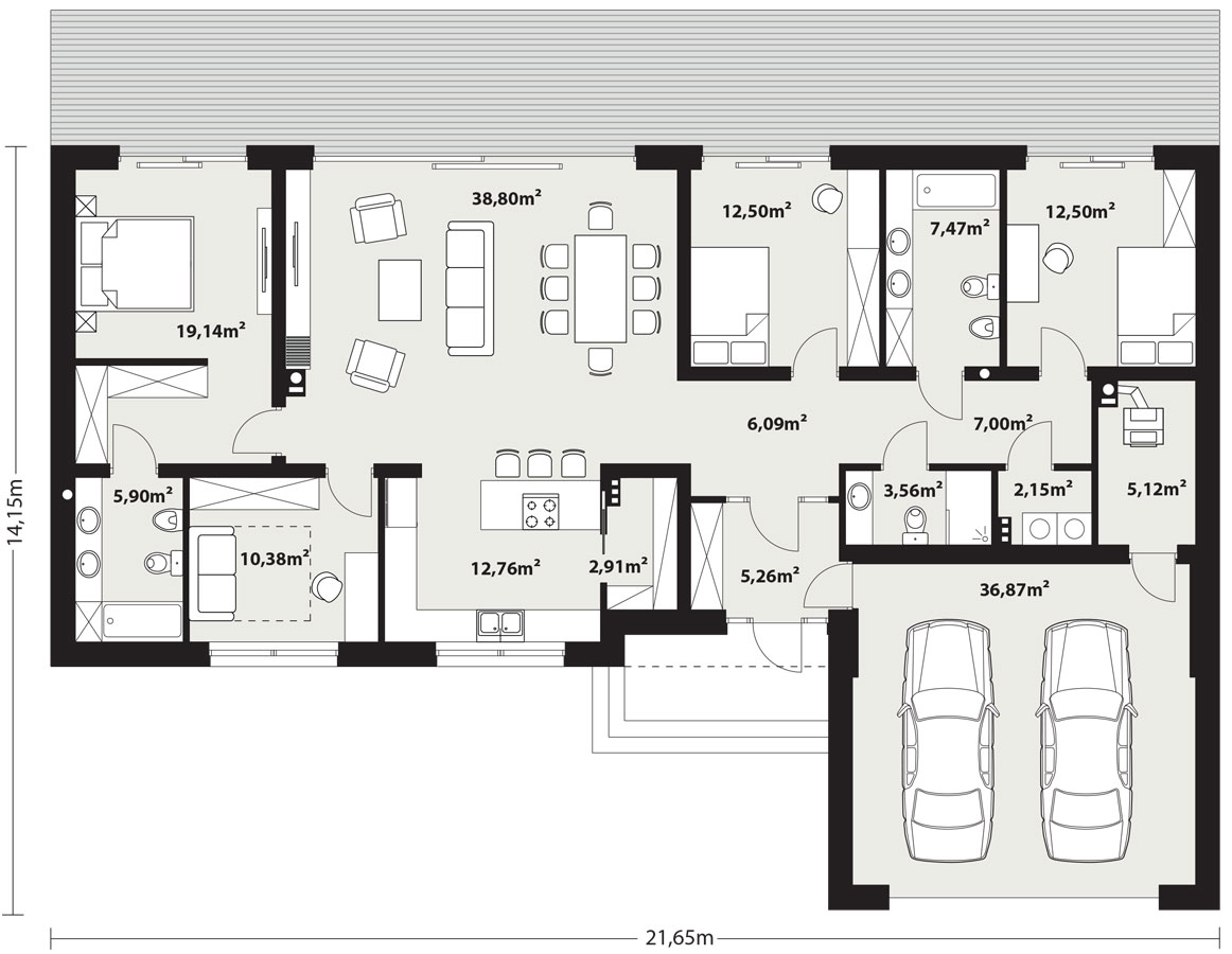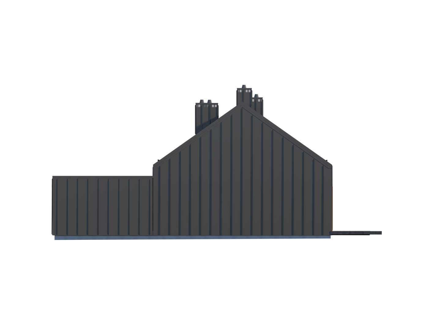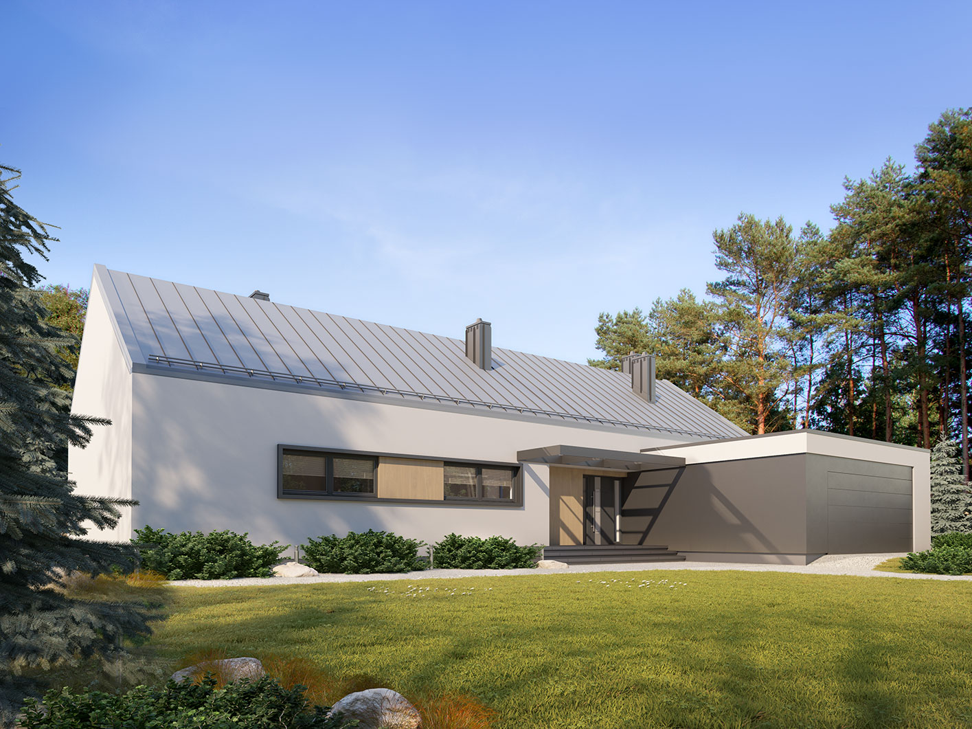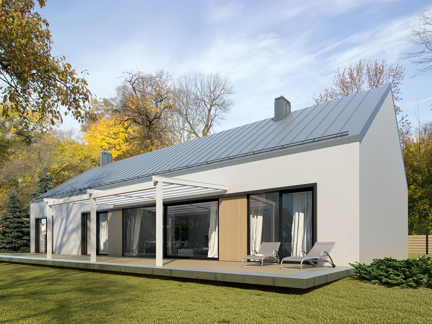 Projekt Emea to propozycja nowoczesnego domu parterowego z przestronnym dwustanowiskowym garażem. Jest on idealnym rozwiązaniem dla inwestorów poszukujących domu o niebanalnej architekturze i nowatorskim spojrzeniu na elewacje. Poprzez układ na rzucie prostokąta, prostą bryłę przykrytą dwuspadowym dachem bez okapów oraz szereg przeszkleń obiekt utrzymany jest w stylistyce tzw. nowoczesnej stodoły. Współczesny, minimalistyczny charakter budynku uzyskano dzięki idealnemu połączeniu dachu z blachy na rąbek stojący, który płynnie przechodzi w elewację z tego samego materiału. Dodatkiem do ciemnych elewacji jest szalówka w kolorze naturalnego drewna, która kontrastuje z czarną blachą na rąbek. Dom Emea, który kształtem nawiązuje do tradycyjnych wzorców typowych dla terenów wiejskich, we wnętrzu zachował bardzo przejrzysty i funkcjonalny program użytkowy dla 4-5 osobowej rodziny. Układ domu został podzielony na 3 strefy, gdzie część dzienna to przestronny salon z jadalnią, kuchnia ze spiżarnią oraz gabinet. Strefa intymna składa się z 3 sypialni i łazienki, z czego największa sypialnia z własną garderobę i łazienkę została dla zachowania intymności przeniesiona w inną część domu. Część gospodarcza to dwustanowiskowy garaż, kotłownia i pralnia. Niewątpliwym atutem projektu jest zastosowanie dużego tarasu oraz licznych przeszkleń zarówno w części dziennej, jak i w każdej z sypialni, co pozwala na otwarcie domu "na zewnątrz" i cieszenie się z pięknych, naturalnych walorów działki i przyrody.