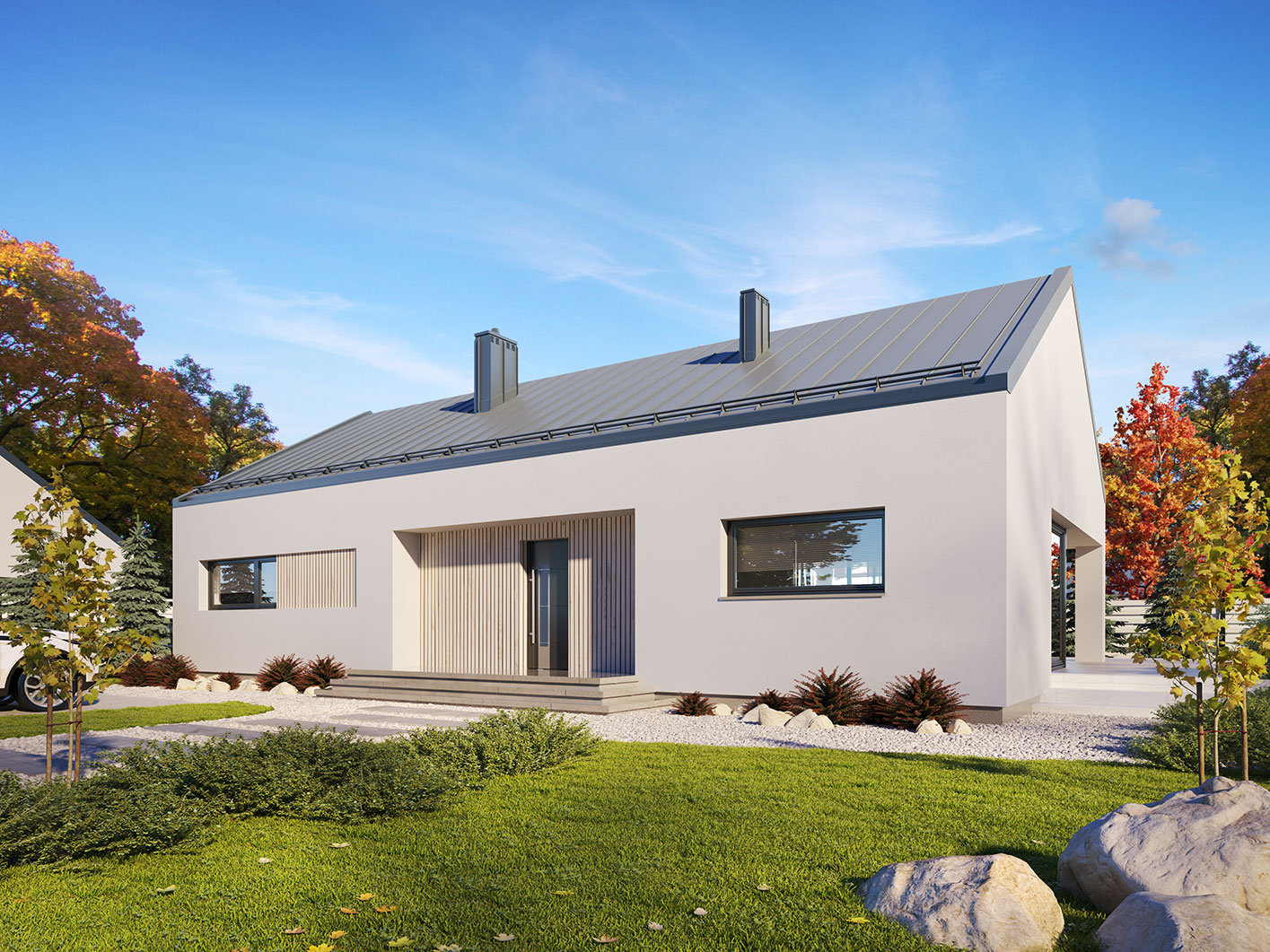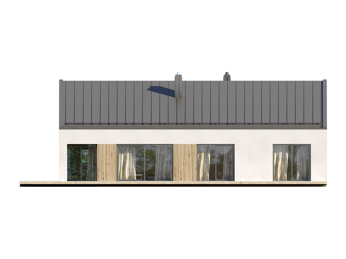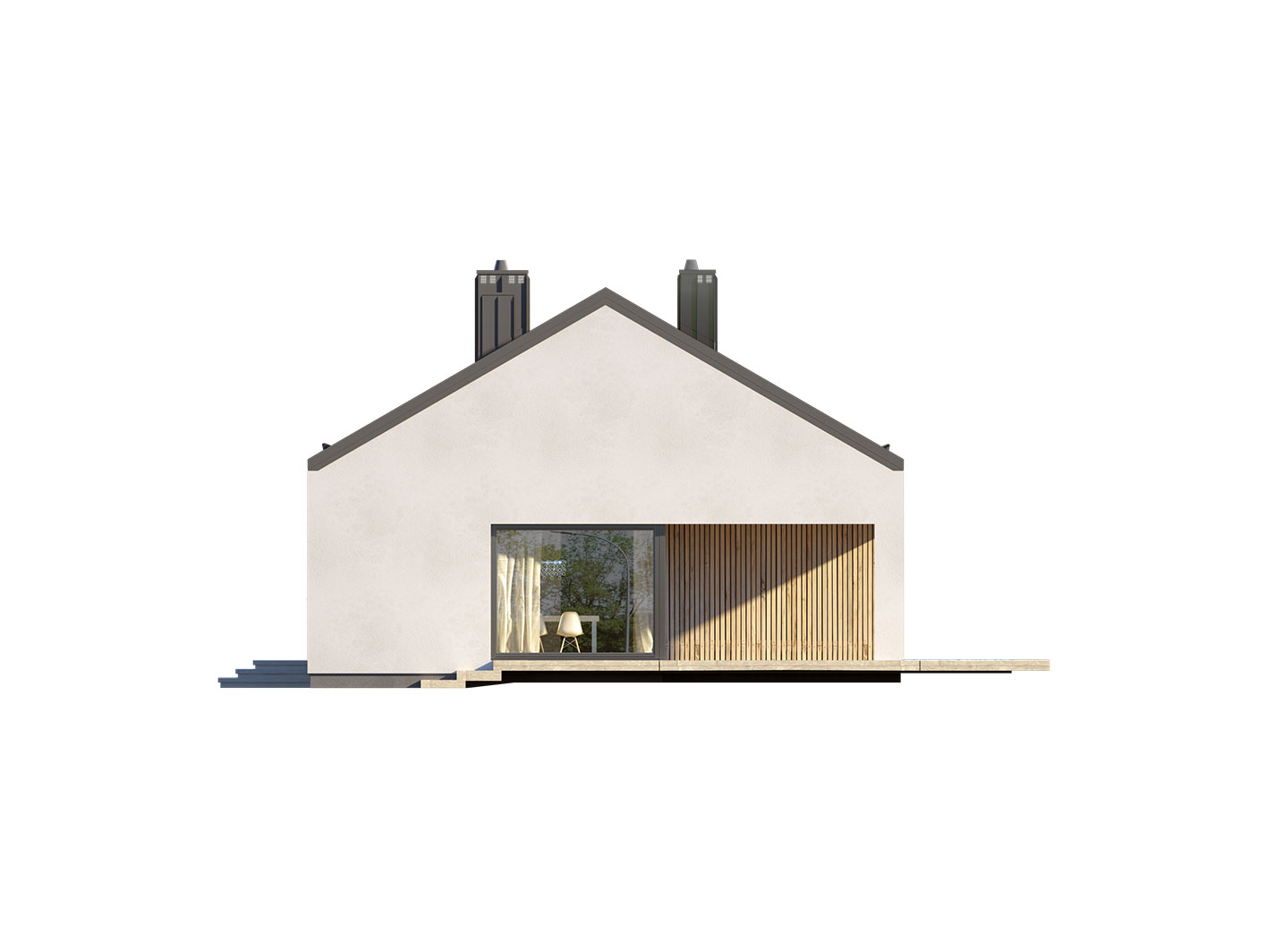Projekt Semi to propozycja nowoczesnego domu parterowego. Poprzez układ na rzucie prostokąta, prostą bryłę przykrytą dwuspadowym dachem bez okapów oraz szereg przeszkleń obiekt utrzymany jest w stylistyce tzw. nowoczesnej stodoły. Współczesny, minimalistyczny charakter budynku uzyskano dzięki elewacjom wykończonym białym tynkiem, urozmaiconym szalówką w kolorze naturalnego drewna, które idealnie komponują się z szarą blachą na rąbek. Dom Semi, który kształtem nawiązuje do tradycyjnych wzorców typowych dla terenów wiejskich, we wnętrzu zachował bardzo przejrzysty i funkcjonalny program użytkowy dla 4 osobowej rodziny. Układ domu został podzielony na 3 strefy, gdzie część dzienna to salon oraz kuchnia ze spiżarnią i narożnie przeszkloną jadalnią. Strefa intymna składa się z 3 sypialni i łazienki. Część gospodarcza to duża kotłownia i pralnia. Niewątpliwym atutem projektu jest zastosowanie dużego tarasu oraz licznych przeszkleń zarówno w części dziennej, jak i w każdej z sypialni, co pozwala na otwarcie domu "na zewnątrz" i cieszenie się z pięknych, naturalnych walorów działki.