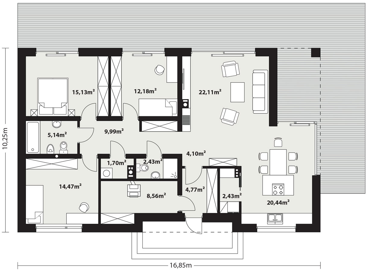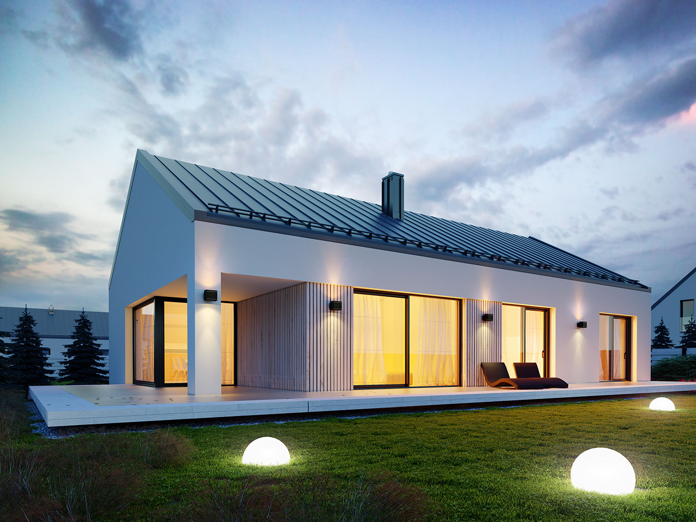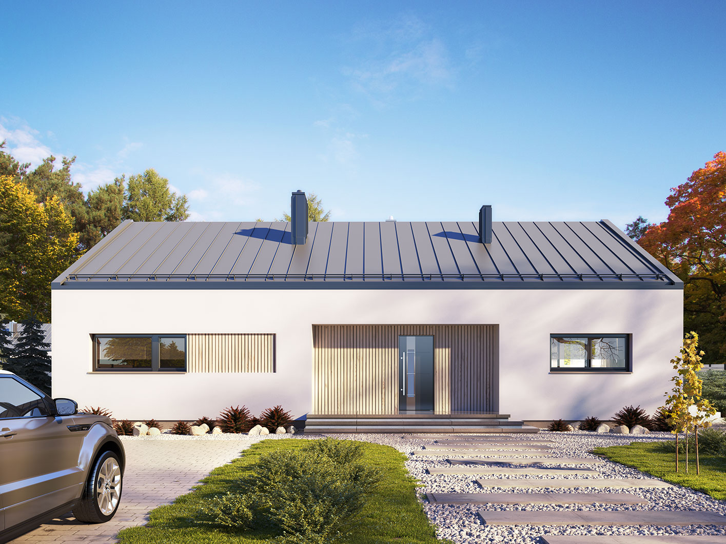 Projekt Semi to propozycja nowoczesnego domu parterowego. Poprzez układ na rzucie prostokąta, prostą bryłę przykrytą dwuspadowym dachem bez okapów oraz szereg przeszkleń obiekt utrzymany jest w stylistyce tzw. nowoczesnej stodoły. Współczesny, minimalistyczny charakter budynku uzyskano dzięki elewacjom wykończonym białym tynkiem, urozmaiconym szalówką w kolorze naturalnego drewna, które idealnie komponują się z szarą blachą na rąbek. Dom Semi, który kształtem nawiązuje do tradycyjnych wzorców typowych dla terenów wiejskich, we wnętrzu zachował bardzo przejrzysty i funkcjonalny program użytkowy dla 4 osobowej rodziny. Układ domu został podzielony na 3 strefy, gdzie część dzienna to salon oraz kuchnia ze spiżarnią i narożnie przeszkloną jadalnią. Strefa intymna składa się z 3 sypialni i łazienki. Część gospodarcza to duża kotłownia i pralnia. Niewątpliwym atutem projektu jest zastosowanie dużego tarasu oraz licznych przeszkleń zarówno w części dziennej, jak i w każdej z sypialni, co pozwala na otwarcie domu "na zewnątrz" i cieszenie się z pięknych, naturalnych walorów działki.