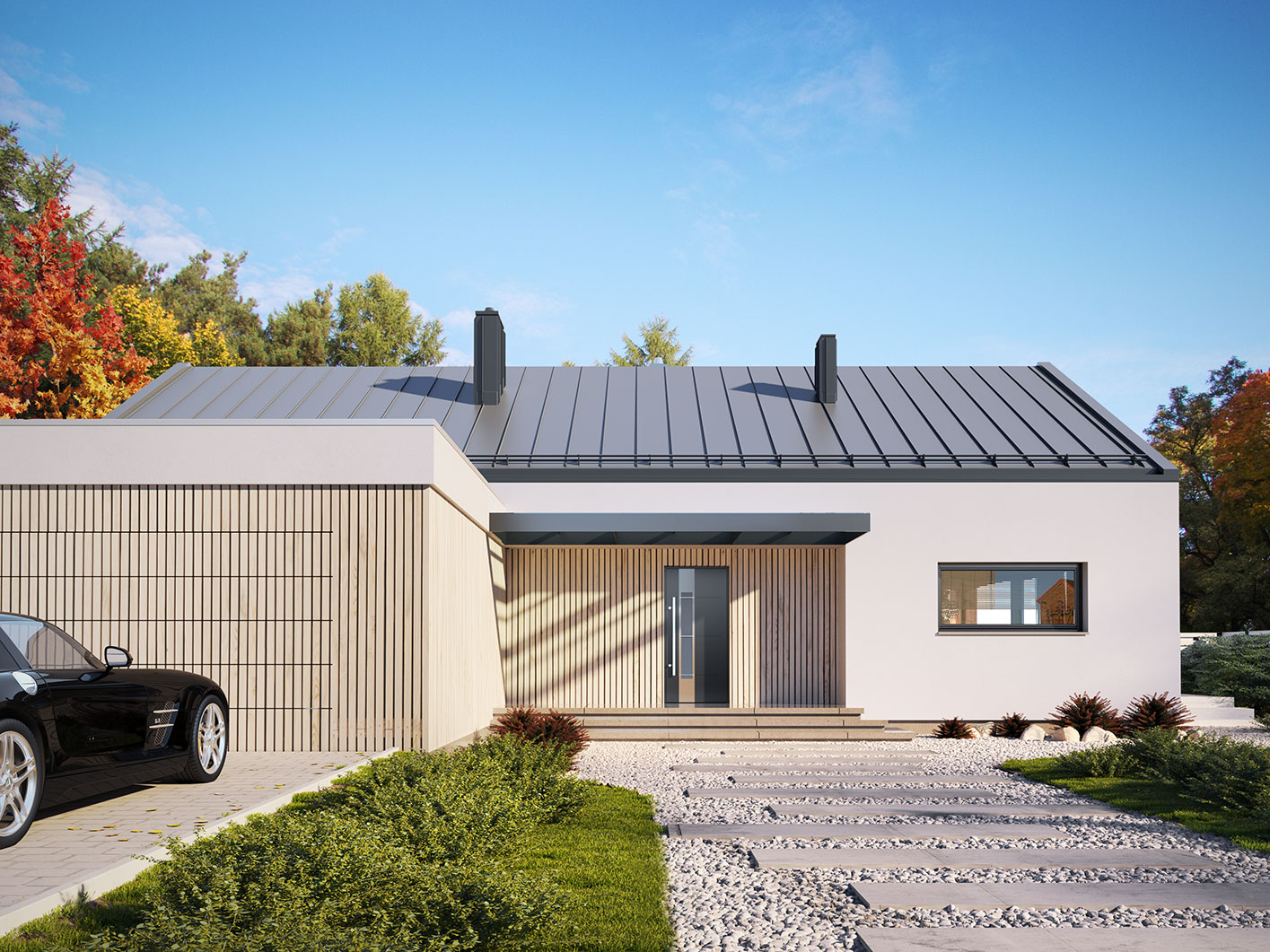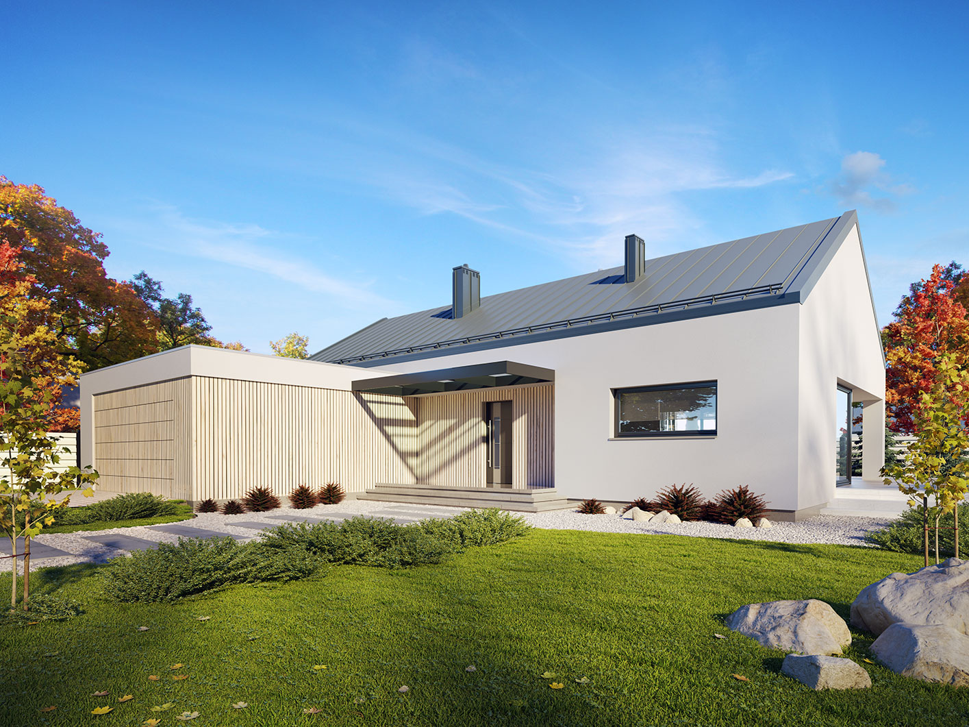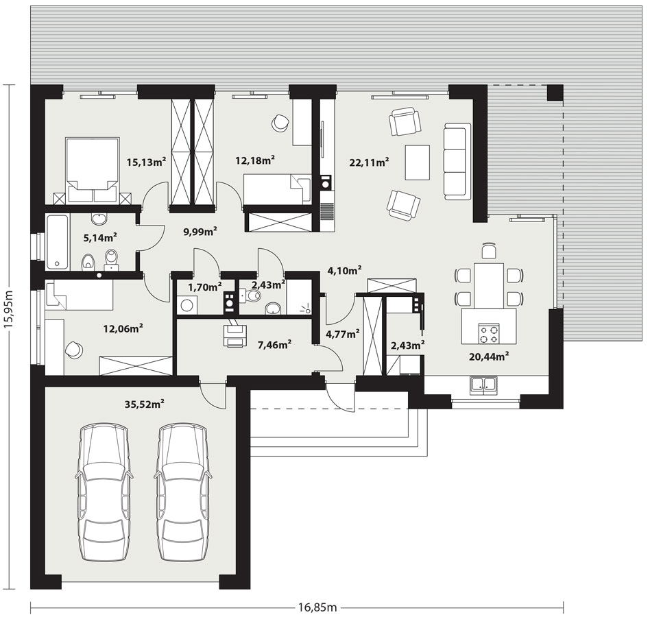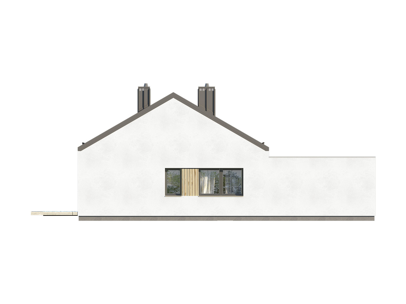 Projekt Semi 2 to propozycja nowoczesnego domu parterowego z przestronnym dwustanowiskowym garażem. Poprzez układ na rzucie prostokąta, prostą bryłę przykrytą dwuspadowym dachem bez okapów oraz szereg przeszkleń obiekt utrzymany jest w stylistyce tzw. nowoczesnej stodoły. Współczesny, minimalistyczny charakter budynku uzyskano dzięki elewacjom wykończonym białym tynkiem, urozmaiconym szalówką w kolorze naturalnego drewna, które idealnie komponują się z szarą blachą na rąbek. Dom Semi 2, który kształtem nawiązuje do tradycyjnych wzorców typowych dla terenów wiejskich, we wnętrzu zachował bardzo przejrzysty i funkcjonalny program użytkowy dla 4 osobowej rodziny. Układ domu został podzielony na 3 strefy, gdzie część dzienna to salon oraz kuchnia ze spiżarnią i narożnie przeszkloną jadalnią. Strefa intymna składa się z 3 sypialni i łazienki. Część gospodarcza to dwustanowiskowy garaż, kotłownia i pralnia. Niewątpliwym atutem projektu jest zastosowanie dużego tarasu oraz licznych przeszkleń zarówno w części dziennej, jak i w każdej z sypialni, co pozwala na otwarcie domu "na zewnątrz" i cieszenie się z pięknych, naturalnych walorów działki.