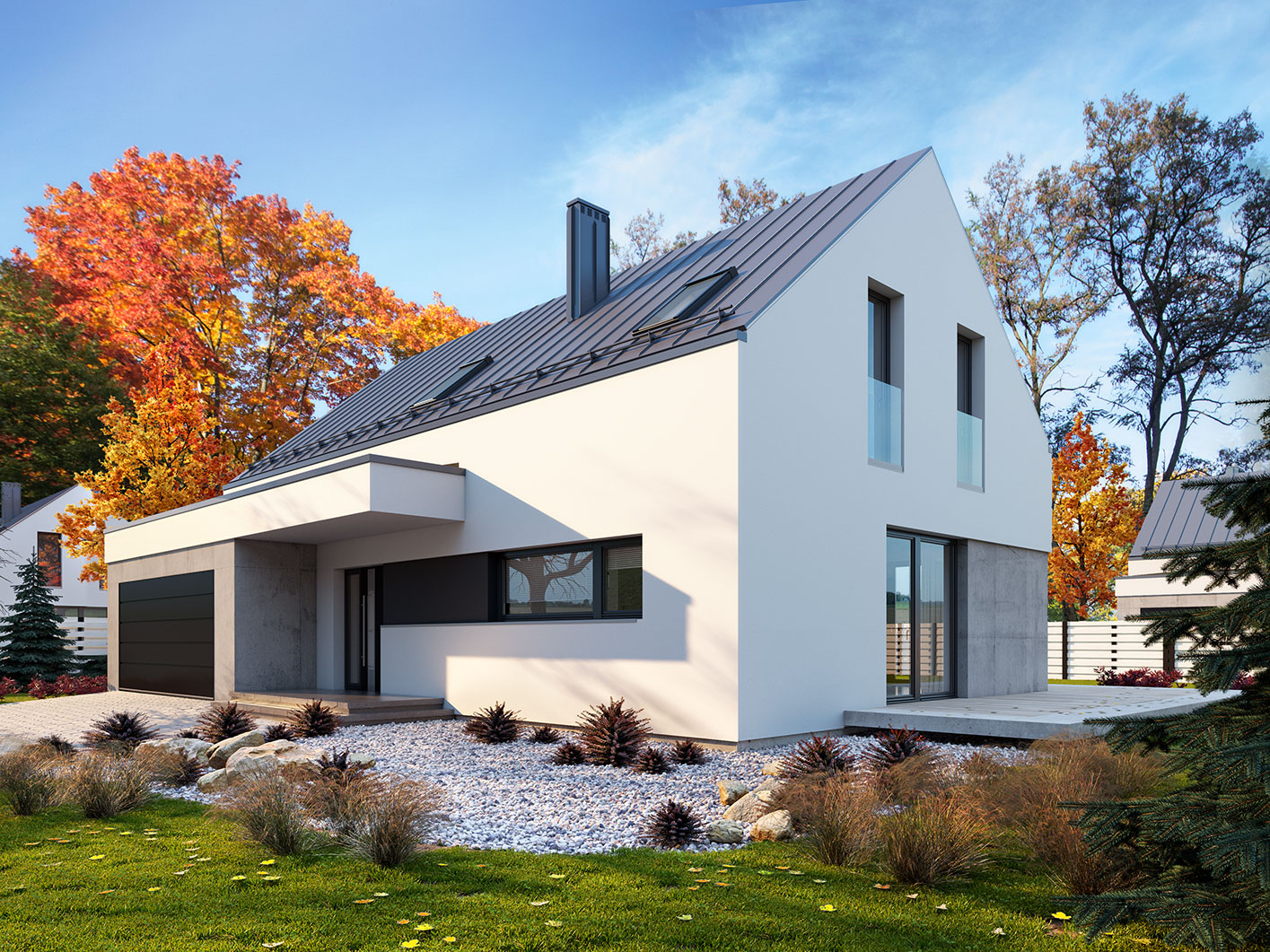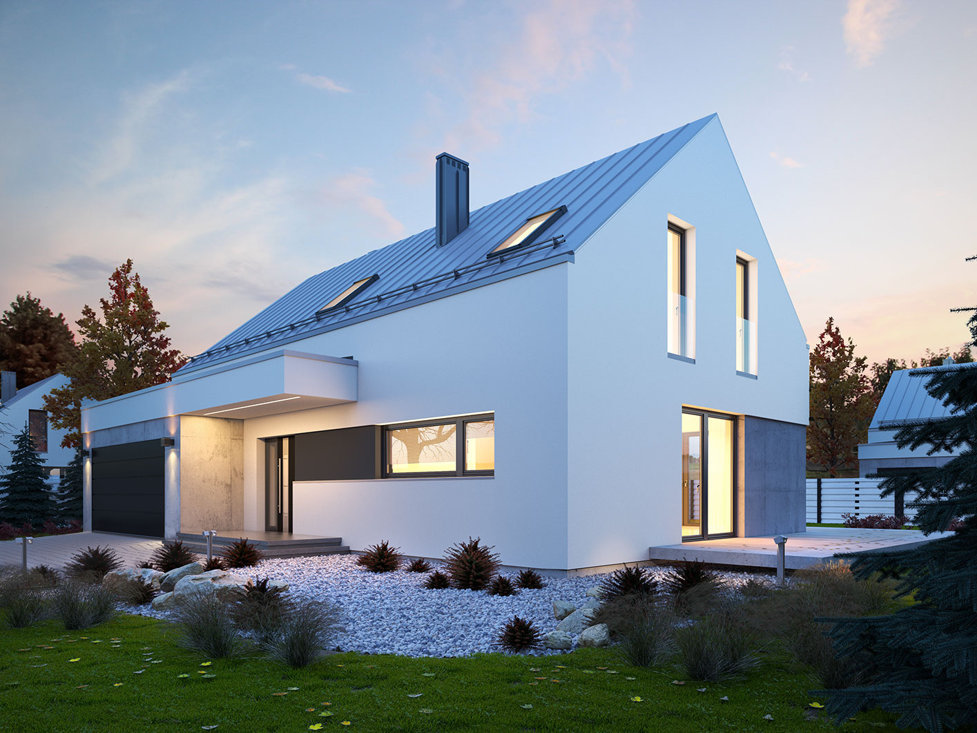 Filo 2 to jednorodzinny budynek mieszkalny, parterowy z użytkowym poddaszem i dwustanowiskowym garażem. Bogaty i funkcjonalny układ pomieszczeń gwarantuje optymalny komfort wieloosobowej rodzinie. Ergonomicznie zaprojektowana i wyraźnie podzielona przestrzeń mieszkalna składa się ze strefy dziennej, nocnej i gospodarczej. Najbardziej reprezentacyjna część domu, to salon połączony z jadalnią, który otwiera się na duży taras oraz kuchnia ze spiżarnią. Oprócz części dziennej przewidziano na parterze dodatkowy pokój, który można wykorzystać na gabinet lub kolejną sypialnię. Na poddaszu przewidziano 3 sypialnie, łazienkę oraz pralnię. Największa sypialnia posiada własną łazienkę oraz garderobę. Dużą kotłownię, na każdy rodzaj paliwa oraz jednostanowiskowy garaż zlokalizowano w części gospodarczej domu. Geometria rzutu, harmonia bryły oraz prostota nowoczesnych elewacji czynią ten dom nie tylko łatwym w eksploatacji i utrzymaniu ale również niezwykle eleganckim.