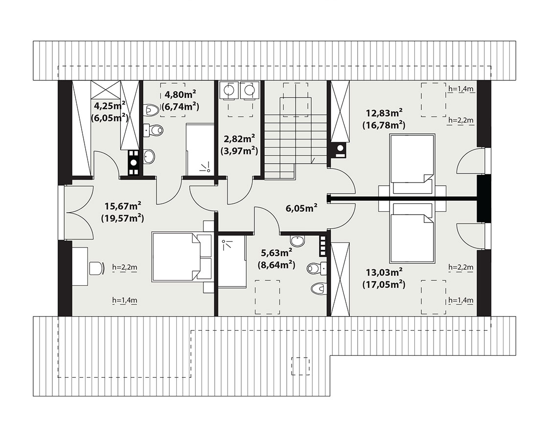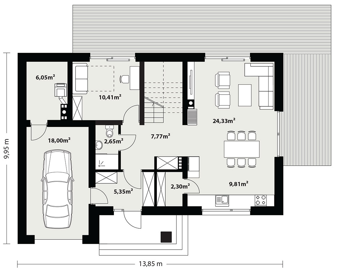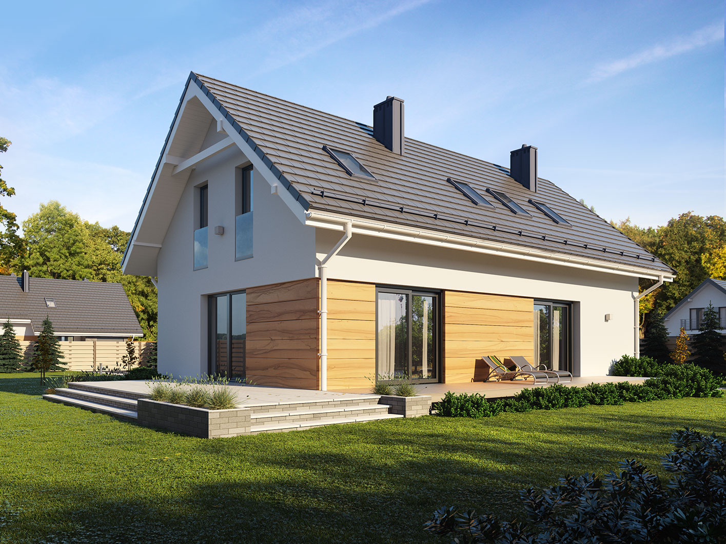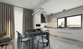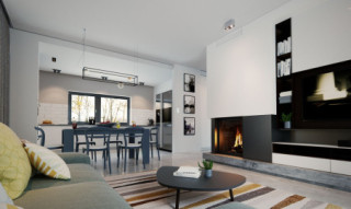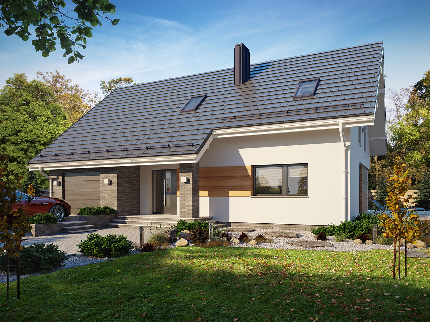 Fila to jednorodzinny budynek mieszkalny, parterowy z użytkowym poddaszem i jednostanowiskowym garażem. Bogaty i funkcjonalny układ pomieszczeń gwarantuje optymalny komfort wieloosobowej rodzinie. Ergonomicznie zaprojektowana i wyraźnie podzielona przestrzeń mieszkalna składa się ze strefy dziennej, nocnej i gospodarczej. Najbardziej reprezentacyjna część domu, to salon połączony z jadalnią, który otwiera się na duży taras oraz kuchnia ze spiżarnią i łazienką. Oprócz części dziennej przewidziano na parterze dodatkowy pokój, który można wykorzystać na gabinet lub kolejną sypialnię. Na poddaszu przewidziano 3 sypialnie, łazienkę oraz pralnię. Największa sypialnia posiada własną łazienkę oraz garderobą. Dużą kotłownię, na każdy rodzaj paliwa oraz jednostanowiskowy garaż zlokalizowano w części gospodarczej domu. Geometria rzutu, harmonia bryły oraz prostota nowoczesnych elewacji czynią ten dom nie tylko łatwym w eksploatacji i utrzymaniu ale również niezwykle eleganckim.