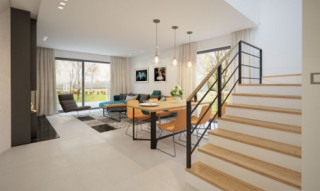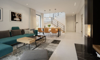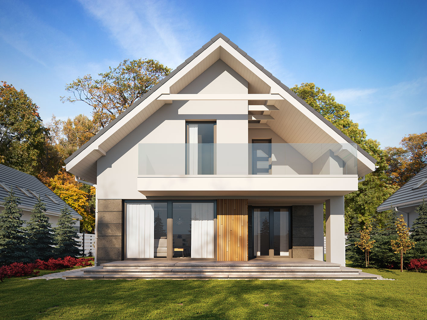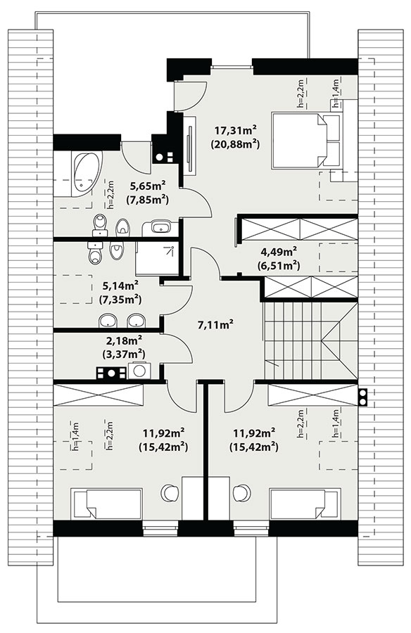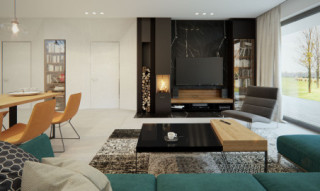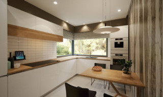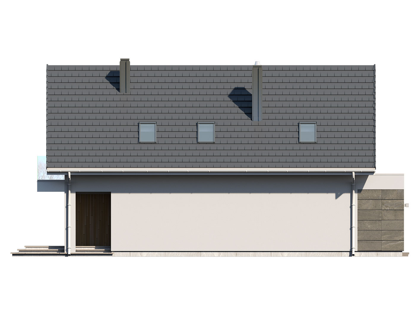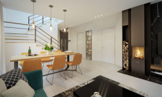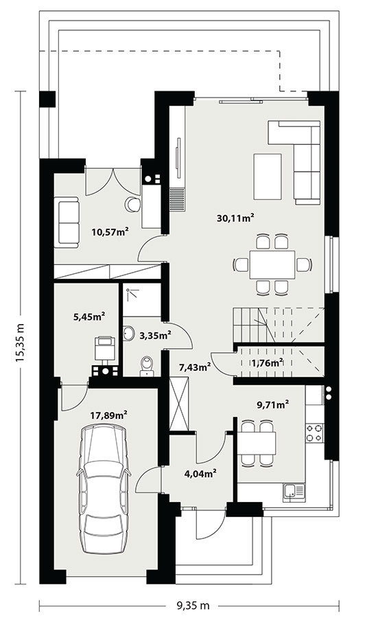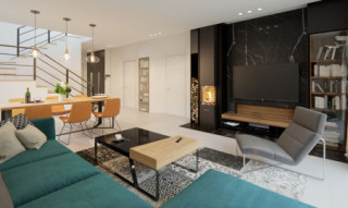 Dana to jednorodzinny budynek mieszkalny, parterowy z użytkowym poddaszem i jednostanowiskowym garażem. Projekt charakteryzuje się prostą bryłą z dwuspadowym dachem, co czyni go niedrogim w budowie i tanim w eksploatacji. Biały tynk na elewacji został urozmaicony drewnianą szalówką i szarym kamieniem, który dobrze współgra ze stolarką w tym samym odcieniu. Grafitowa płaska dachówka, szklane balustrady, biała podsufitka nadają budynkowi nowoczesnego charakteru. Ergonomicznie zaprojektowana i wyraźnie podzielona przestrzeń mieszkalna składa się ze strefy dziennej, nocnej i gospodarczej. Najbardziej reprezentacyjna część domu, to przestronny salon połączony z jadalnią, który otwiera się na duży taras oraz kuchnia ze spiżarnią i łazienką. Oprócz części dziennej przewidziano na parterze dodatkowy pokój, który można wykorzystać na gabinet lub kolejną sypialnię. Na poddaszu przewidziano 3 sypialnie, łazienkę i pralnię. Największa sypialnia ma dodatkowo własną łazienkę i garderobę. Dużą kotłownię, na każdy rodzaj paliwa oraz jednostanowiskowy garaż zlokalizowano w części gospodarczej domu.