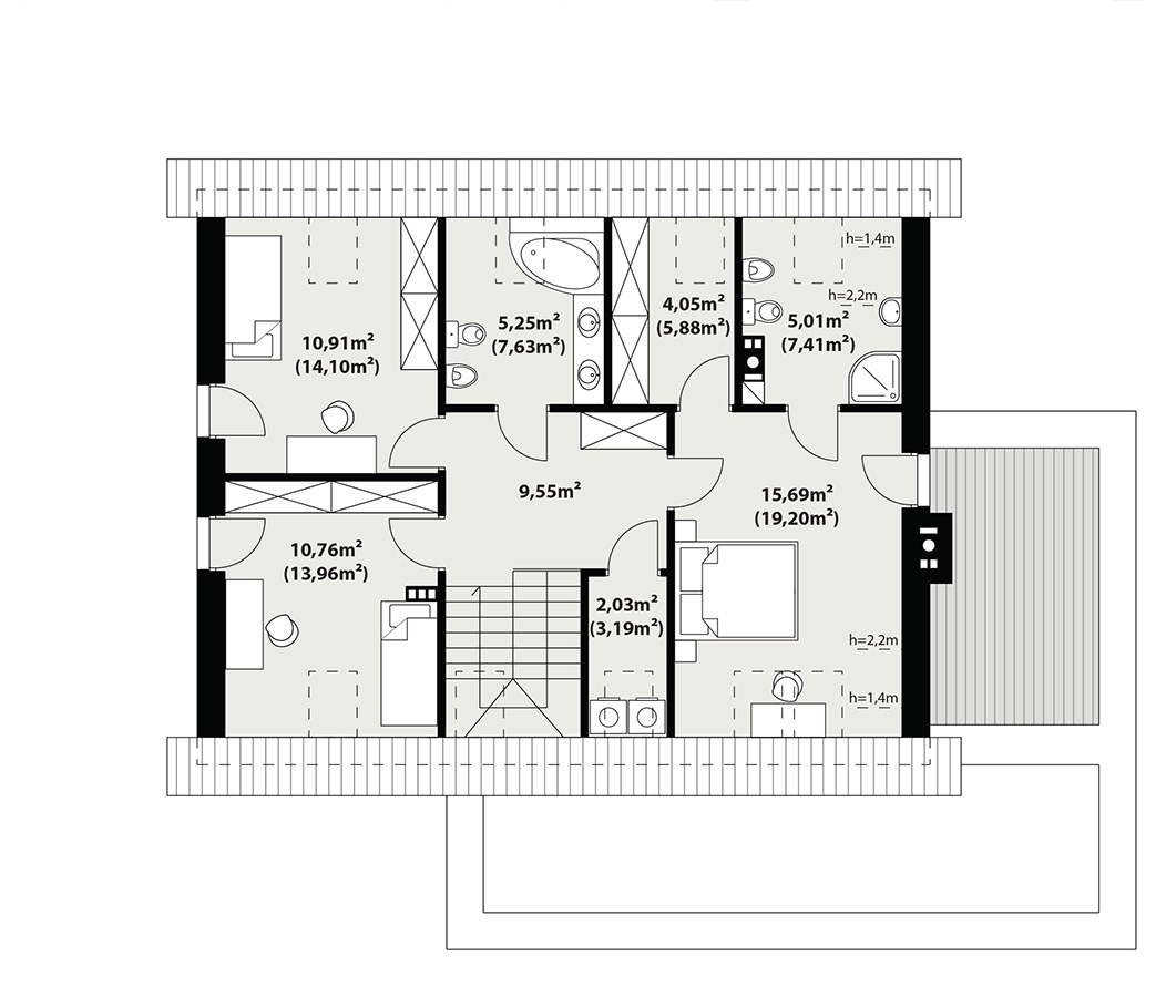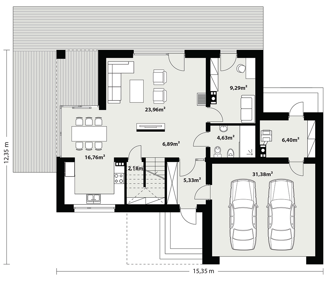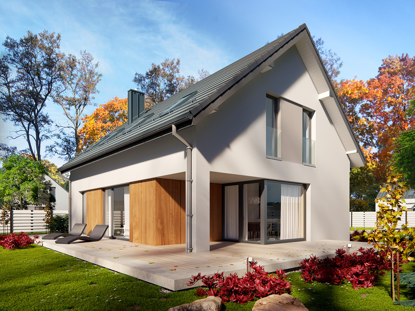 Nela 2 to jednorodzinny budynek mieszkalny, parterowy z użytkowym poddaszem i dwustanowiskowym garażem. Bogaty i funkcjonalny układ pomieszczeń gwarantuje optymalny komfort wieloosobowej rodzinie. Ergonomicznie zaprojektowana i wyraźnie podzielona przestrzeń mieszkalna składa się ze strefy dziennej, nocnej i gospodarczej. Najbardziej reprezentacyjna część domu to przestronny salon, przeszklona jadalnia, która otwiera się na duży taras oraz kuchnia ze spiżarnią. Oprócz części dziennej przewidziano na parterze dodatkowy pokój, który można wykorzystać na gabinet lub kolejną sypialnię oraz łazienkę. Na poddaszu przewidziano 3 sypialnie, łazienkę oraz pralnię. Największa sypialnia posiada własną łazienkę oraz garderobą. Dużą kotłownię, na każdy rodzaj paliwa oraz dwustanowiskowy garaż zlokalizowano w części gospodarczej domu. Geometria rzutu, harmonia bryły oraz prostota nowoczesnych elewacji czynią ten dom nie tylko łatwym w eksploatacji i utrzymaniu ale również niezwykle eleganckim.