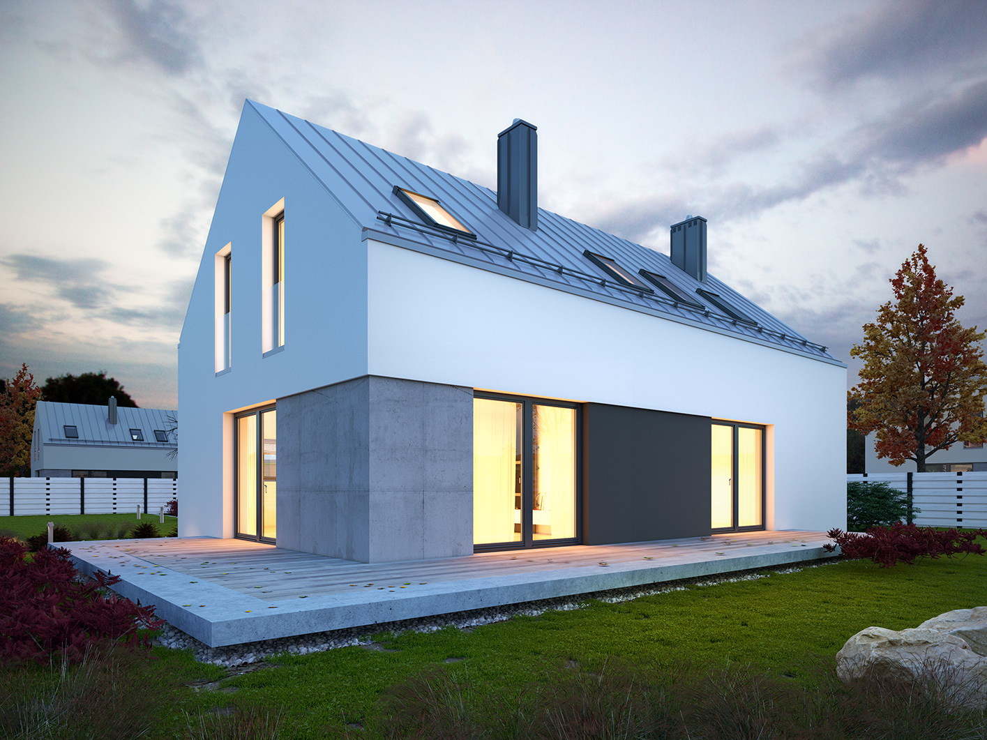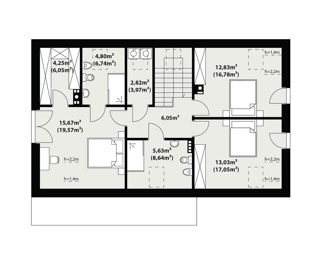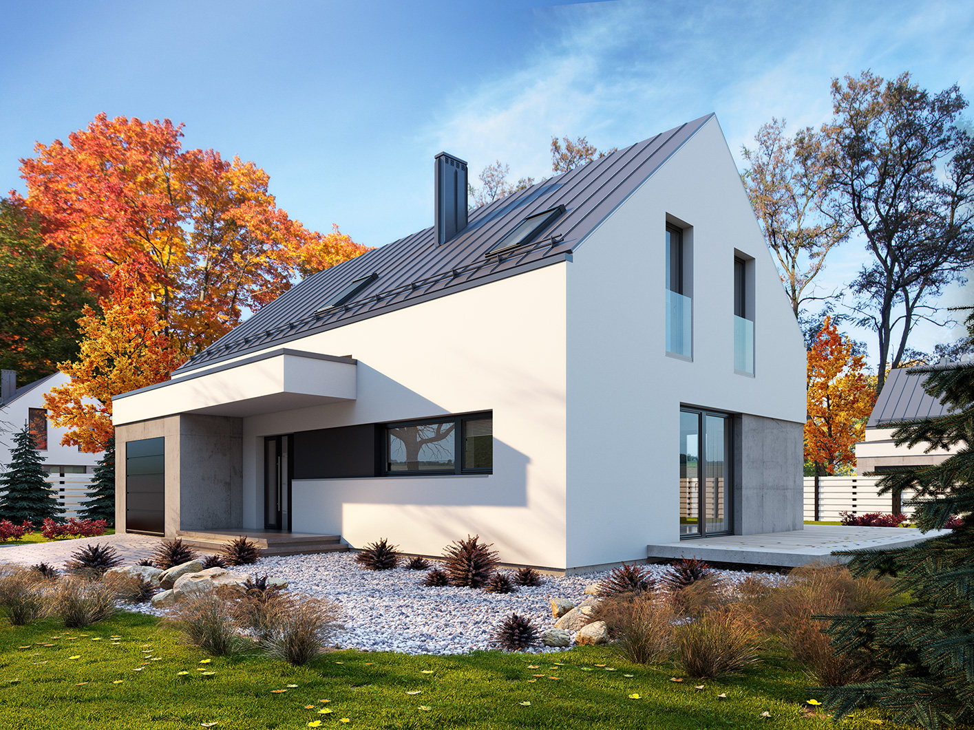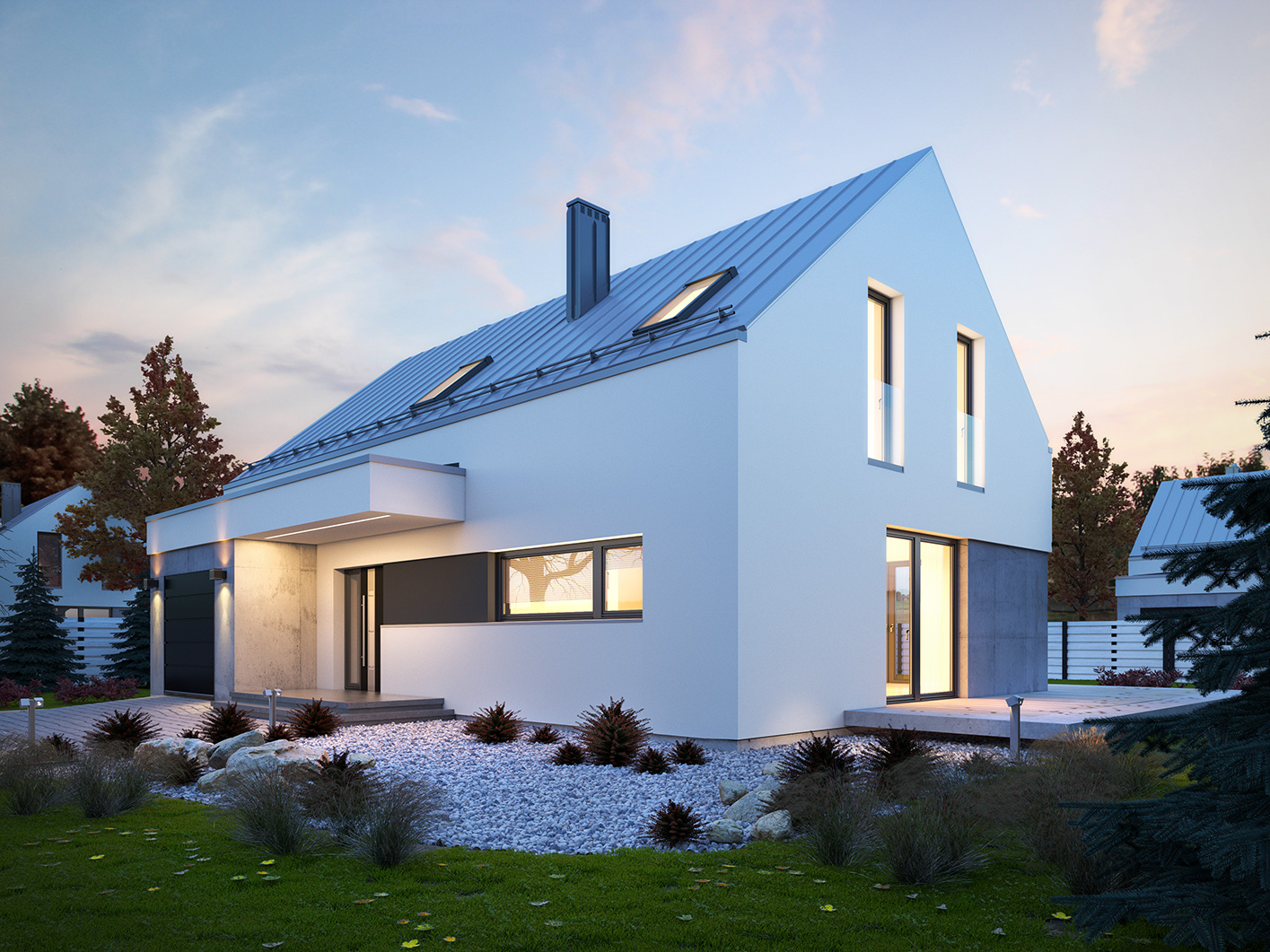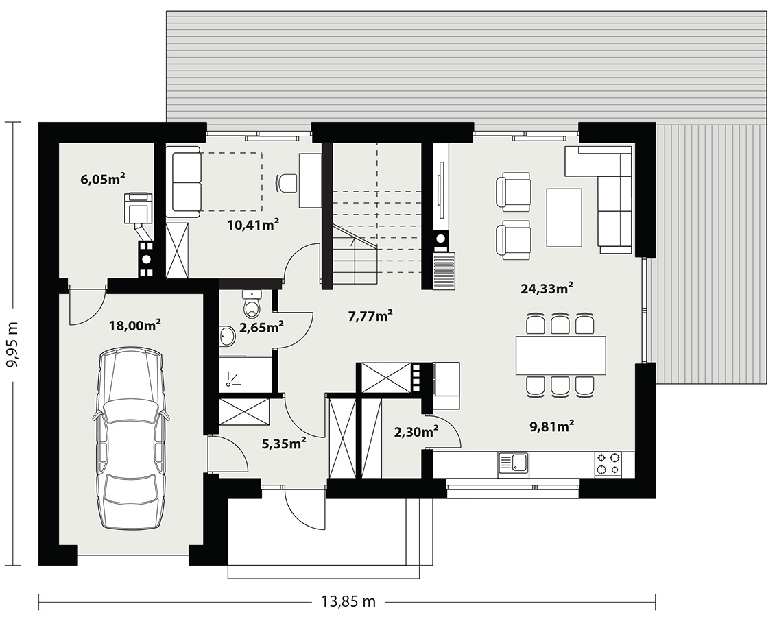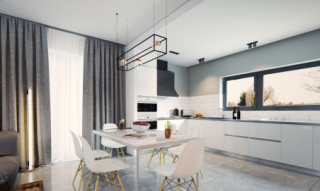 Filo to jednorodzinny budynek mieszkalny, parterowy z użytkowym poddaszem i jednostanowiskowym garażem. Bogaty i funkcjonalny układ pomieszczeń gwarantuje optymalny komfort wieloosobowej rodzinie. Ergonomicznie zaprojektowana i wyraźnie podzielona przestrzeń mieszkalna składa się ze strefy dziennej, nocnej i gospodarczej. Najbardziej reprezentacyjna część domu, to salon połączony z jadalnią, który otwiera się na duży taras oraz kuchnia ze spiżarnią. Oprócz części dziennej przewidziano na parterze dodatkowy pokój, który można wykorzystać na gabinet lub kolejną sypialnię. Na poddaszu przewidziano 3 sypialnie, łazienkę oraz pralnię. Największa sypialnia posiada własną łazienkę oraz garderobę. Dużą kotłownię, na każdy rodzaj paliwa oraz jednostanowiskowy garaż zlokalizowano w części gospodarczej domu. Geometria rzutu, harmonia bryły oraz prostota nowoczesnych elewacji czynią ten dom nie tylko łatwym w eksploatacji i utrzymaniu ale również niezwykle eleganckim.