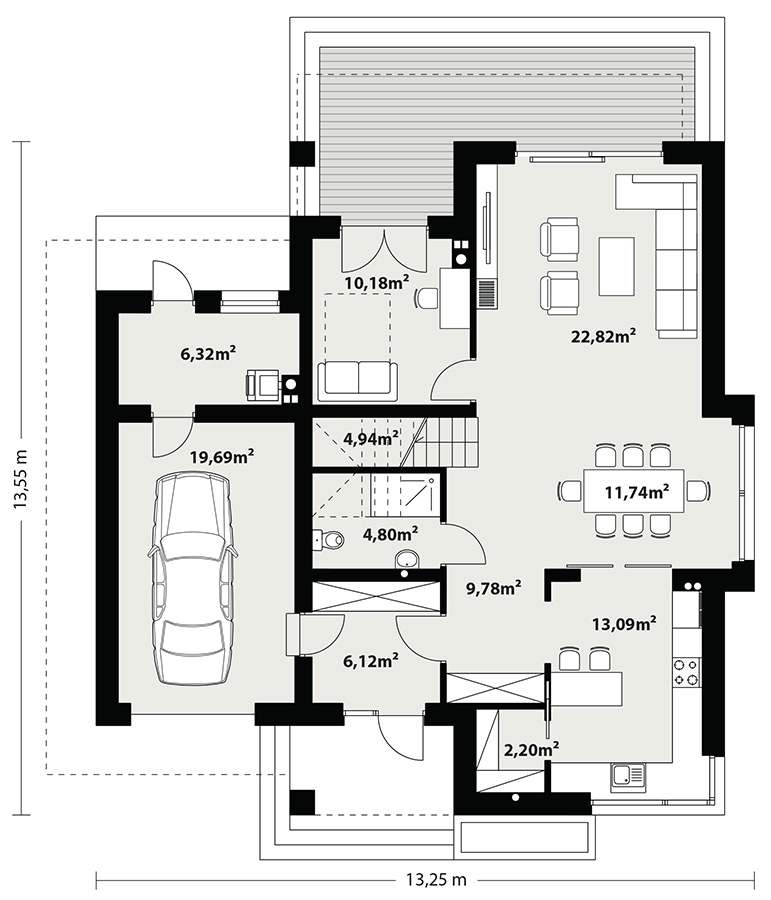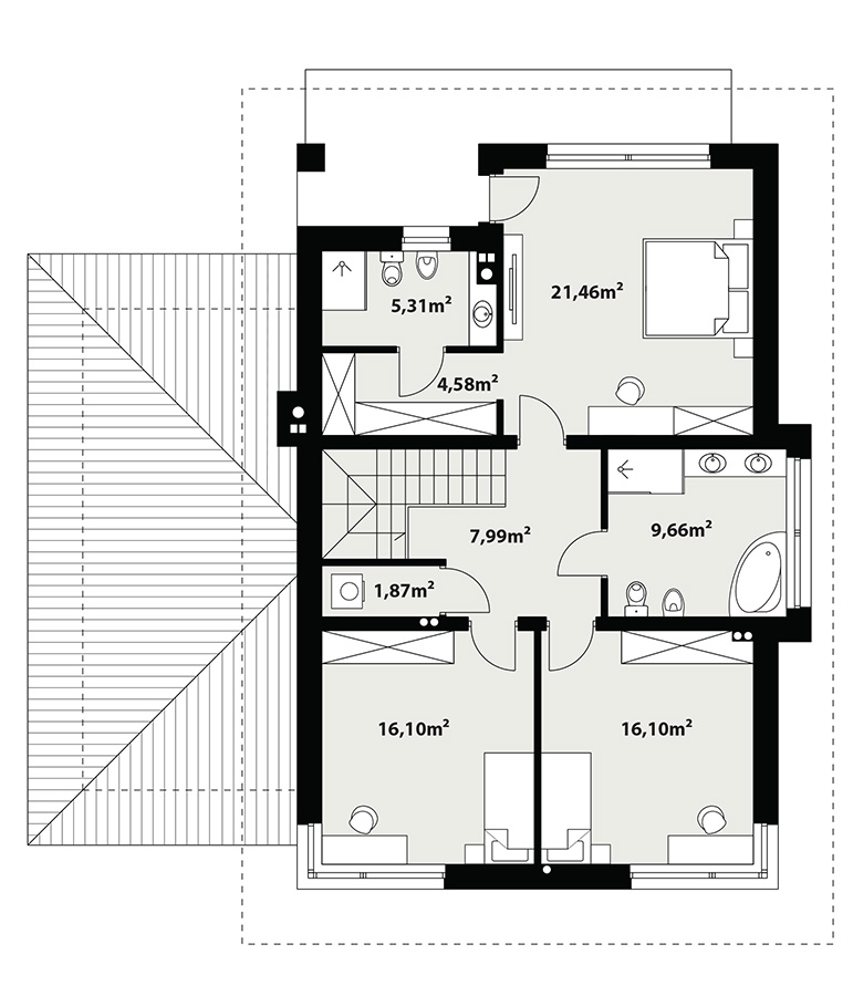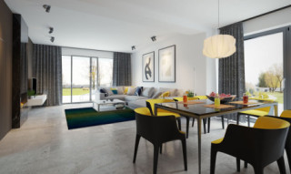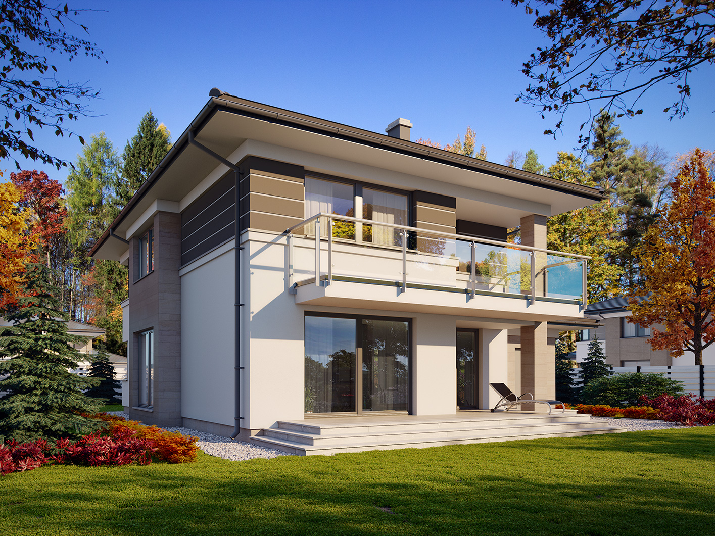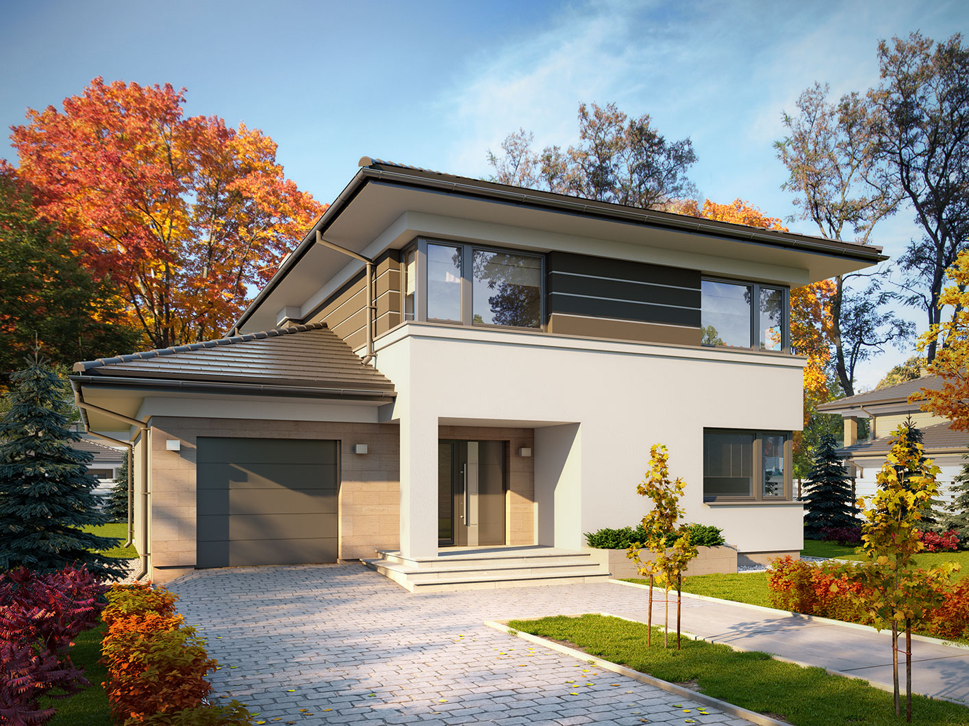 Enes, to bardzo interesujący projekt nowoczesnego domu piętrowego przeznaczonego dla 4-osobowej rodziny. Ta typowo miejska rezydencja o reprezentacyjnym wyglądzie i optymalnej powierzchni użytkowej posiada bogaty program funkcjonalny, rozłożony na dwóch pełnych kondygnacyjnych, który zapewni komfort nawet dla wymagających inwestorów. Parter zaprojektowano jako otwartą przestrzeń dzienną, złożoną z połączonego salonu, jadalni i kuchni ze spiżarnią. Przewidziano tutaj także dodatkowy pokój, który można wykorzystać jako gabinet lub dodatkową sypialnię. Na parterze znajduje się również duża kotłownia, na każdy rodzaj paliwa oraz jednostanowiskowy garaż . Na piętrze zaprojektowano 3 sypialnie i łazienkę. Główna sypialnia ma zapewnioną własną garderobę oraz łazienkę. Taką dodatkową przestrzeń można według potrzeb przerobić np. na kącik do pracy. Karat zachwyca ciekawą, ponadczasową, klasyczną bryłą ujętą we współczesny elegancki wizerunek. Rezydencja ta stanowi doskonałą propozycję dla inwestorów poszukujących komfortowego domu w estetycznym wydaniu.