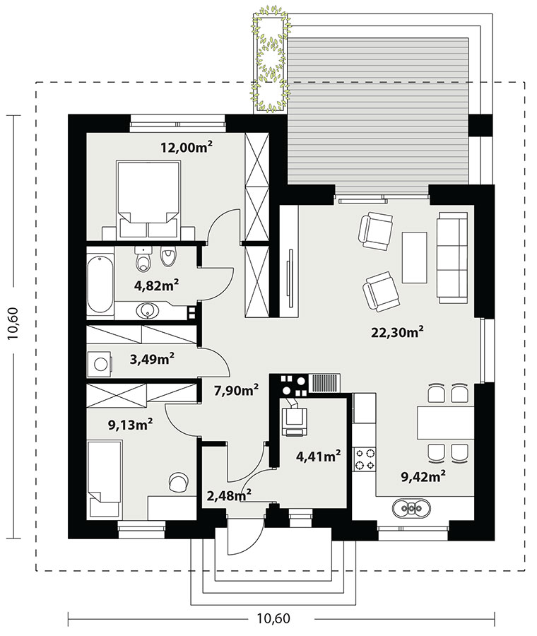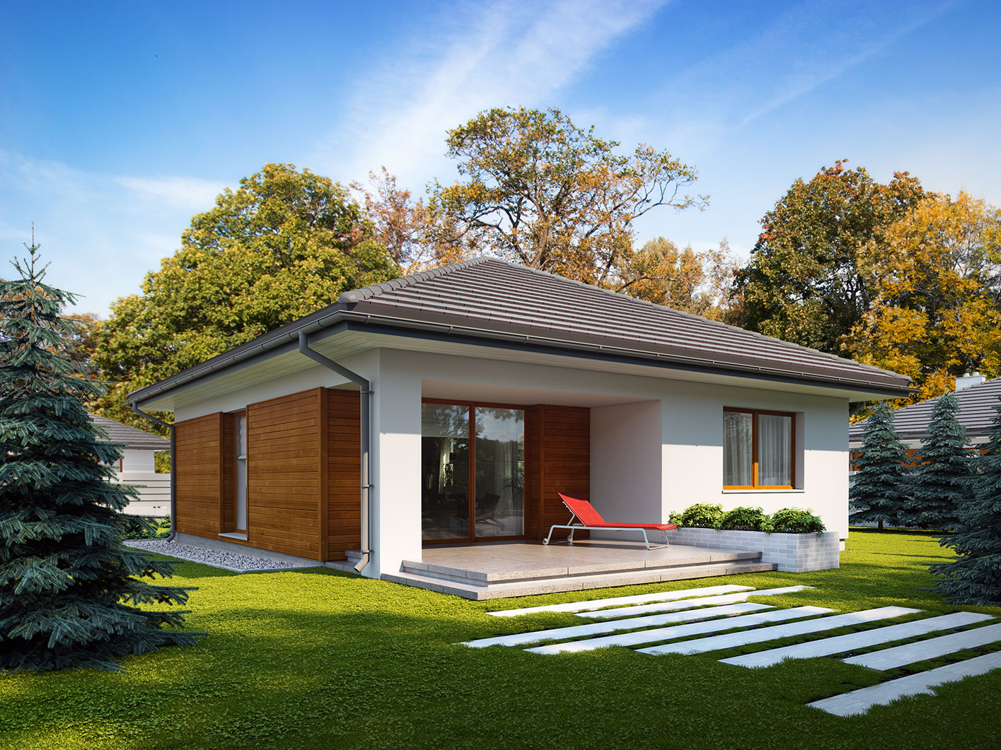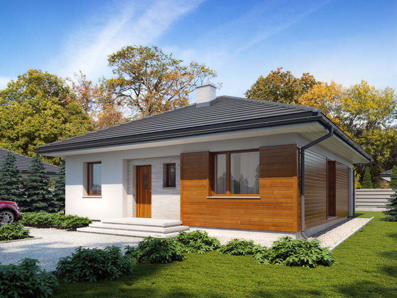 Elsa to projekt niedużego, parterowego domu jednorodzinnego zapewniającego optymalne potrzeby 3-4-osobowej rodziny. Jest to dom bardzo funkcjonalny z wyraźnym podziałem na strefy. Przestronna część dzienna to proste i klasyczne połączenie salonu, jadalni i kuchni, zaś strefa intymna składa się z 2 sypialni i łazienki. Plusem projektu jest dodatkowe pomieszczenie gospodarcze, które można przeznaczyć na pralnię lub spiżarnię. Dom posiada duży taras umożliwiający spędzanie czasu na świeżym powietrzu niezależnie od warunków pogodowych. Wejście do domu jest przez niewielki podcień chroniący przed deszczem i słońcem. Z samego wiatrołapu prowadzi wejście do dużej kotłowni na każdy rodzaj paliwa. Bryła budynku zamknięta jest na rzucie kwadratu, przykrytego czterospadowym dachem. Taka forma budynku czyni go prostym w budowie i tanim w eksploatacji.