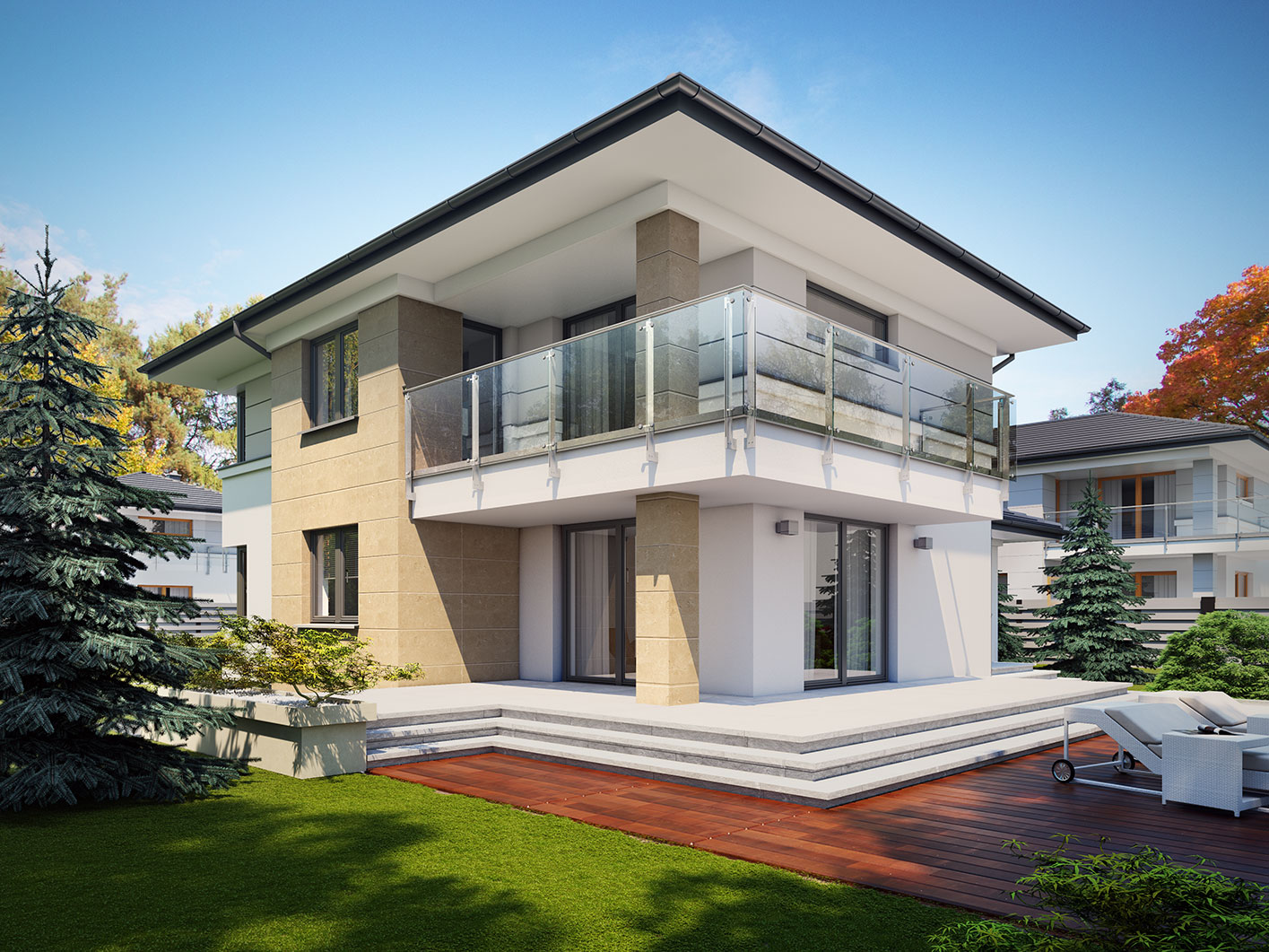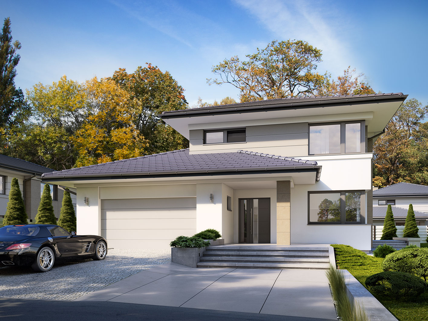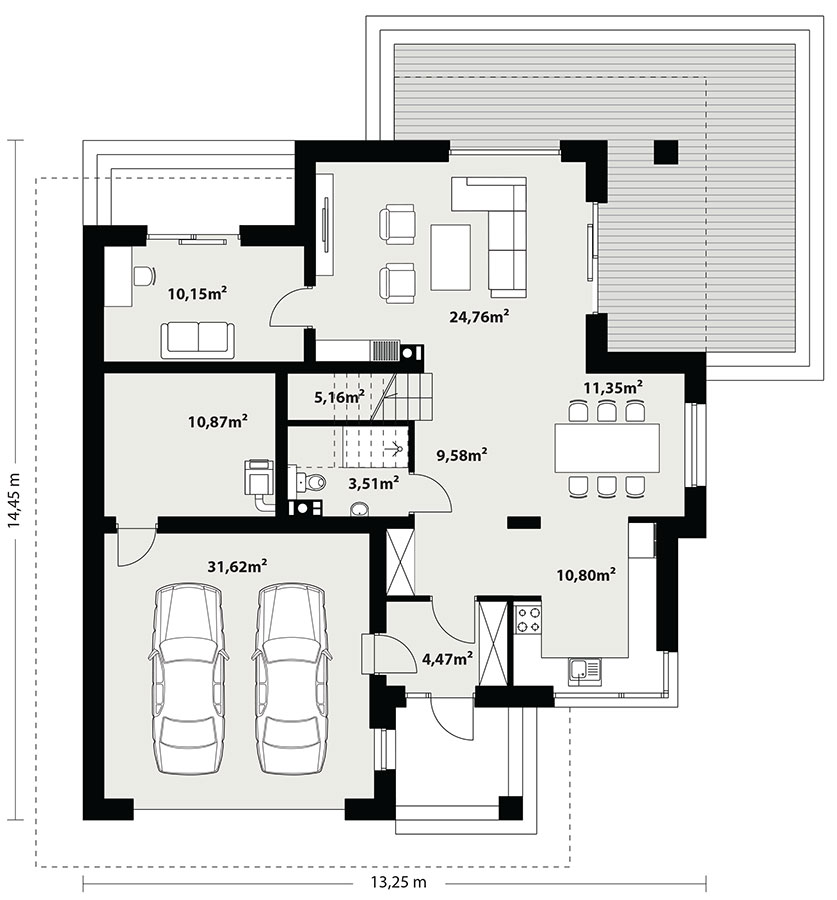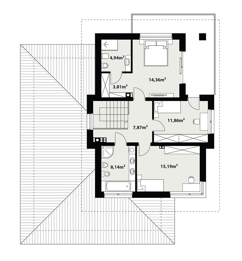 Karat 5, to projekt eleganckiego, nowoczesnego domu piętrowego przeznaczonego dla 4-osobowej rodziny. Jest to typowo miejska rezydencja o reprezentacyjnym wyglądzie i optymalnej powierzchni użytkowej. Posiada bogaty program fukncjonalny, rozłożony na dwóch pełnych kondygnacyjnych, który zapewni komfort wymagającym inwestorom. Parter zaprojektowano jako otwartą przestrzeń dzienną, złożoną z połączonego salonu, jadalni i kuchni. Przewidziano tam również dodatkowy pokój, który można wykorzystać na gabinet lub sypialnię. Na parterze znajduje się również duża kotłownia, na każdy rodzaj paliwa oraz dwustanowiskowy garaż. Na piętrze zaprojektowano 3 sypialnie i łazienkę. Główna sypialnia ma zapewnioną własną garderobę oraz łazienkę. Taką dodatkową przestrzeń można według potrzeb przerobić np. na kącik do pracy. Karat 5 zachwyca ciekawą, ponadczasową, klasyczną bryłą ujętą we współczesny elegancki wizerunek. Rezydencja ta stanowi doskonałą propozycję dla inwestorów poszukujących komfortowego domu w estetycznym wydaniu.
