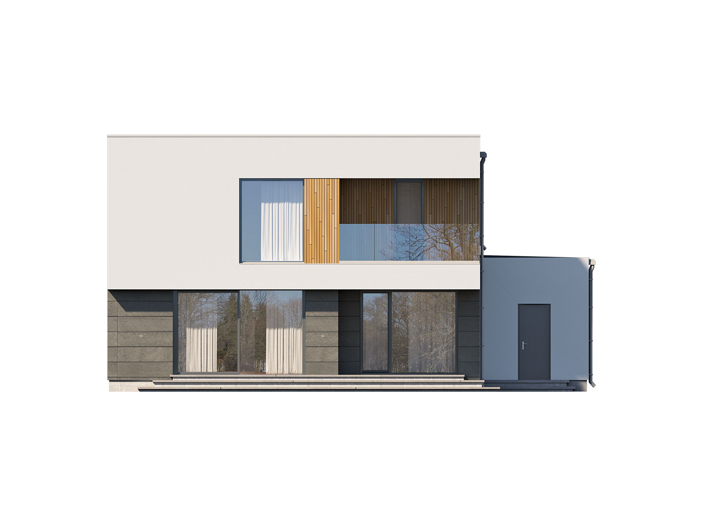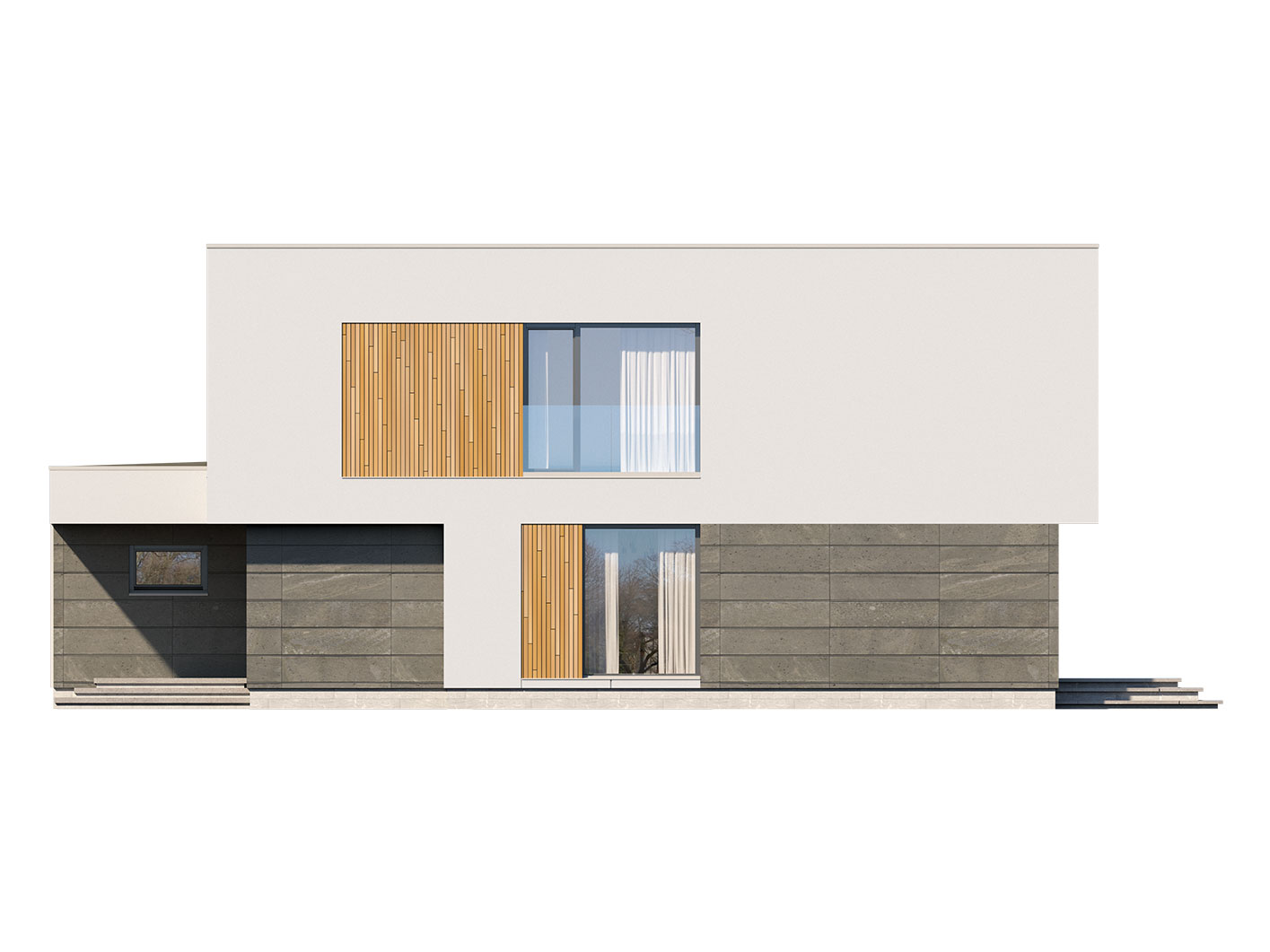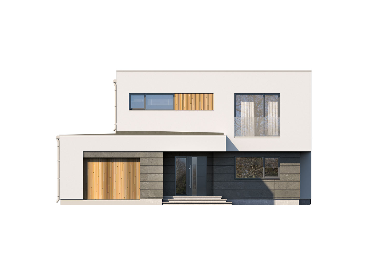Mateo to interesująca propozycja domu skierowana do inwestorów ceniących prostotę i minimalizm w nowoczesnym wydaniu. To przykład eleganckiej wielkomiejskiej willi przeznaczonej dla 4 -osobowej rodziny. Bryłę tego piętrowego domu, przykryto płaskim dachem, na elewacjach na piętrze pojawia się biały tynk, którego surowość „ociepla” drewniana szalówka, natomiast parter został "ubrany" w zimny ciemny kamień. Zastosowane materiały i podziały elewacji, a także kontrast brył parteru i piętra świetnie ze sobą współgrają nadając budynkowi elegancki charakter i klimat współczesnych willi. Elementami determinującymi bryłę są przeszklenia w dziennej części budynku. Tworzą one szerokie otwarcie na otaczającą zieleń oraz rozległy, przykryty częściowo taras. W tej eleganckiej, nowoczesnej formie budynku ujęty został optymalny program użytkowy. W części dziennej pojawił się przestronny salon z otwartą jadalnią oraz kuchnia, a także gabinet, który można przerobić na dodatkową sypialnię. W części nocnej znalazły się 3 sypialnie z łazienką oraz pralnią. Główna sypialnia posiada dodatkowo 2 garderoby i odrębną łazienkę. W części gospodarczej przewidziano jednostanowiskowy garaż oraz dużą kotłownię. Mateo zachwyca ciekawą, ale zarazem prostą bryłą. Rezydencja ta stanowi doskonałą propozycję dla inwestorów poszukujących komfortowego domu w nowoczesnym, estetycznym i eleganckim wydaniu.