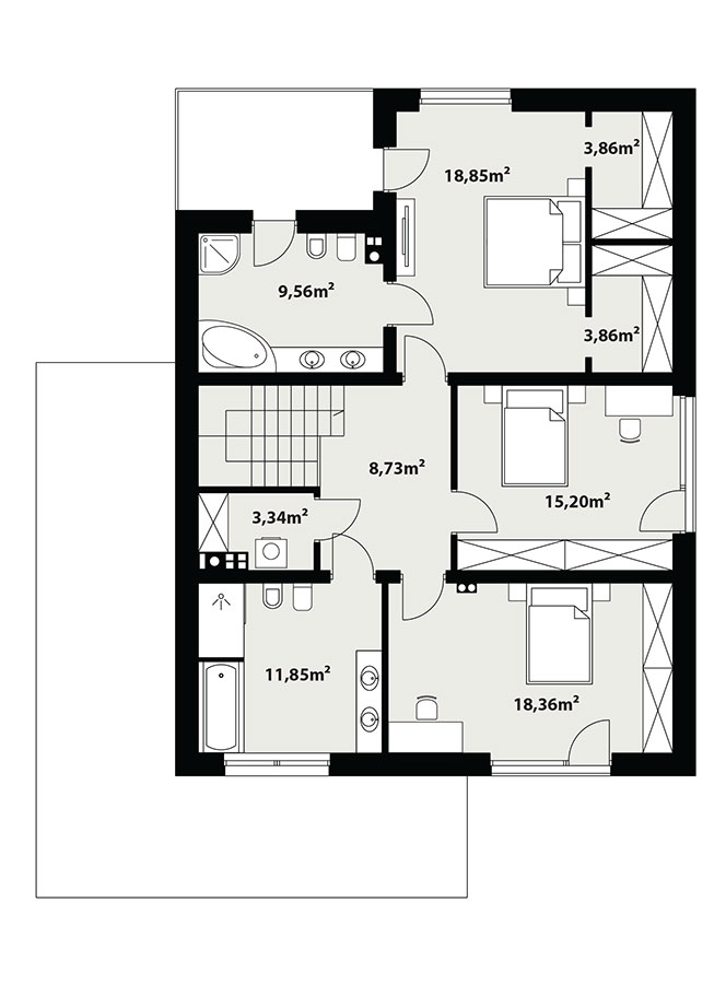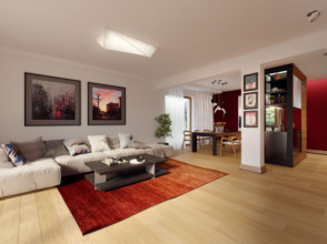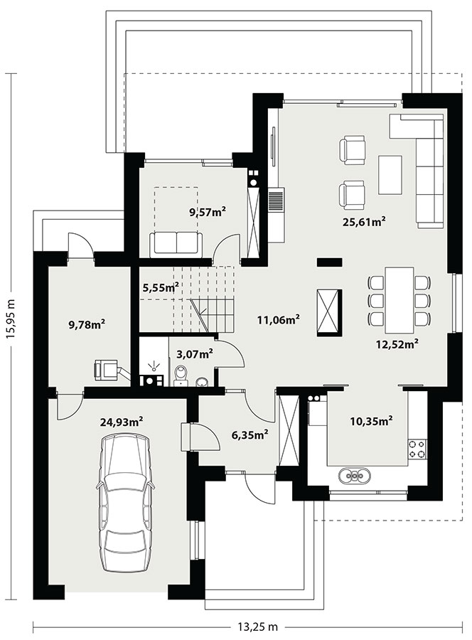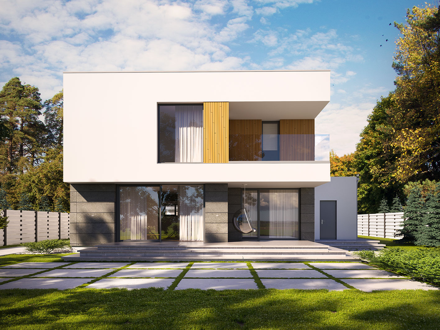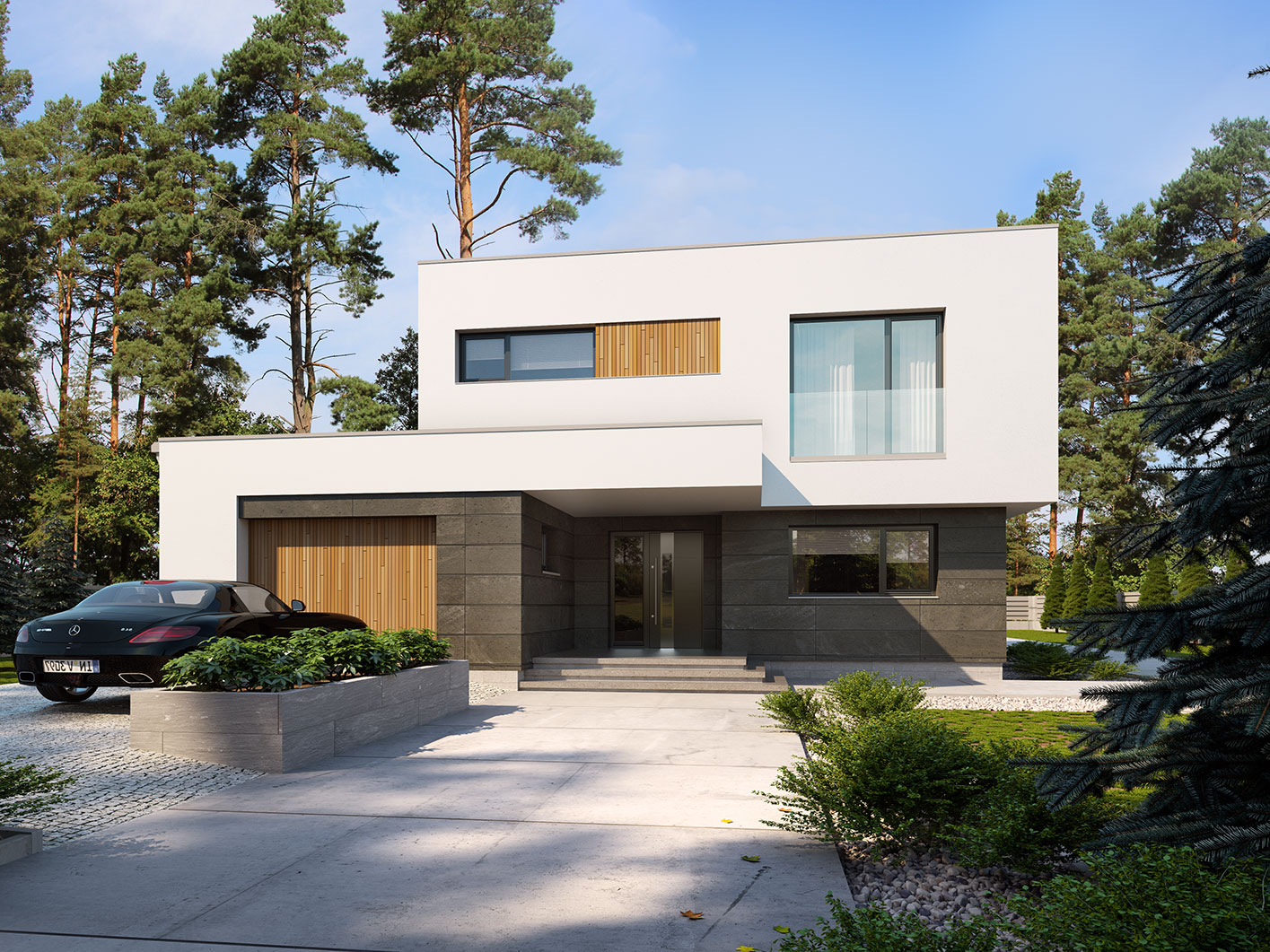 Mateo to interesująca propozycja domu skierowana do inwestorów ceniących prostotę i minimalizm w nowoczesnym wydaniu. To przykład eleganckiej wielkomiejskiej willi przeznaczonej dla 4 -osobowej rodziny. Bryłę tego piętrowego domu, przykryto płaskim dachem, na elewacjach na piętrze pojawia się biały tynk, którego surowość „ociepla” drewniana szalówka, natomiast parter został "ubrany" w zimny ciemny kamień. Zastosowane materiały i podziały elewacji, a także kontrast brył parteru i piętra świetnie ze sobą współgrają nadając budynkowi elegancki charakter i klimat współczesnych willi. Elementami determinującymi bryłę są przeszklenia w dziennej części budynku. Tworzą one szerokie otwarcie na otaczającą zieleń oraz rozległy, przykryty częściowo taras. W tej eleganckiej, nowoczesnej formie budynku ujęty został optymalny program użytkowy. W części dziennej pojawił się przestronny salon z otwartą jadalnią oraz kuchnia, a także gabinet, który można przerobić na dodatkową sypialnię. W części nocnej znalazły się 3 sypialnie z łazienką oraz pralnią. Główna sypialnia posiada dodatkowo 2 garderoby i odrębną łazienkę. W części gospodarczej przewidziano jednostanowiskowy garaż oraz dużą kotłownię. Mateo zachwyca ciekawą, ale zarazem prostą bryłą. Rezydencja ta stanowi doskonałą propozycję dla inwestorów poszukujących komfortowego domu w nowoczesnym, estetycznym i eleganckim wydaniu.