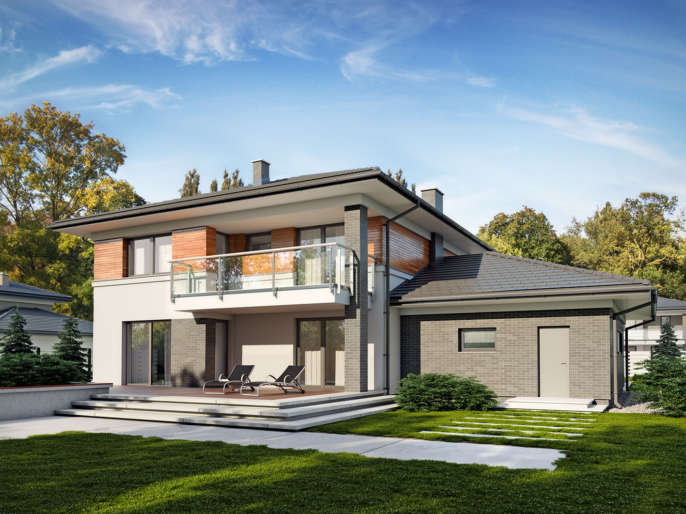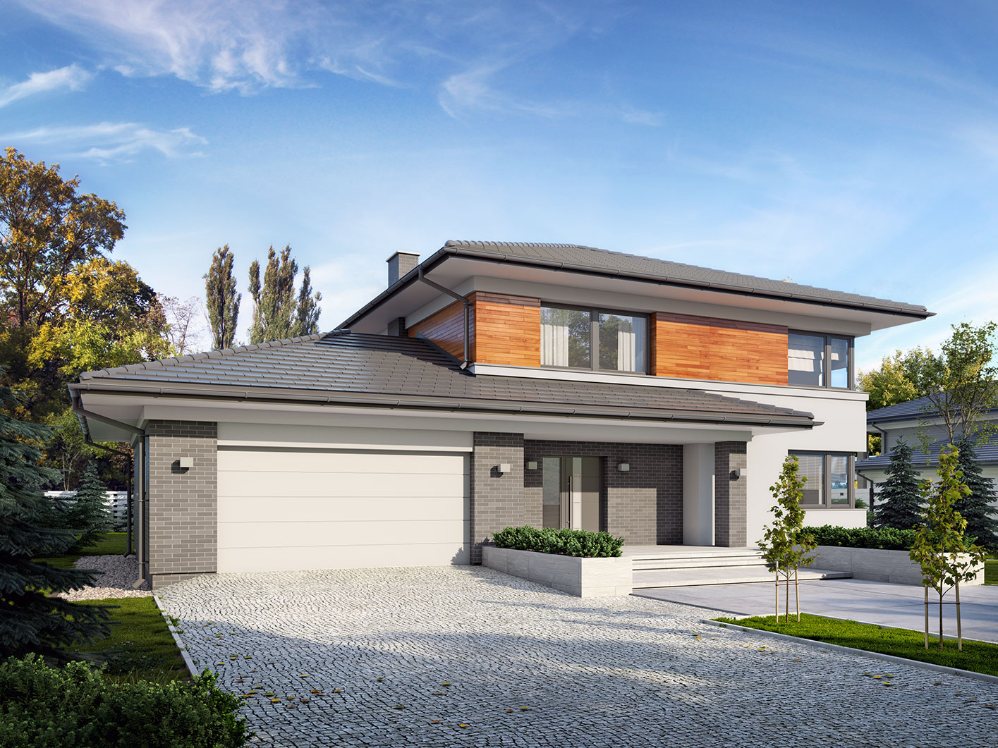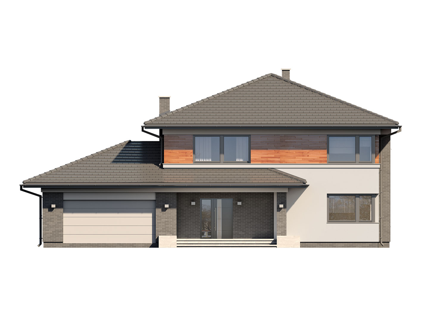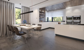 Kleo, to projekt reprezentacyjnego domu piętrowego przeznaczonego dla 5-osobowej rodziny. Jest to typowo miejska rezydencja o nowoczesnym wyglądzie i optymalnej powierzchni użytkowej. Posiada bogaty program funkcjonalny, rozłożony na dwóch pełnych kondygnacyjnych, który zapewni komfort nawet dla wymagających inwestorów. Parter zaprojektowano jako otwartą przestrzeń dzienną, złożoną z połączonego salonu, jadalni i kuchni. Przewidziano tutaj także dodatkowy pokój, który można wykorzystać jako gabinet lub dodatkową sypialnię. Na parterze znajduje się również duża kotłownia, na każdy rodzaj paliwa oraz dwustanowiskowy garaż. Na piętrze zaprojektowano 4 sypialnie, łazienkę i pralnię. Kleo zachwyca wysmakowaną, ponadczasową, klasyczną bryłą ujętą we współczesny elegancki wizerunek. Rezydencja ta stanowi doskonałą propozycję dla inwestorów poszukujących komfortowego domu w estetycznym wydaniu.