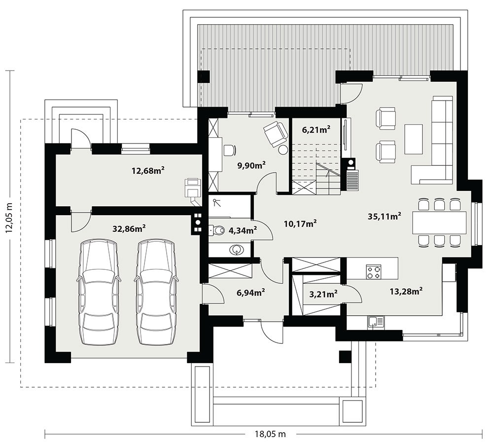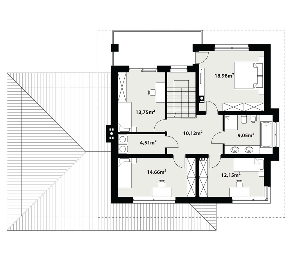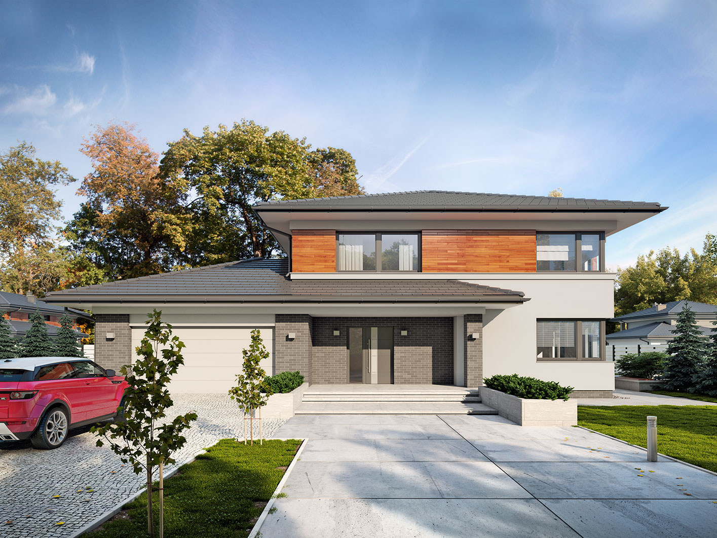 Kleo, to projekt reprezentacyjnego domu piętrowego przeznaczonego dla 5-osobowej rodziny. Jest to typowo miejska rezydencja o nowoczesnym wyglądzie i optymalnej powierzchni użytkowej. Posiada bogaty program funkcjonalny, rozłożony na dwóch pełnych kondygnacyjnych, który zapewni komfort nawet dla wymagających inwestorów. Parter zaprojektowano jako otwartą przestrzeń dzienną, złożoną z połączonego salonu, jadalni i kuchni. Przewidziano tutaj także dodatkowy pokój, który można wykorzystać jako gabinet lub dodatkową sypialnię. Na parterze znajduje się również duża kotłownia, na każdy rodzaj paliwa oraz dwustanowiskowy garaż. Na piętrze zaprojektowano 4 sypialnie, łazienkę i pralnię. Kleo zachwyca wysmakowaną, ponadczasową, klasyczną bryłą ujętą we współczesny elegancki wizerunek. Rezydencja ta stanowi doskonałą propozycję dla inwestorów poszukujących komfortowego domu w estetycznym wydaniu.