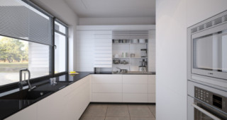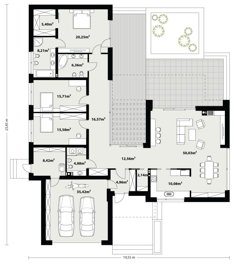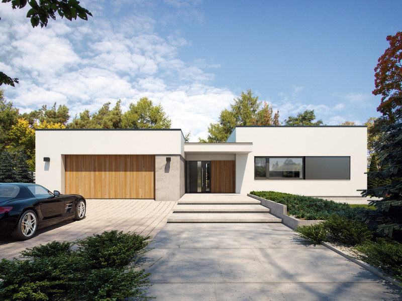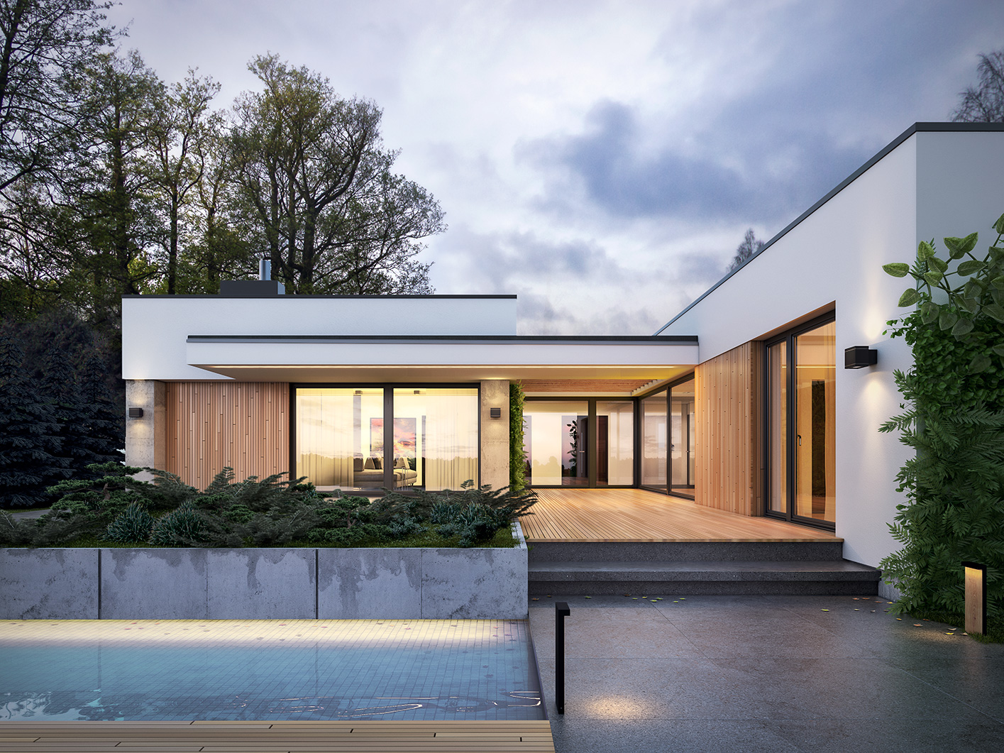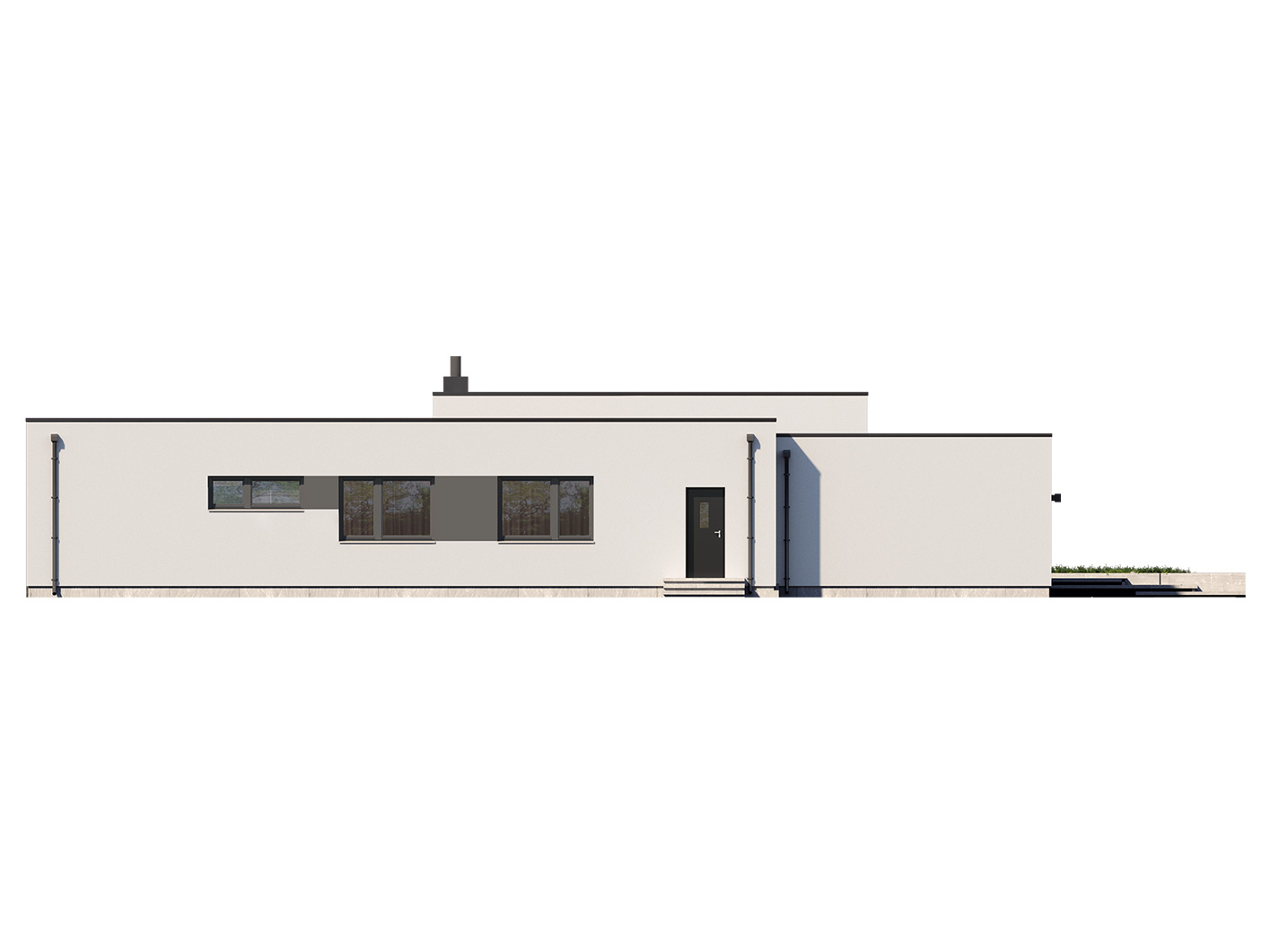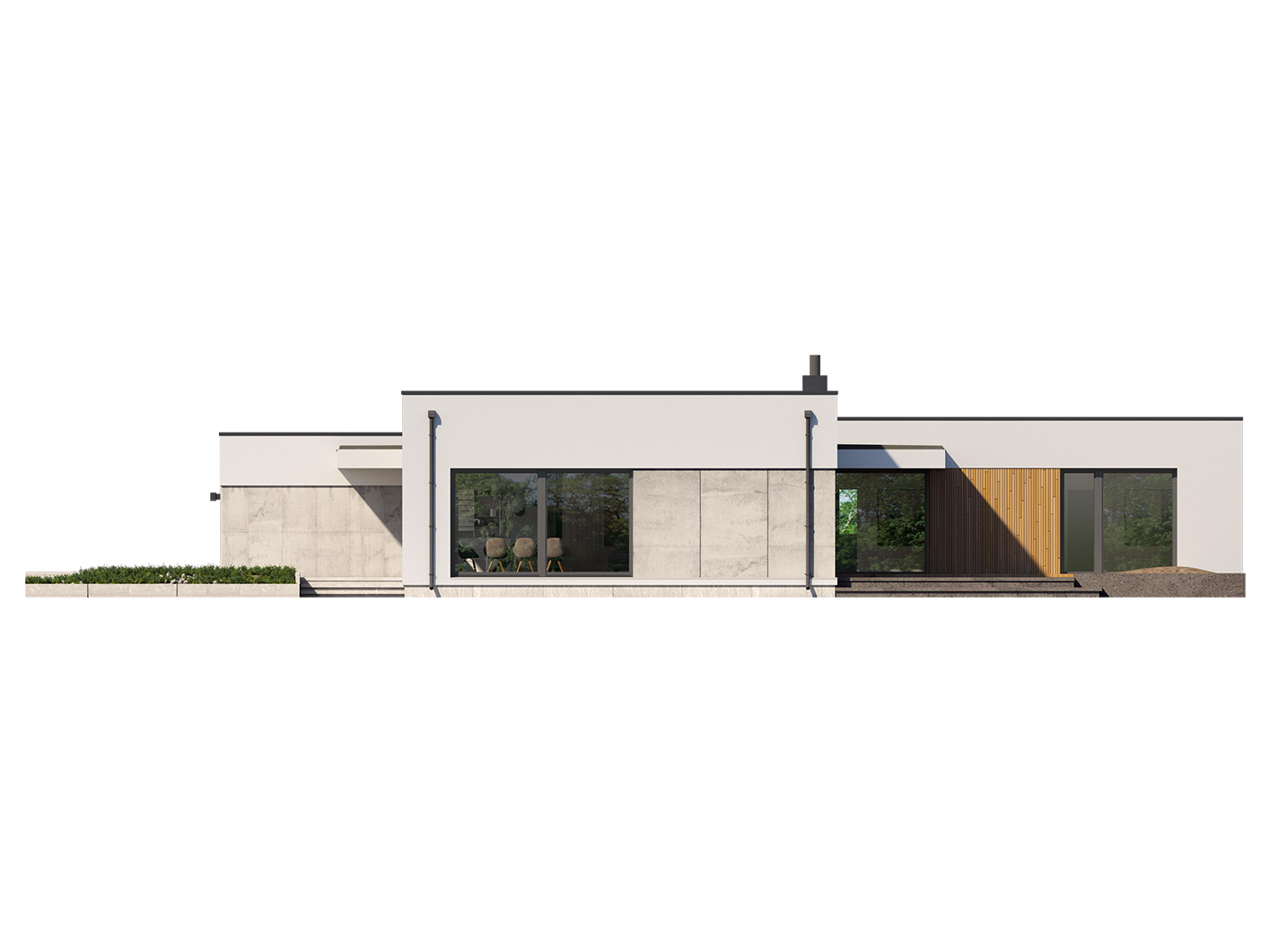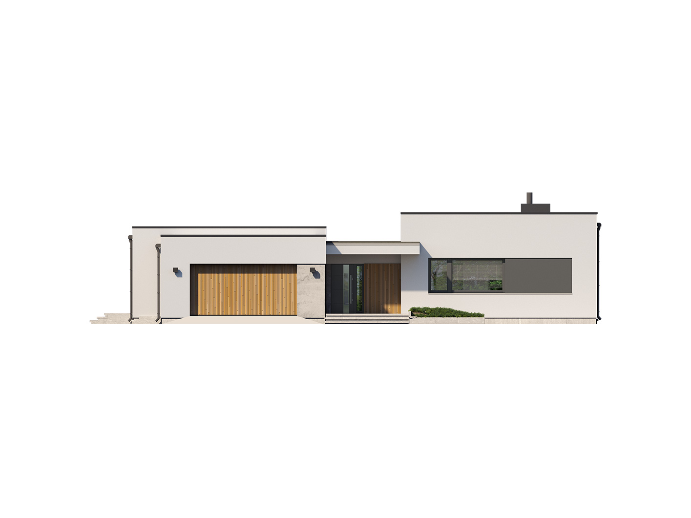 Agos to ciekawa propozycja domu skierowana do inwestorów ceniących wielkomiejski szyk i minimalizm w nowoczesnym wydaniu. Bryłę tego parterowego domu, przykryto płaskim dachem, na elewacjach pojawiają się tynk i kamienne płyty, których surowość "ociepla" drewniana szalówka. Zastosowane materiały i podziały elewacji, świetnie ze sobą współgrają nadając budynkowi elegancki charakter i wielkomiejski klimat nowoczesnych willi. Elementami determinującymi bryłę jest szereg przeszkleń, pojawiających się w każdej strefie domu ( dziennej, nocnej i wejściowej). Tworzą one szerokie otwarcia na rozległe, przykryte częściowo tarasy. Kształtują także formę budynku, chociażby komponując "zielone" patio, przykryte pergolą. W tej eleganckiej, nowoczesnej formie budynku ujęty został optymalny program użytkowy. W części dziennej pojawił się przestronny salon z otwartą jadalnią oraz kuchnia ze spiżarnią. W części nocnej znalazły się 3 sypialnie z łazienką. Główna sypialnia posiada dodatkowo garderobę i odrębną łazienkę. W części gospodarczej przewidziano dwustanowiskowy garaż, kotłownię oraz wc z pralnią.