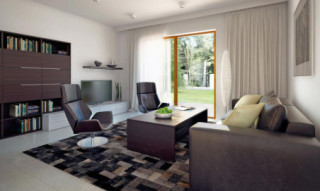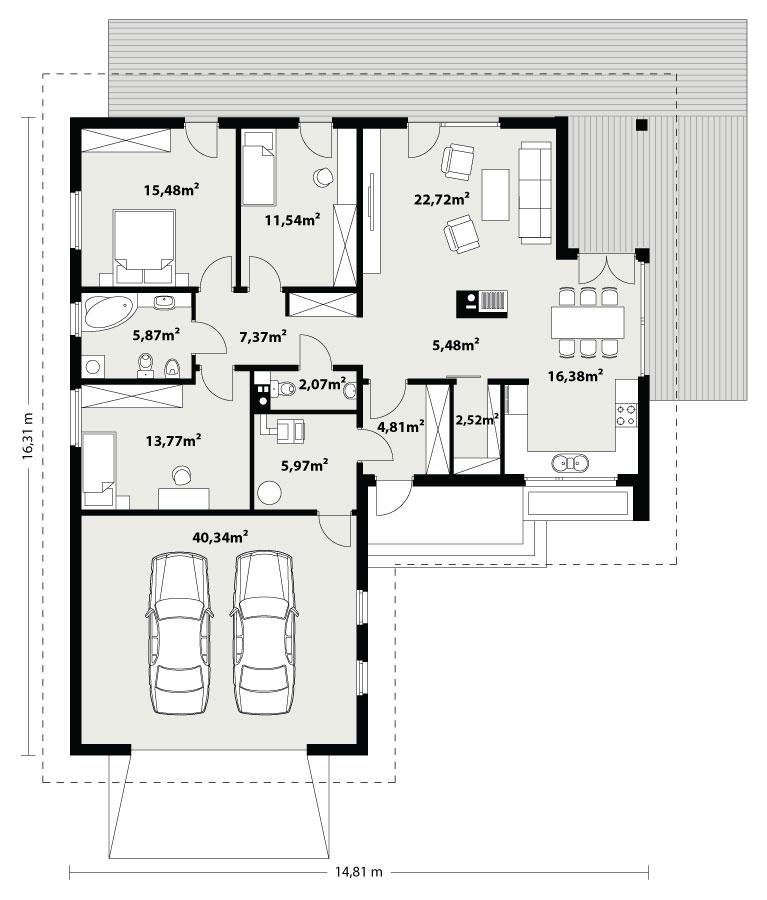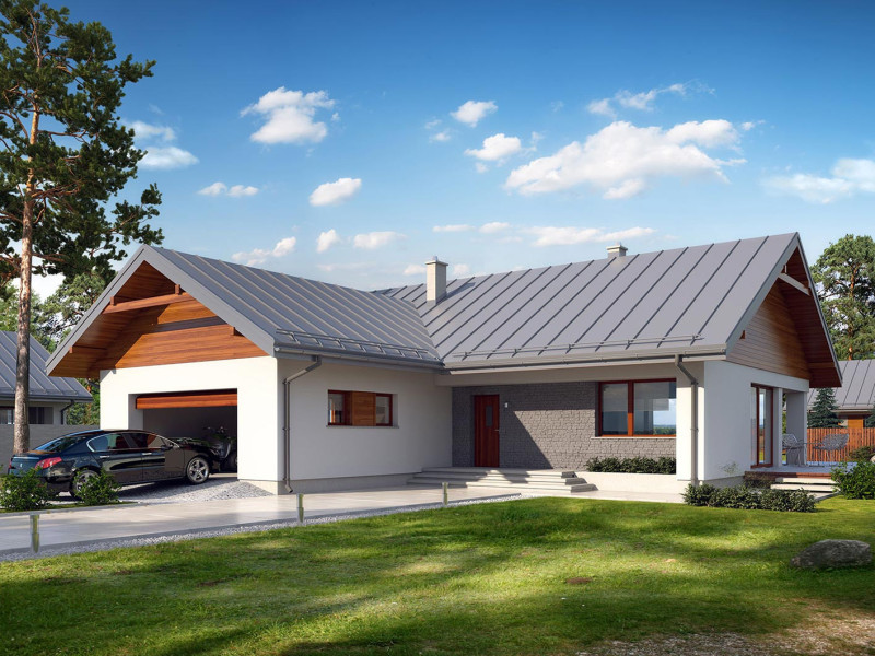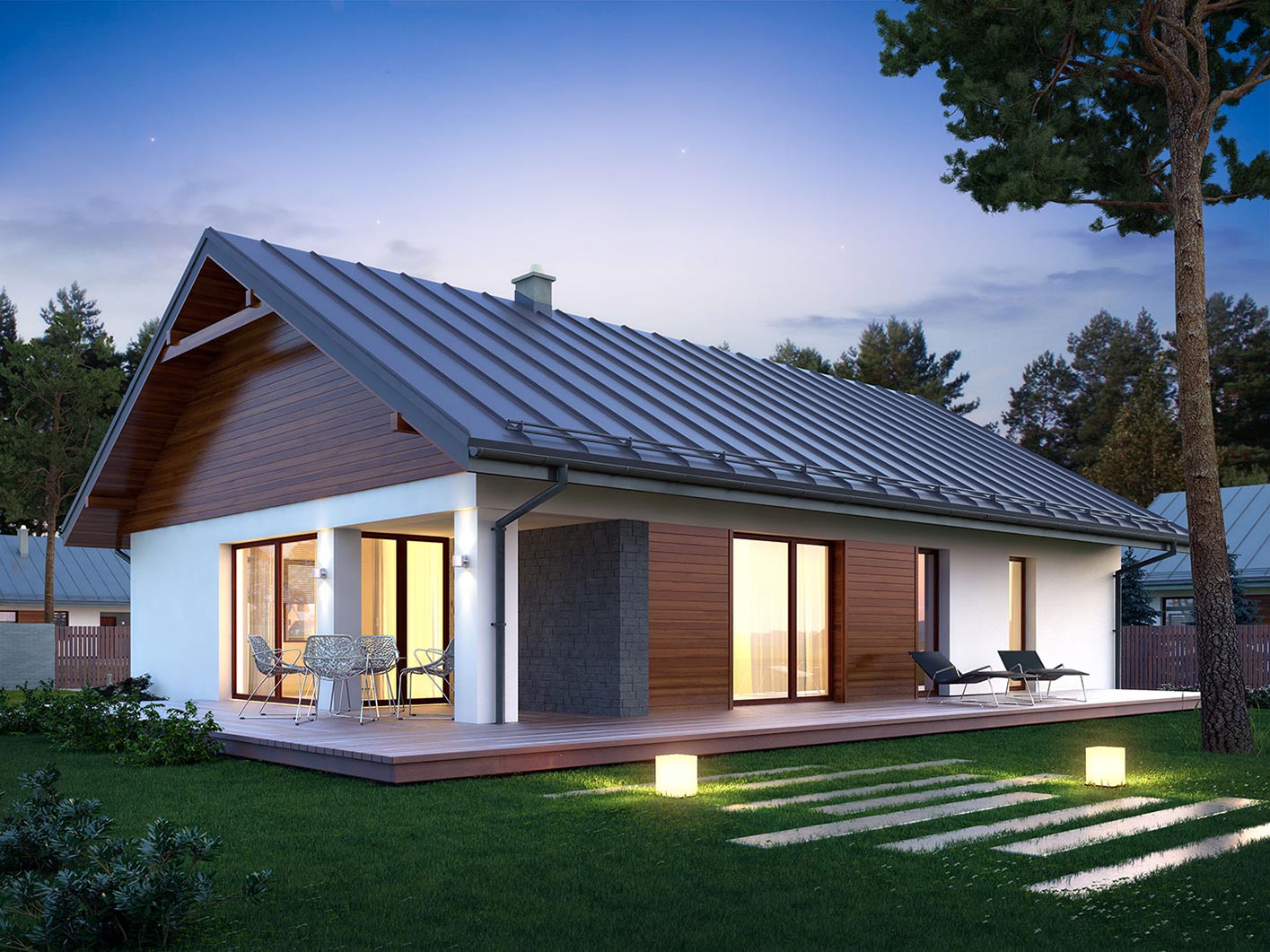 Endo 2 drewniany to funkcjonalny, prosty i ekonomiczny w budowie dom, który stanowi doskonałą propozycję dla osób, które marzą o własnym domu. Ten nowoczesny ale zarazem urokliwy dom mieszkalny w technologii szkieletu drewnianego przeznaczony jest dla 4 osobowej rodziny. Zaletą tego projektu jest jego program funkcjonalny z widocznym podziałem na część dzienną, nocną i gospodarczą. Wnętrze zostało rozplanowane w sposób przemyślany, z dbałością o maksymalne wykorzystanie przestrzeni domu. Część reprezentacyjna, to przestronny salon połączony z jadalnią, który otwiera się na duży, zadaszony taras oraz kuchnia ze spiżarnią. Oprócz części dziennej, przewidziano strefę intymną domu, która składa się z trzech sypialni i łazienki. Dużą kotłownię oraz dwustanowiskowy garaż zaprojektowano w części gospodarczej domu. Wymiary kotłowni umożliwiają montaż kotła na każdy rodzaj paliwa. Dom ten stanowi idealne połączenie tradycyjnej bryły z nowoczesnym elewacjami. Rzut budynku oraz prostota bryły czynią ten dom tanim i prostym w budowie. Jest to świetna propozycja dla osób, które mają na uwadze późniejsze koszty utrzymania domu.