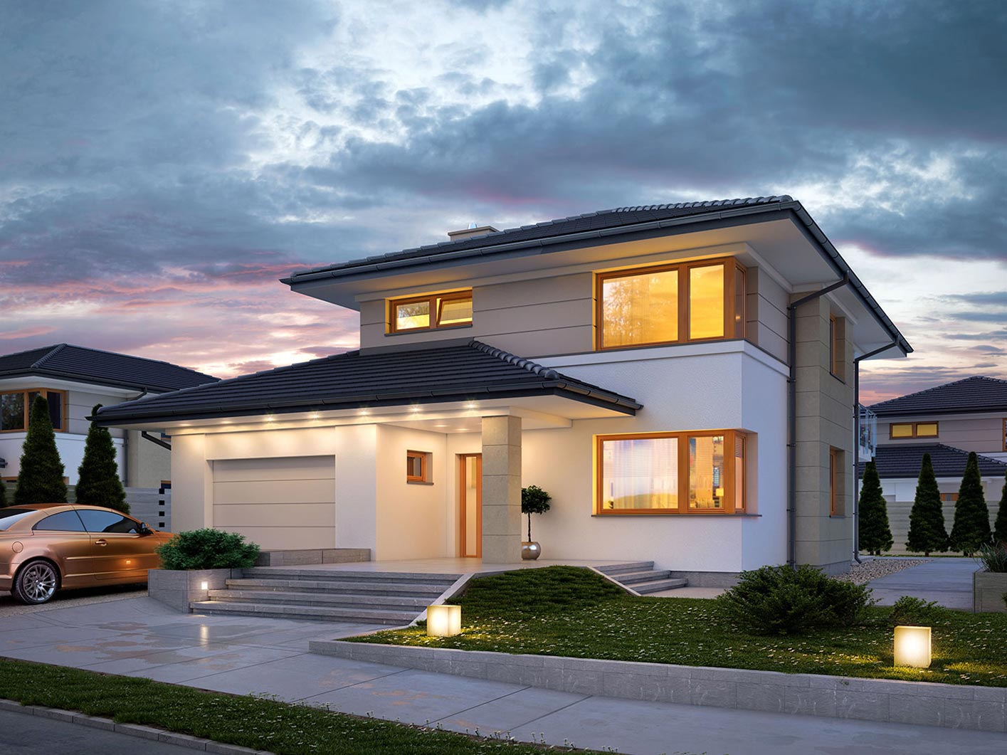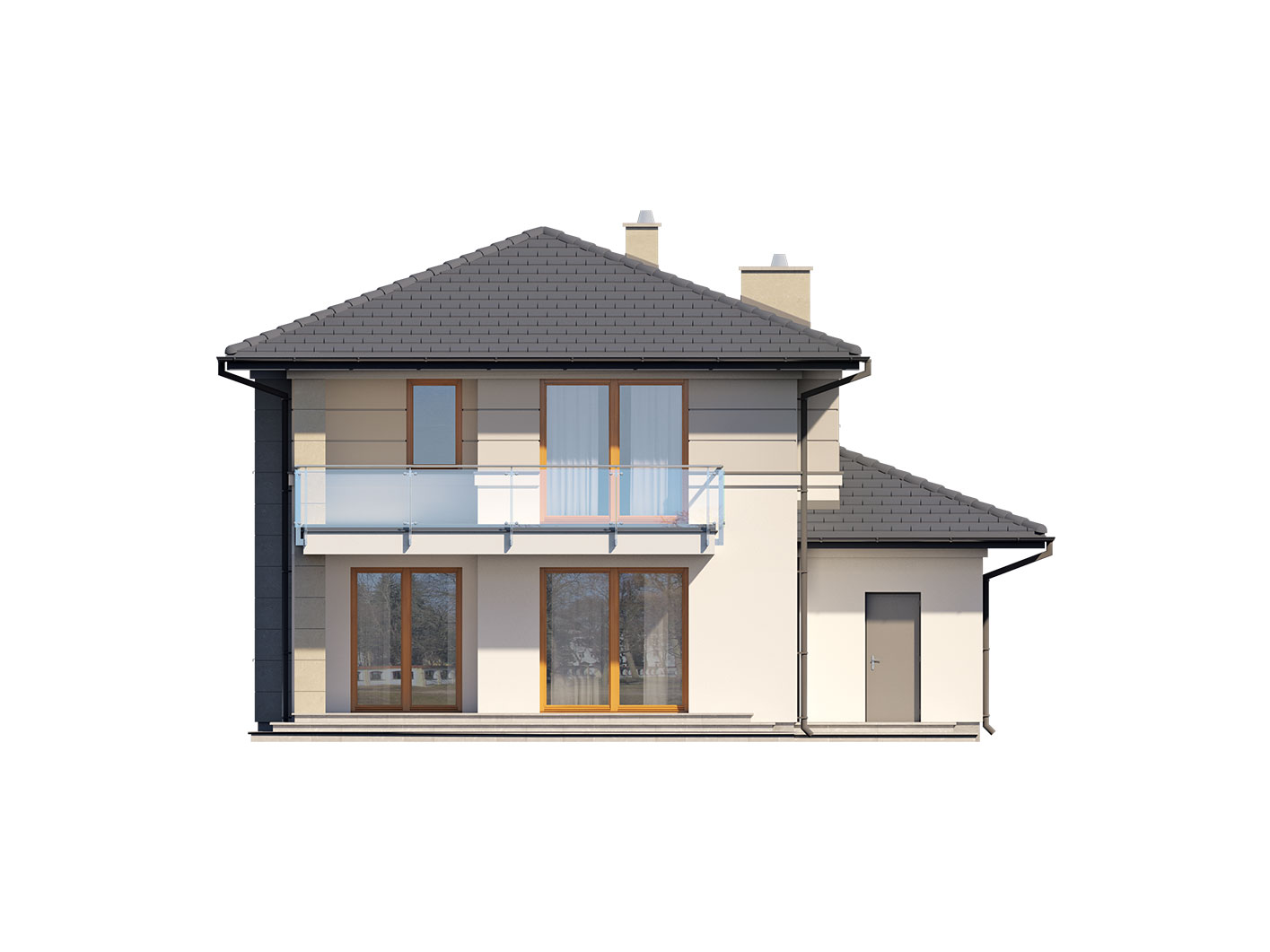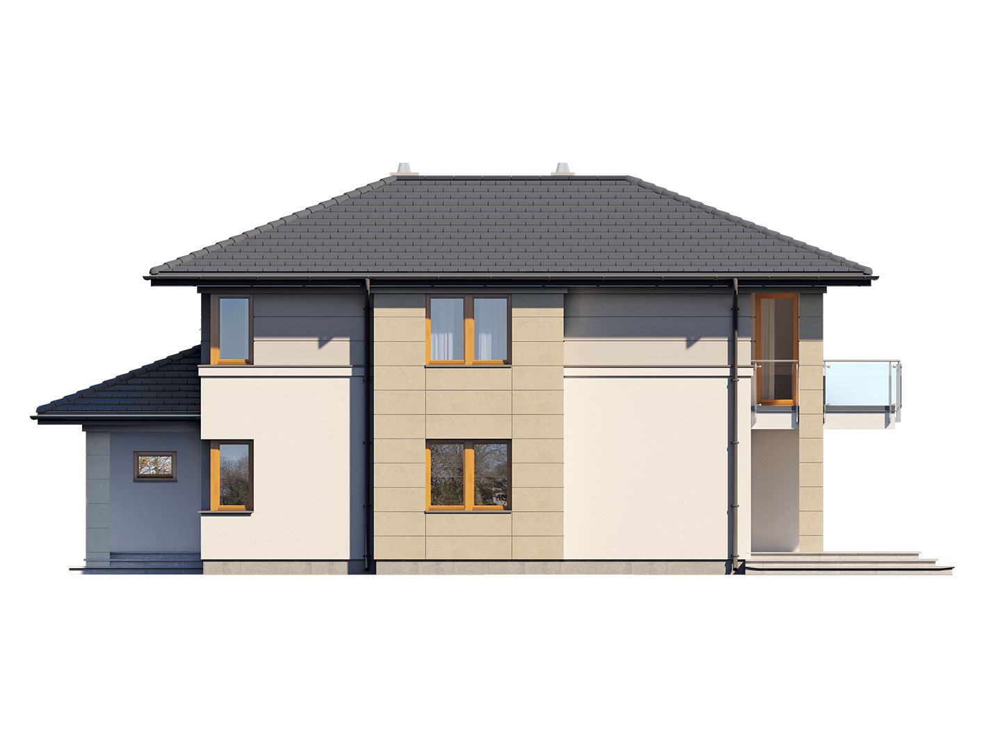 Karat, to projekt nowoczesnego domu piętrowego przeznaczonego dla 4-osobowej rodziny. Jest to typowo miejska rezydencja o reprezentacyjnym wyglądzie i optymalnej powierzchni użytkowej. Posiada bogaty program fukncjonalny, rozłożony na dwóch pełnych kondygnacyjnych, który zapewni komfort nawet dla wymagających inwestorów. Parter zaprojektowano jako otwartą przestrzeń dzienną, złożoną z połączonego salonu, jadalni i kuchni. Przewidziano tutaj także dodatkowy pokój, który można wykorzystać jako gabinet lub dodatkową sypialnię. Na parterze znajduje się również duża kotłownia, na każdy rodzaj paliwa oraz garaż o szerokości 1,5 miejsca postojowego. Na piętrze zaprojektowano 3 sypialnie i łazienkę. Główna sypialnia ma zapewnioną własną garderobę oraz łazienkę. Taką dodatkową przestrzeń można według potrzeb przerobić np. na kącik do pracy. Karat zachwyca ciekawą, ponadczasową, klasyczną bryłą ujętą we współczesny elegancki wizerunek. Rezydencja ta stanowi doskonałą propozycję dla inwestorów poszukujących komfortowego domu w estetycznym wydaniu.