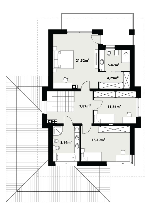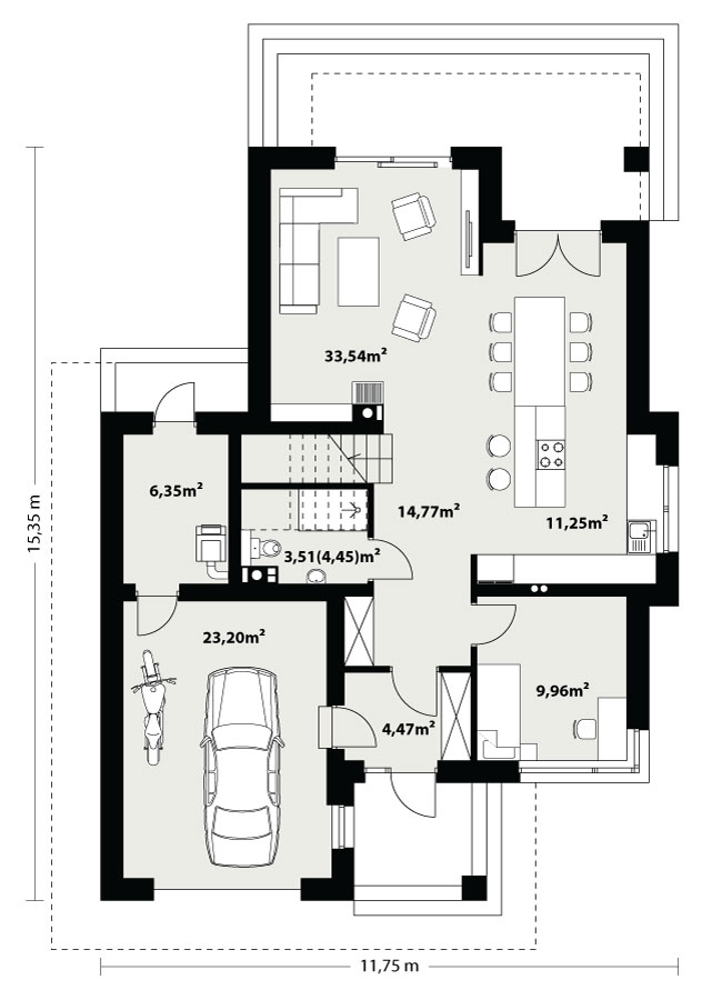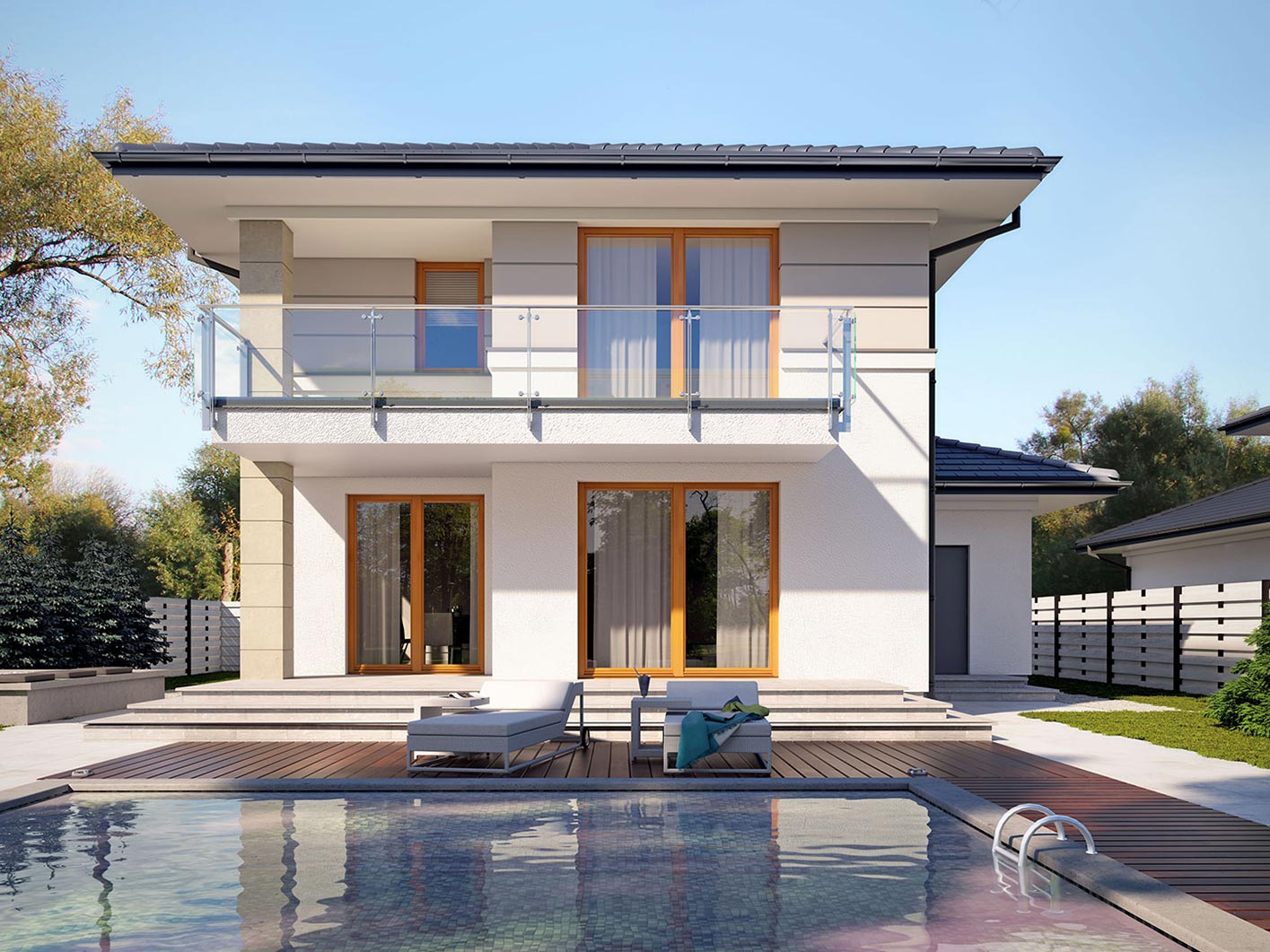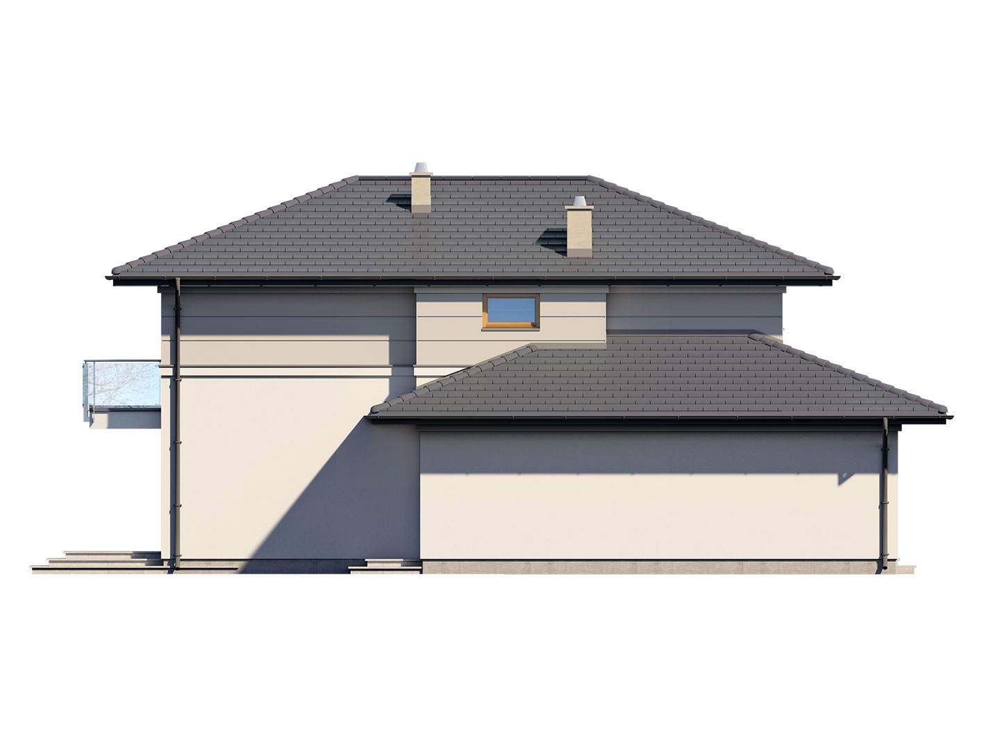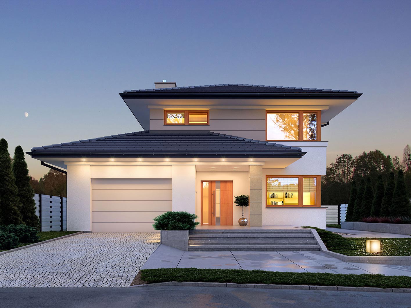 Karat, to projekt nowoczesnego domu piętrowego przeznaczonego dla 4-osobowej rodziny. Jest to typowo miejska rezydencja o reprezentacyjnym wyglądzie i optymalnej powierzchni użytkowej. Posiada bogaty program fukncjonalny, rozłożony na dwóch pełnych kondygnacyjnych, który zapewni komfort nawet dla wymagających inwestorów. Parter zaprojektowano jako otwartą przestrzeń dzienną, złożoną z połączonego salonu, jadalni i kuchni. Przewidziano tutaj także dodatkowy pokój, który można wykorzystać jako gabinet lub dodatkową sypialnię. Na parterze znajduje się również duża kotłownia, na każdy rodzaj paliwa oraz garaż o szerokości 1,5 miejsca postojowego. Na piętrze zaprojektowano 3 sypialnie i łazienkę. Główna sypialnia ma zapewnioną własną garderobę oraz łazienkę. Taką dodatkową przestrzeń można według potrzeb przerobić np. na kącik do pracy. Karat zachwyca ciekawą, ponadczasową, klasyczną bryłą ujętą we współczesny elegancki wizerunek. Rezydencja ta stanowi doskonałą propozycję dla inwestorów poszukujących komfortowego domu w estetycznym wydaniu.