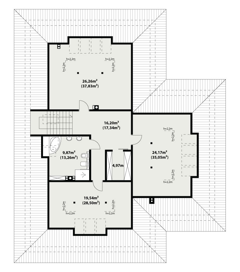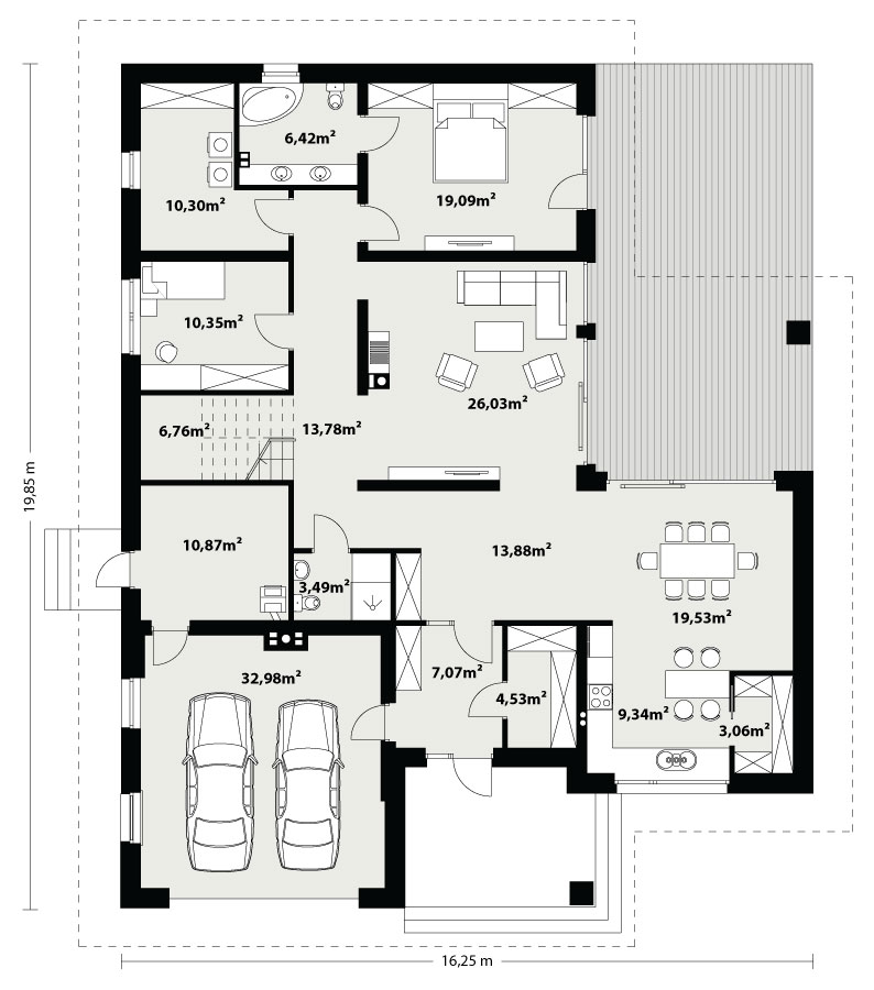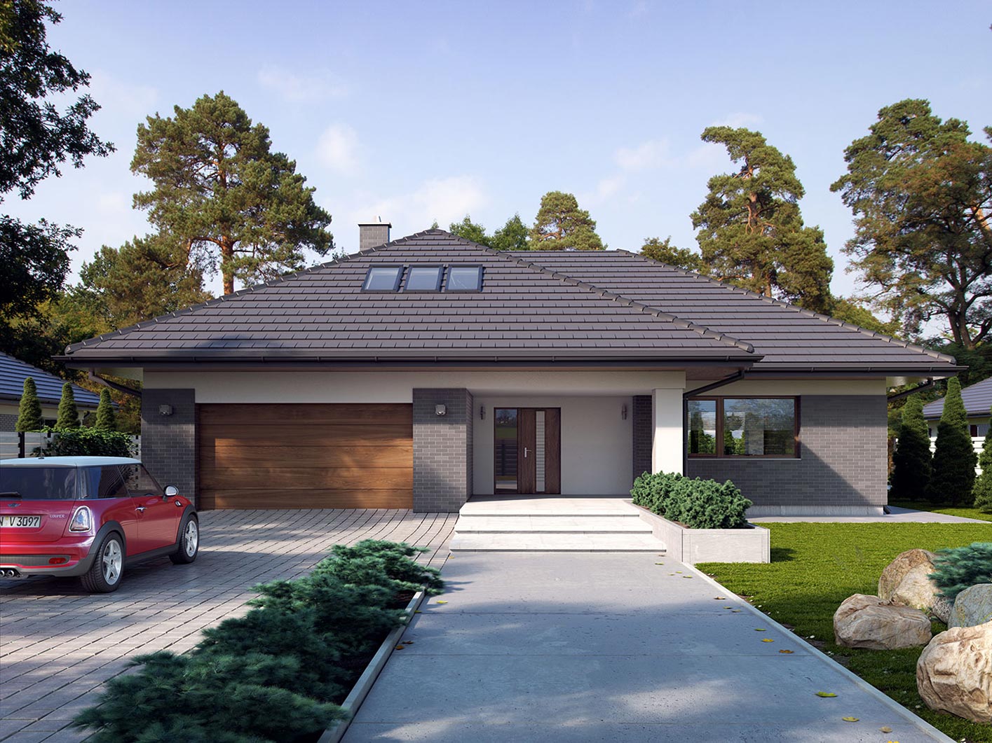 Goran 2 to jednorodzinny budynek mieszkalny, parterowy z użytkowym poddaszem, niepodpiwniczony z dwustanowiskowym garażem. Bardzo bogaty i funkcjonany układ pomieszczeń gwarantuje optymalny komfort wieloosobowej rodzinie. Wyraźnie podzielona i ergonomicznie zaprojektowana przestrzeń mieszkalna składa się ze strefy dziennej, nocnej i gospodarczej. Najbardziej reprezentacyjna część domu, to przestronny salon, który otwiera się na duży, zadaszony taras oraz kuchnia ze spiżarnią połączona bezpośrednio z dużą jadalnią. Oprócz części dziennej, przewidziano strefę intymną domu, która składa się na parterze z dwóch sypialni i łazienki oraz na poddaszu z trzech sypialni, łazienki i garderoby. Dużą kotłownię oraz garaż zlokalizowano w części gospodarczej domu. Wymiary kotłowni umożliwiają montaż kotła na każdy rodzaj paliwa. Geometria rzutu, harmonia bryły oraz prostota elewacji czynią ten dom nie tylko łatwym w eksploatacji i utrzymaniu, ale również niezwykle eleganckim.